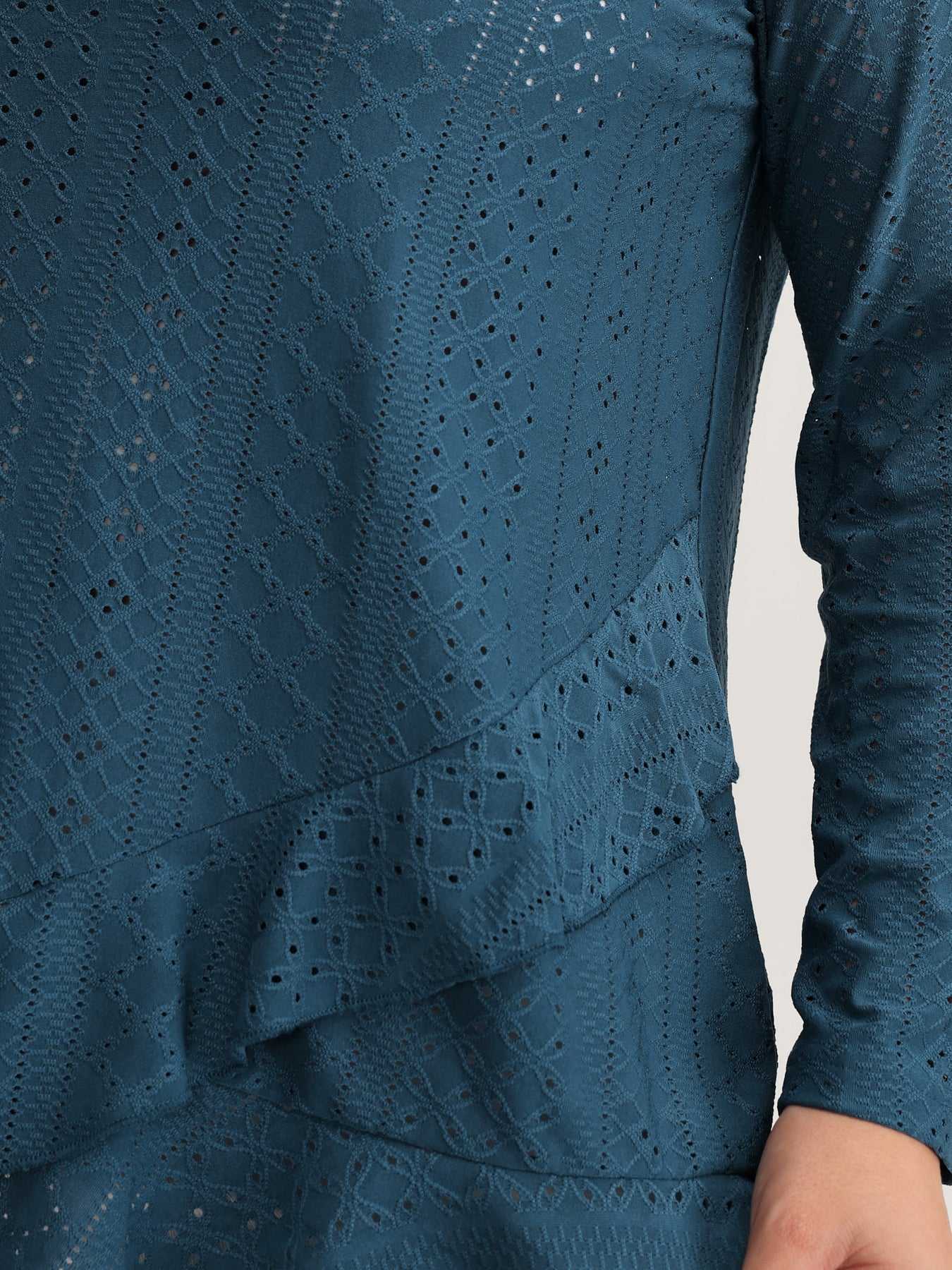Eyelet Trim Overlap Ruffled Hem T-Shirt
