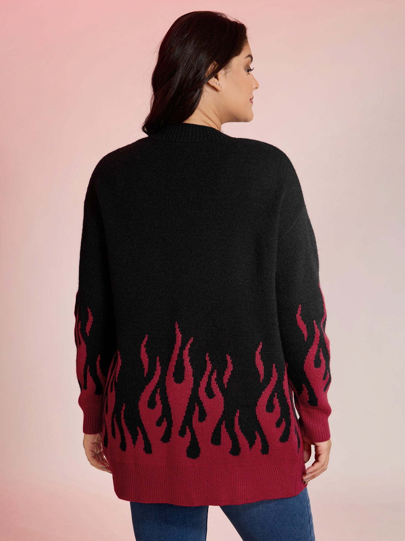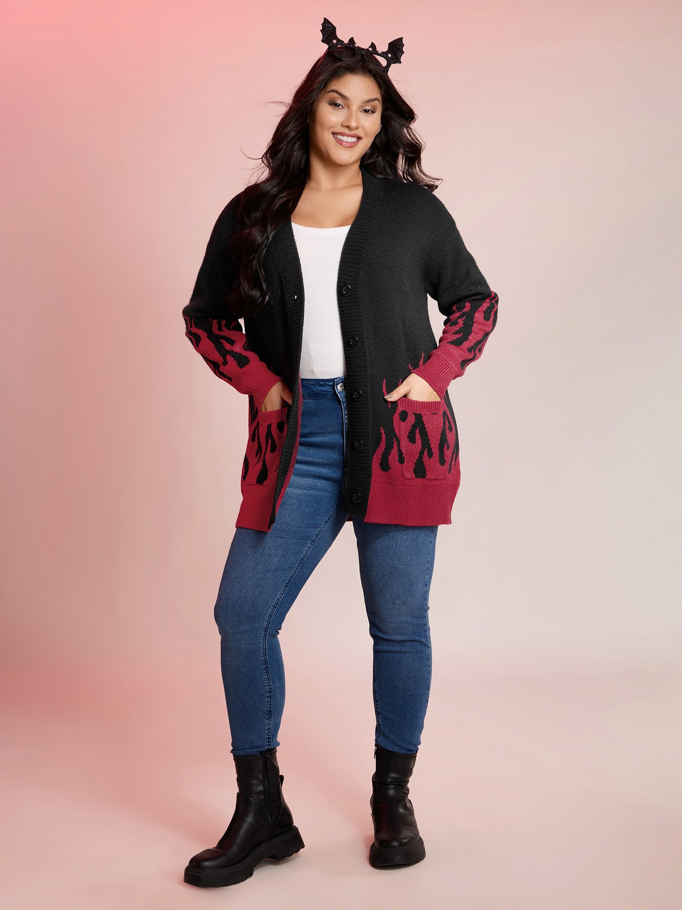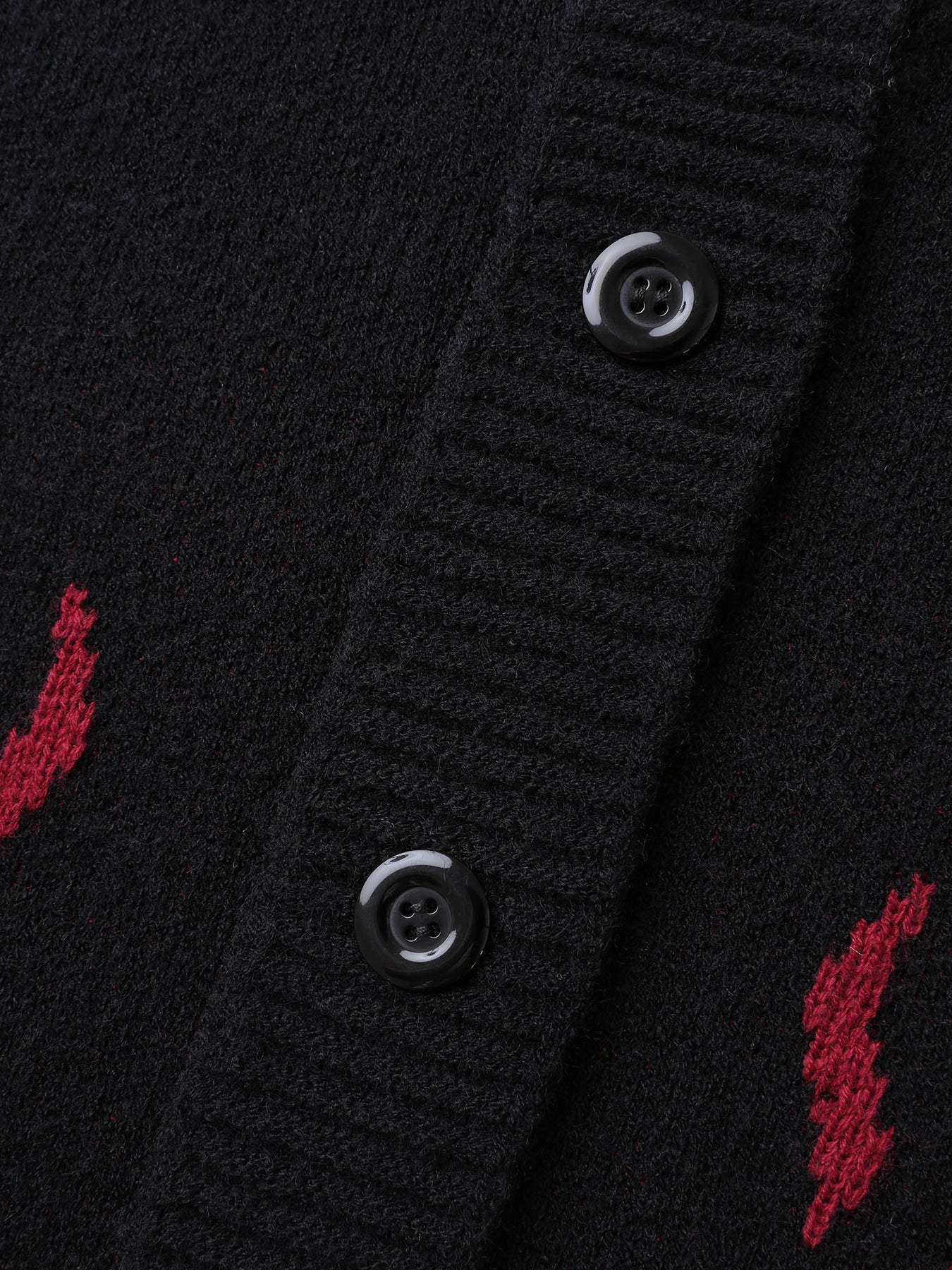 Flame Pattern Ribbed Hem Pockets Knit Cardigan