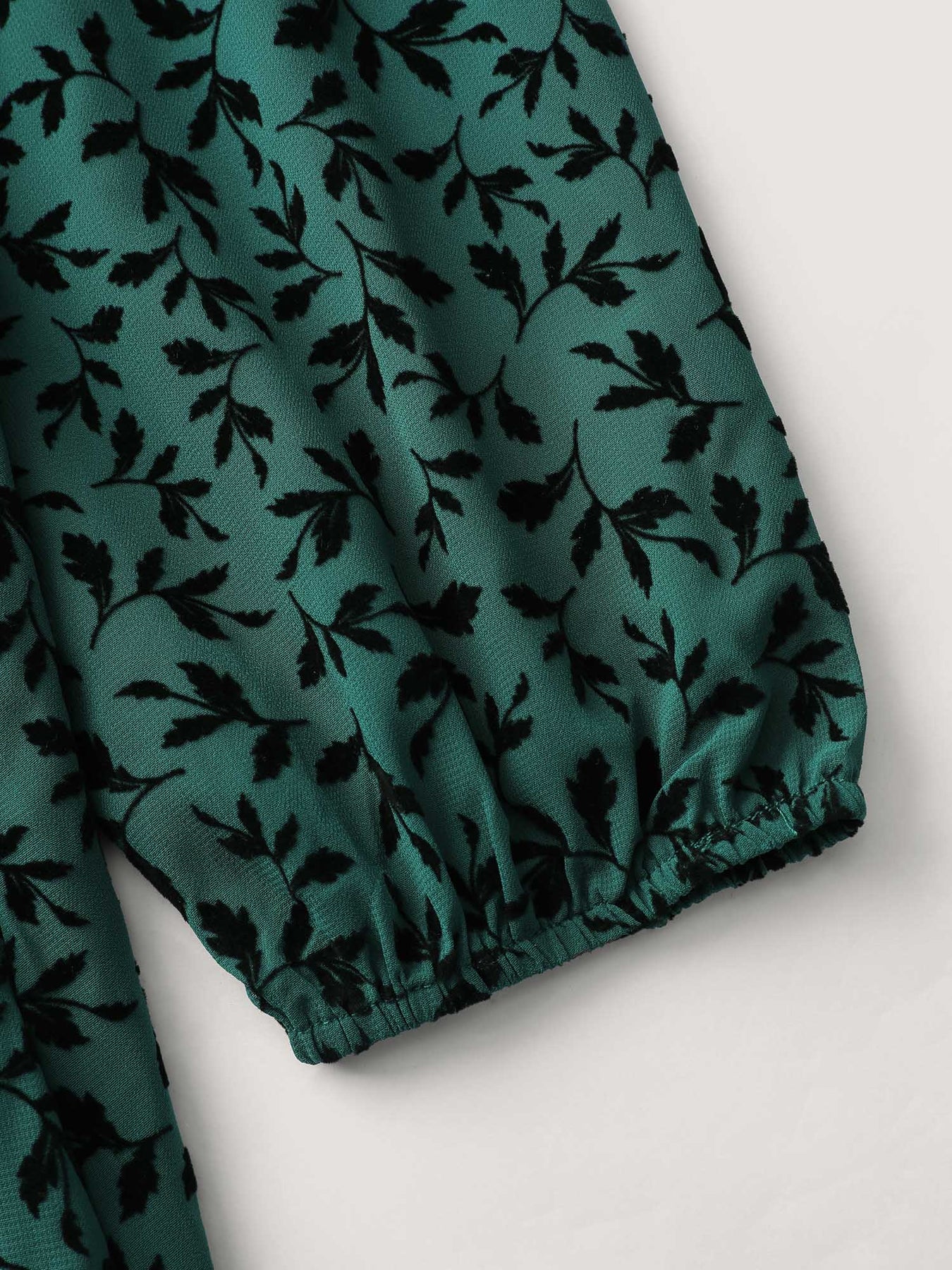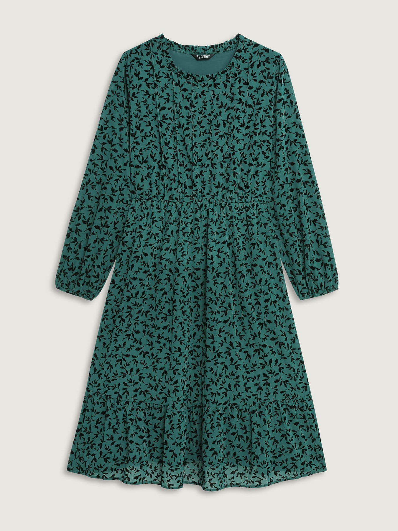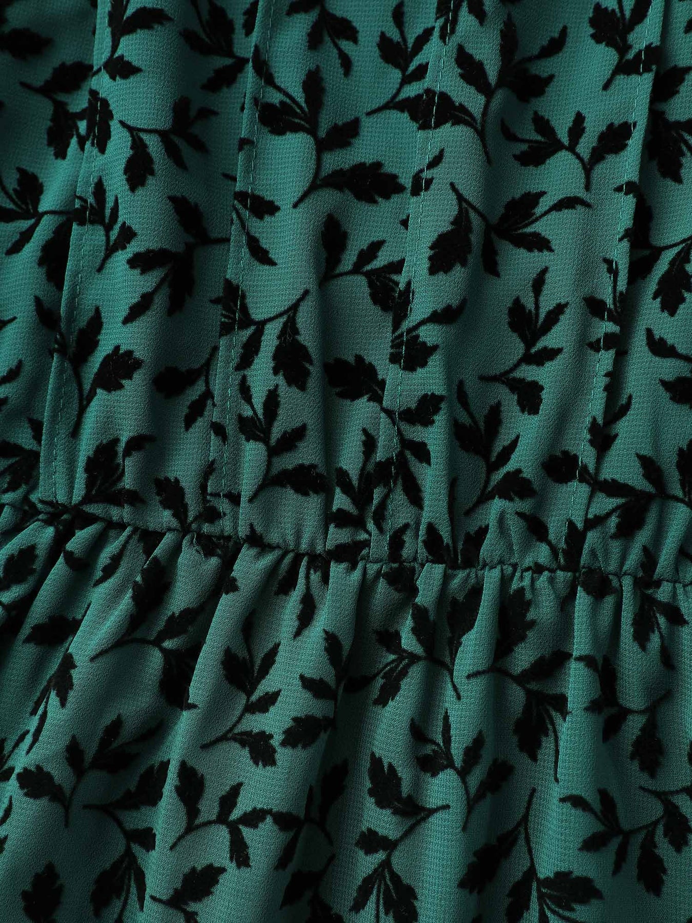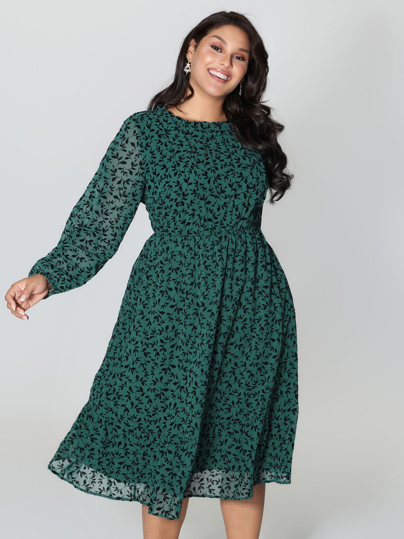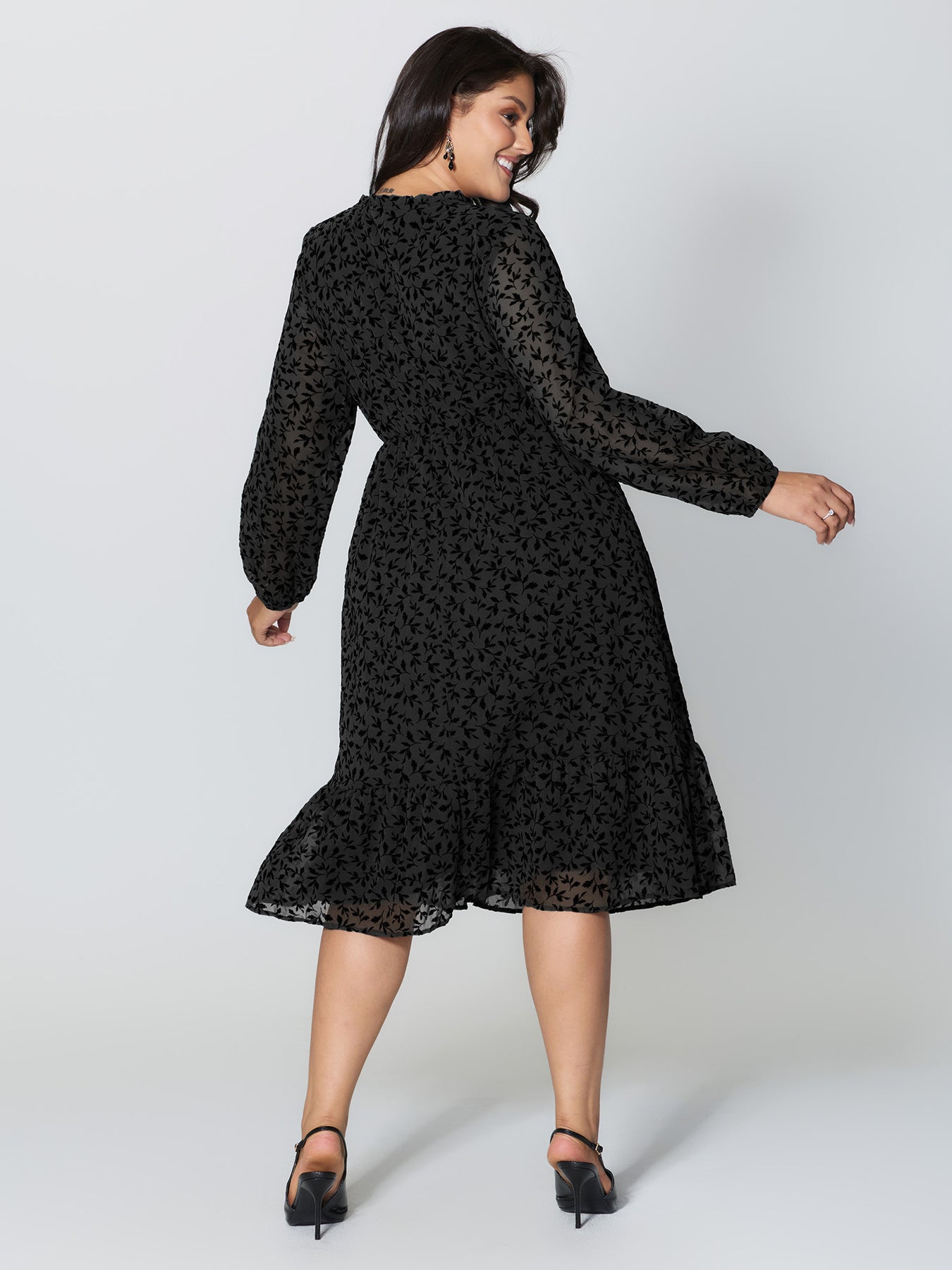 Flocked Floral Shirred Ruffled Neck Midi Dress