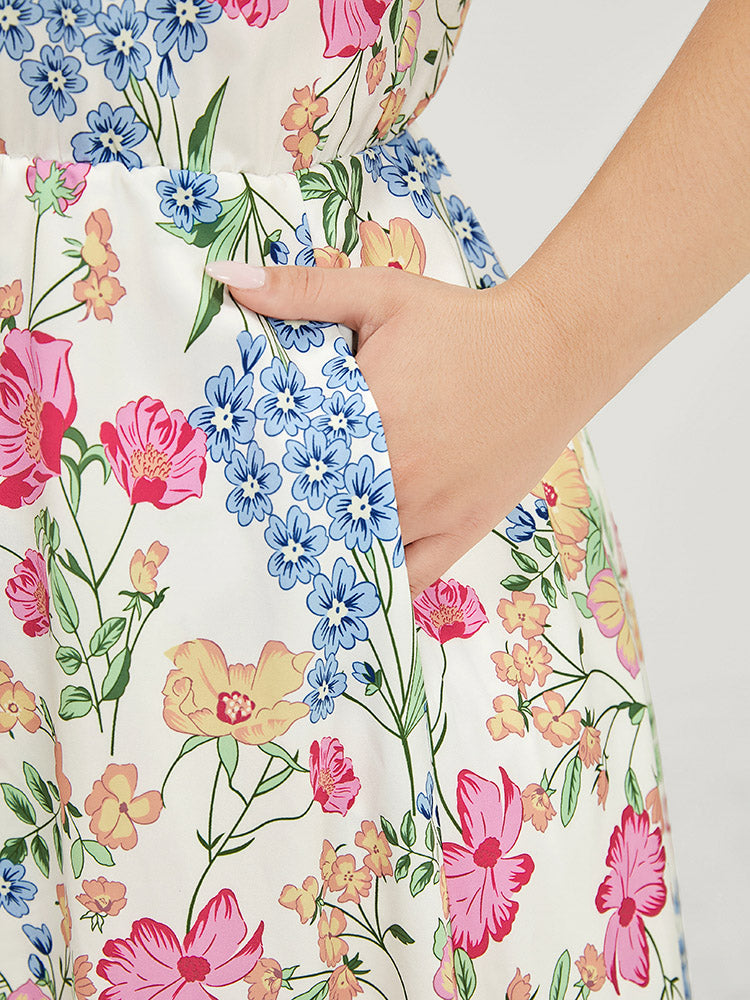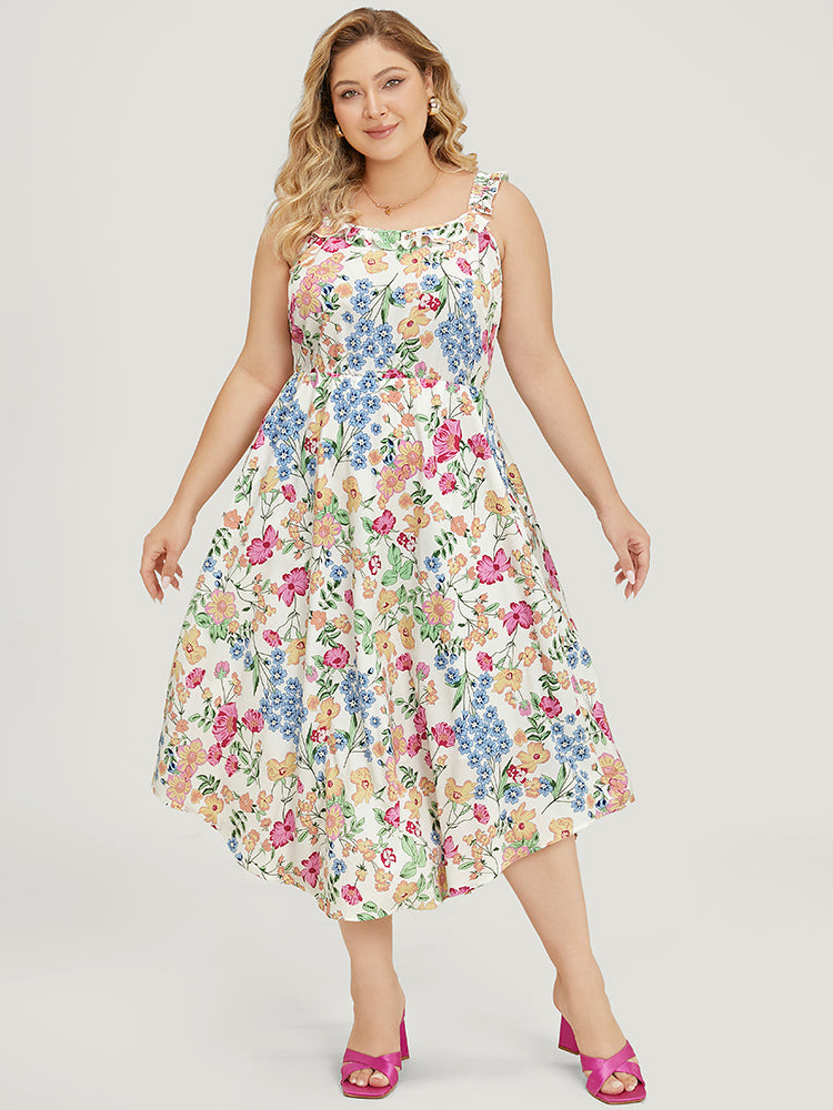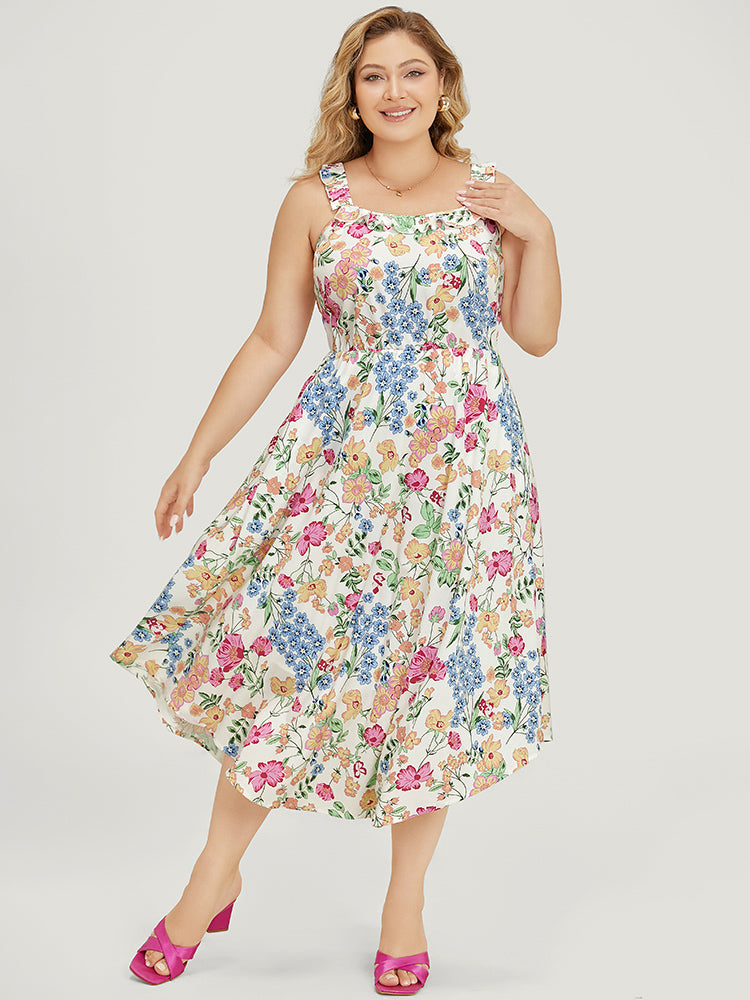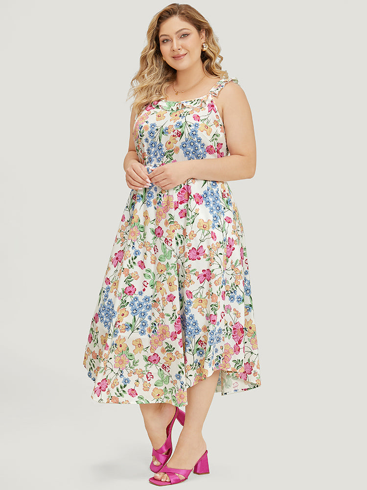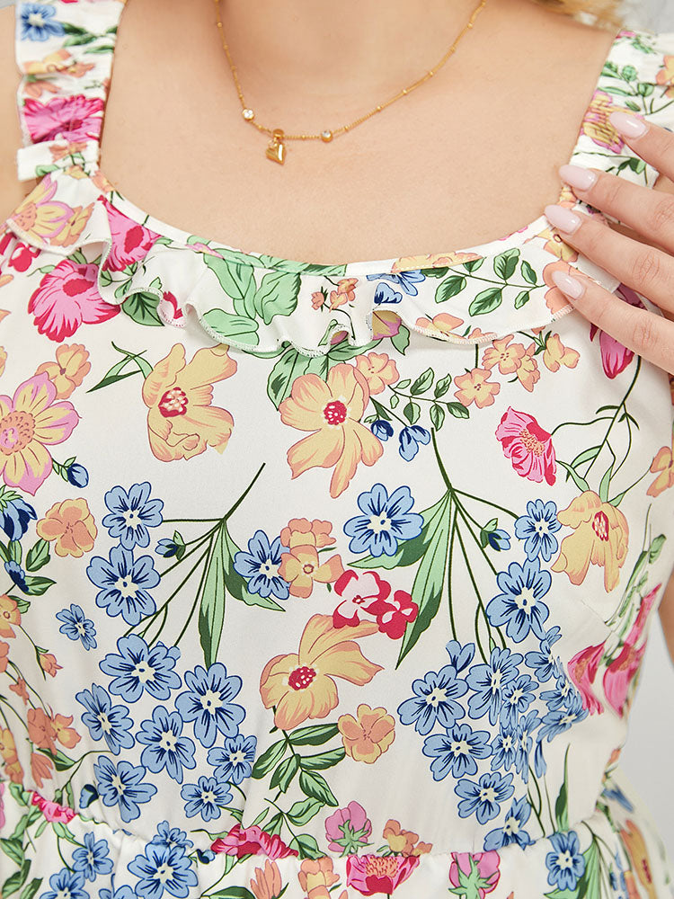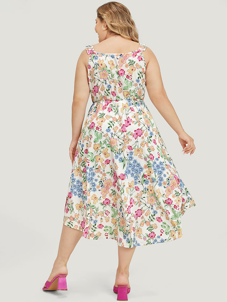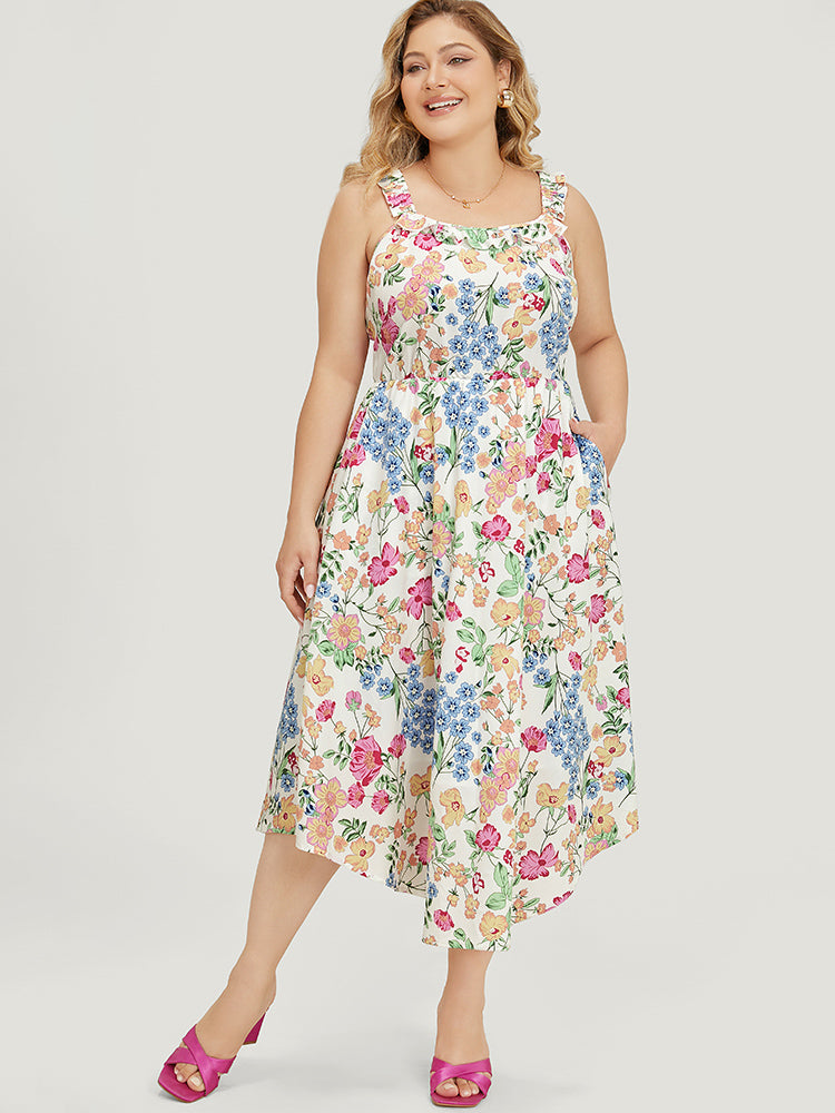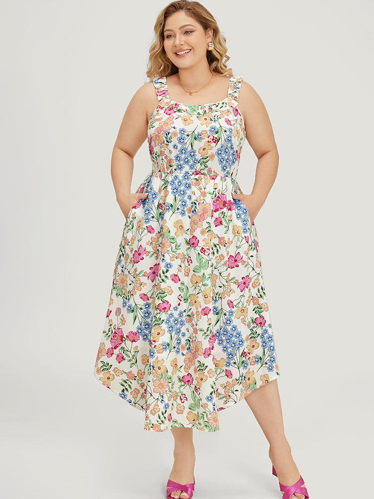 Floral Arc Hem Pocket Square Neck Ruffle Trim Cami Dress