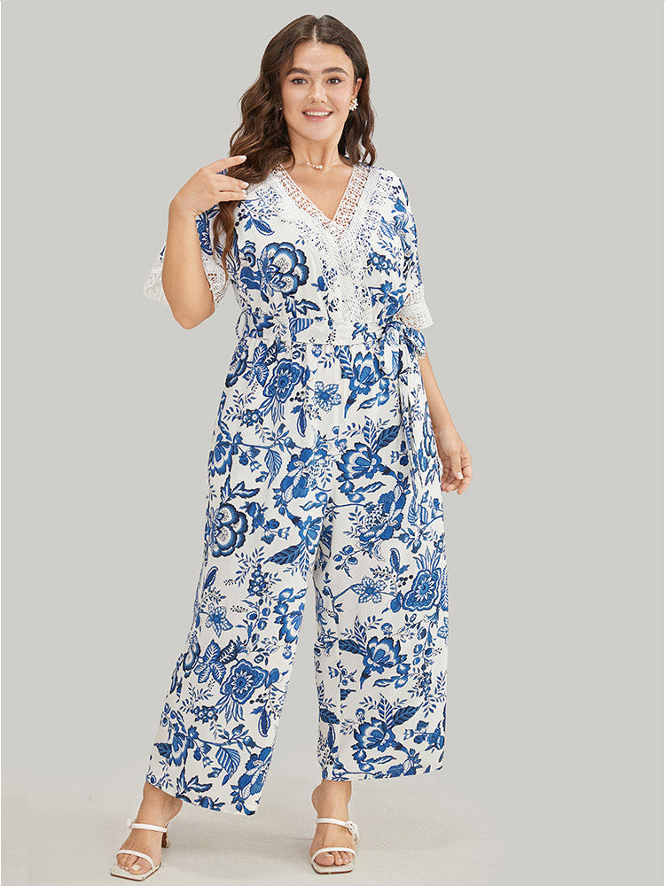Floral Belted Pocket Lace Trim Wrap Jumpsuit