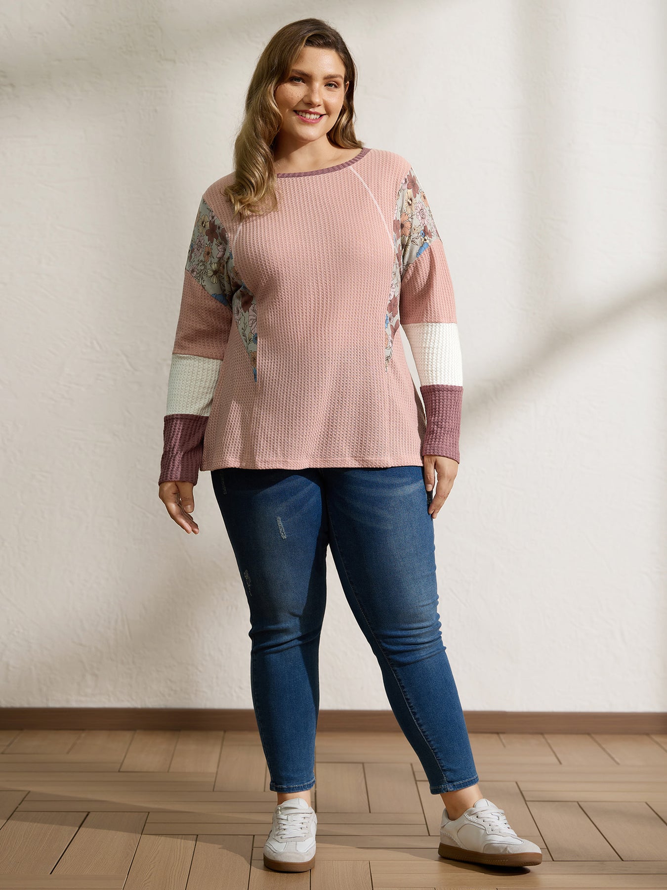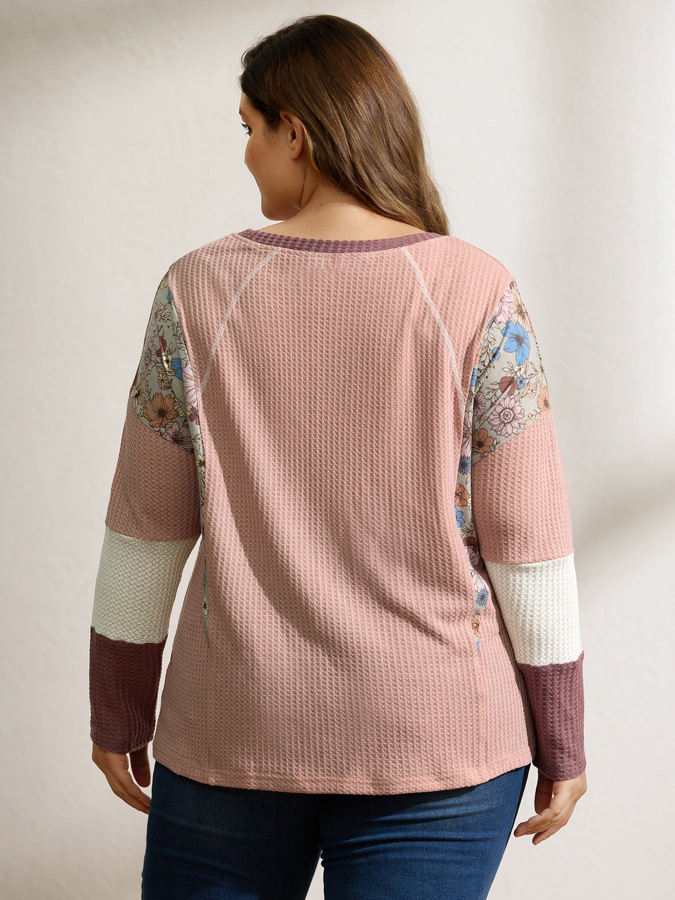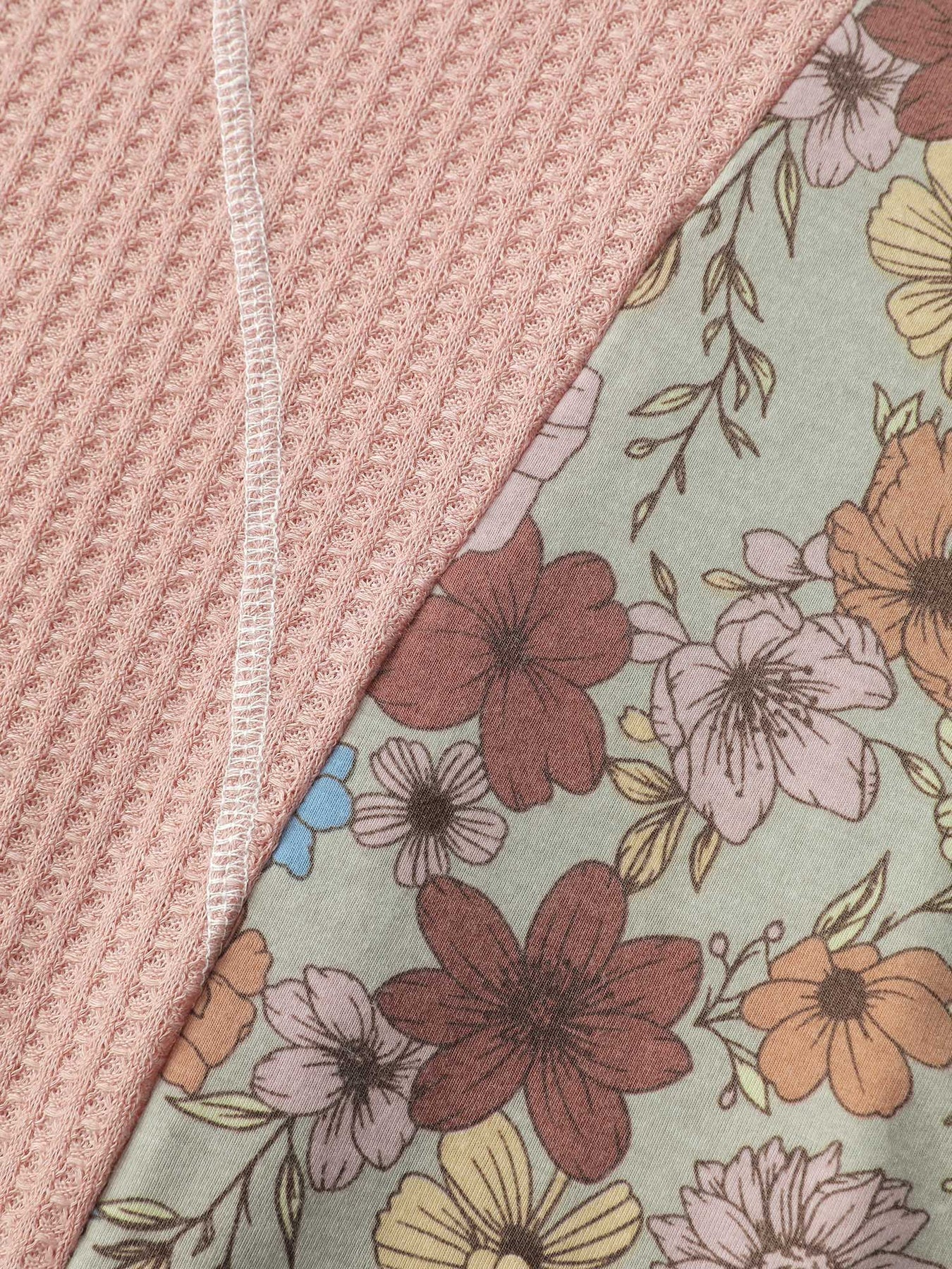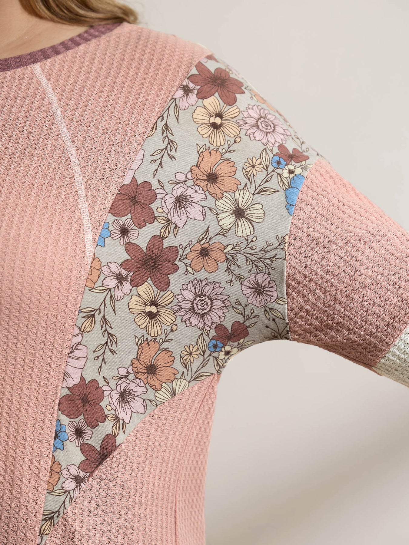 Floral Colorblock Waffle Round Neck Sweatshirt