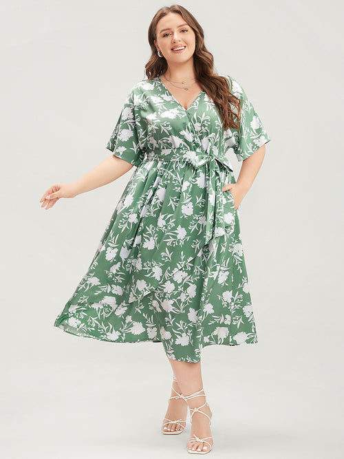 Floral Dolman Sleeve Pocket Belted Wrap Asymmetrical Flutter Dress