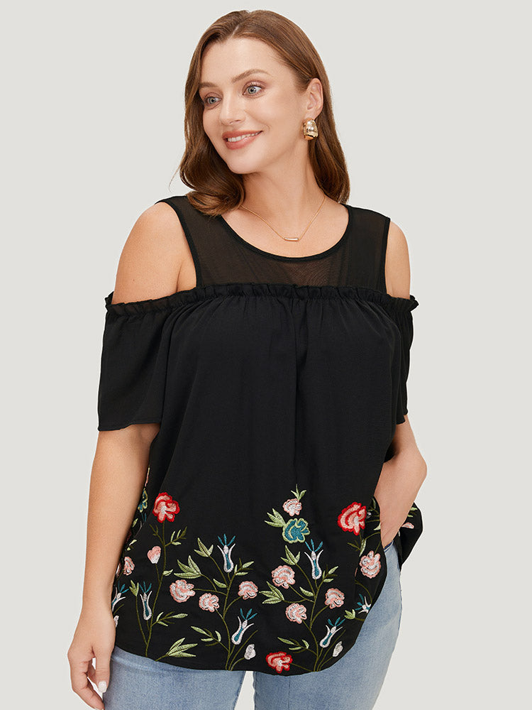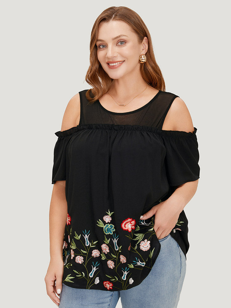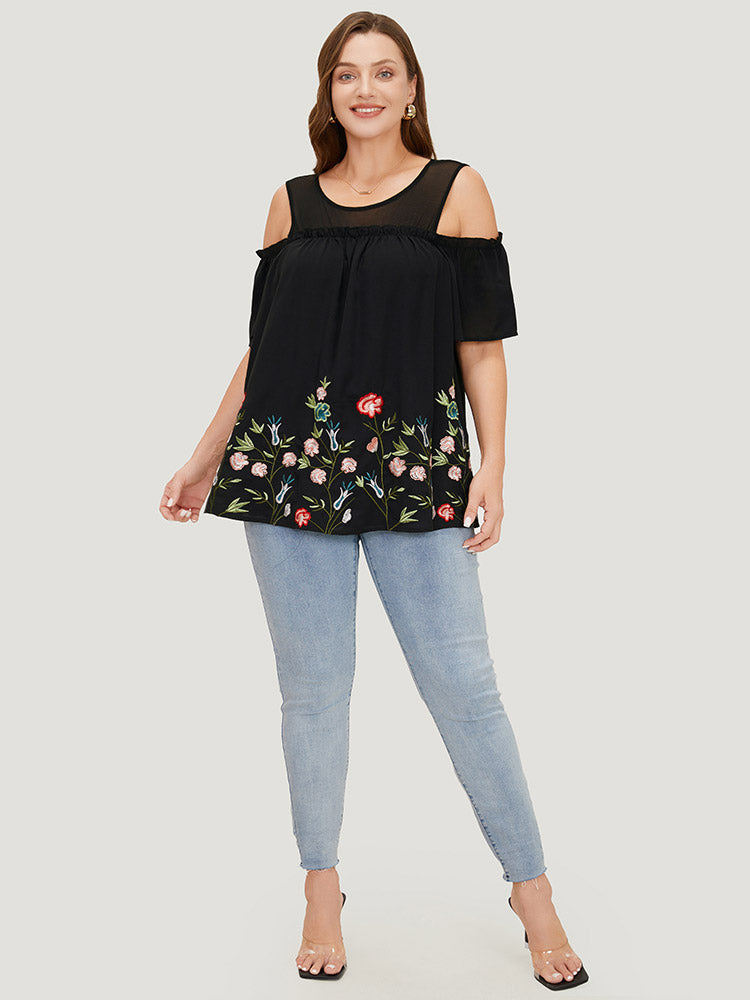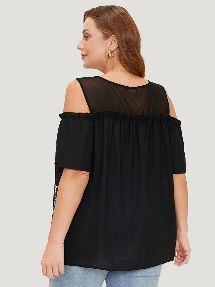 Floral Embroidered Frill Trim Cold Shoulder Blouse