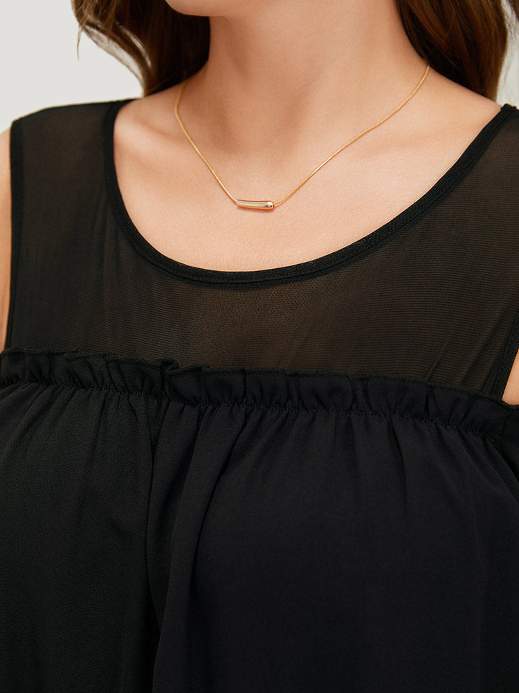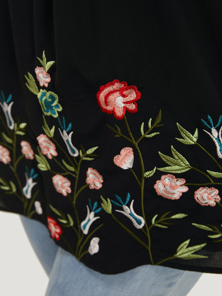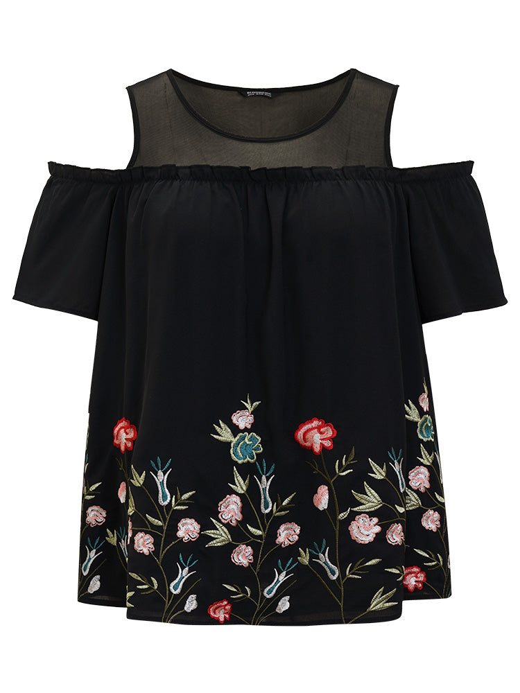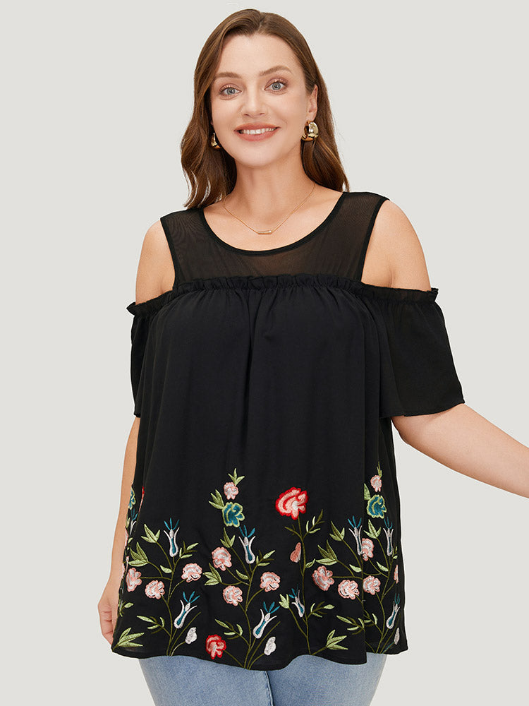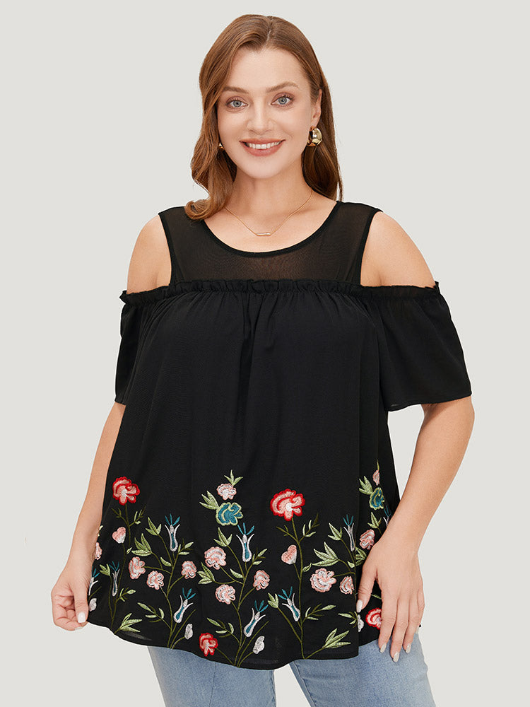 Floral Embroidered Frill Trim Cold Shoulder Blouse