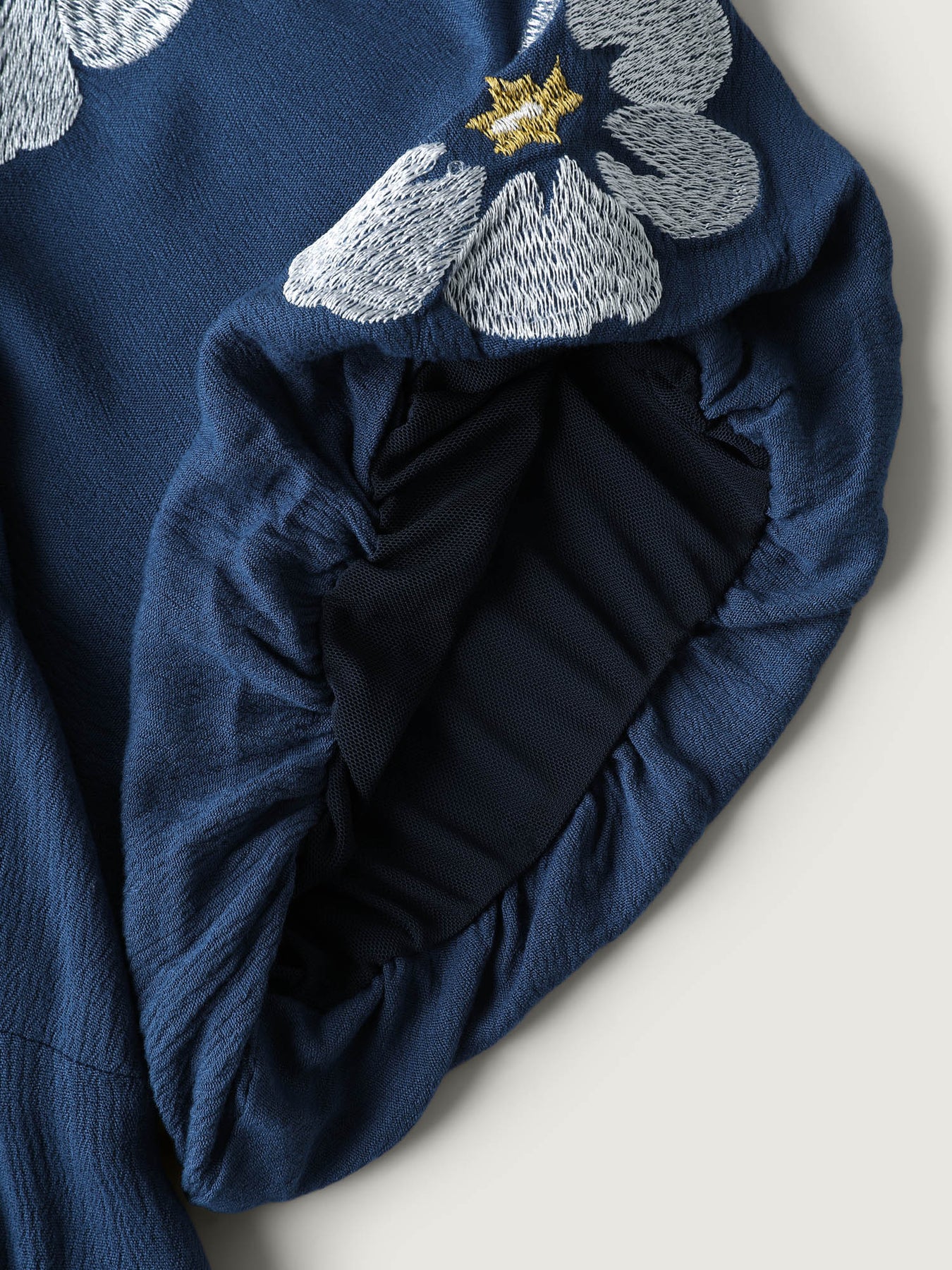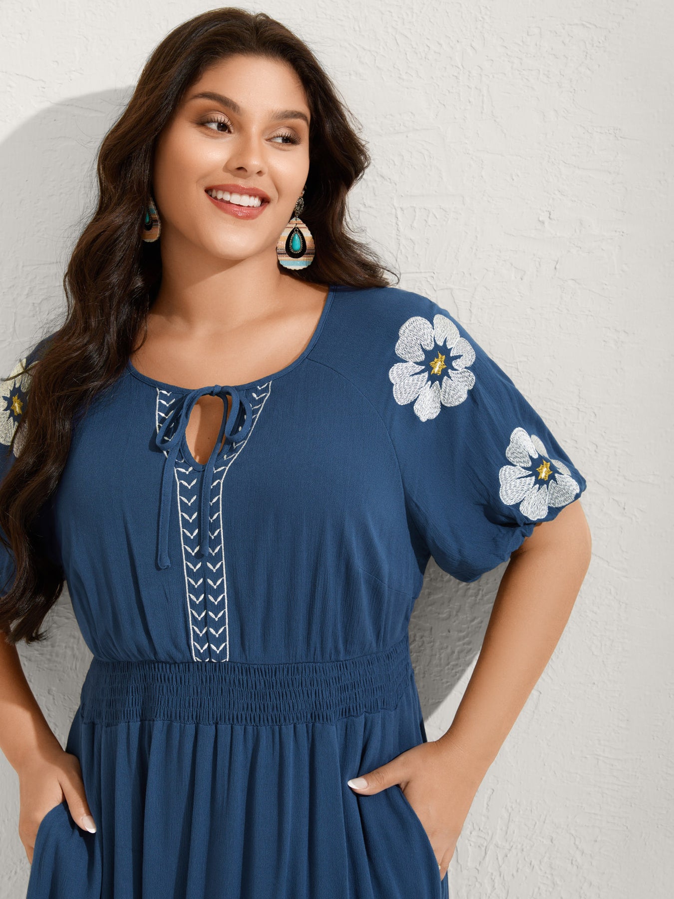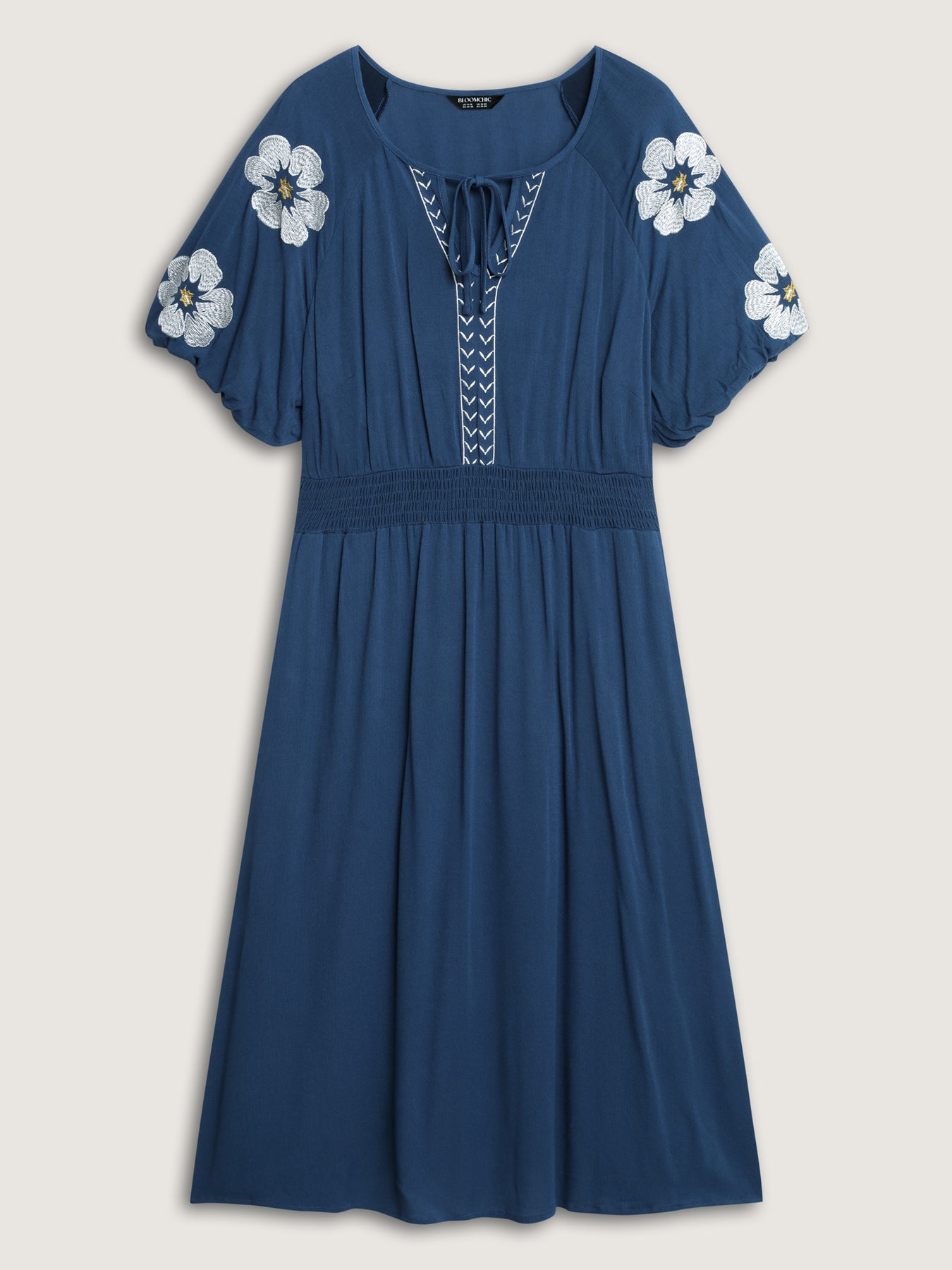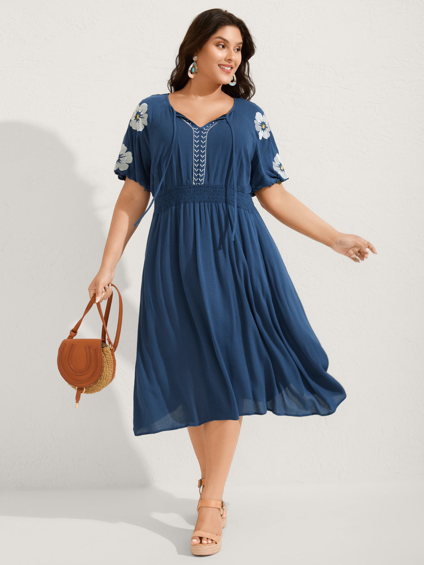 Floral Embroidered Shirred Waist Midi Dress