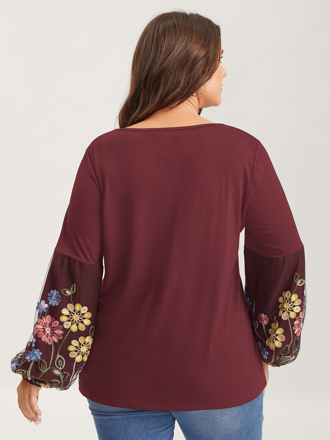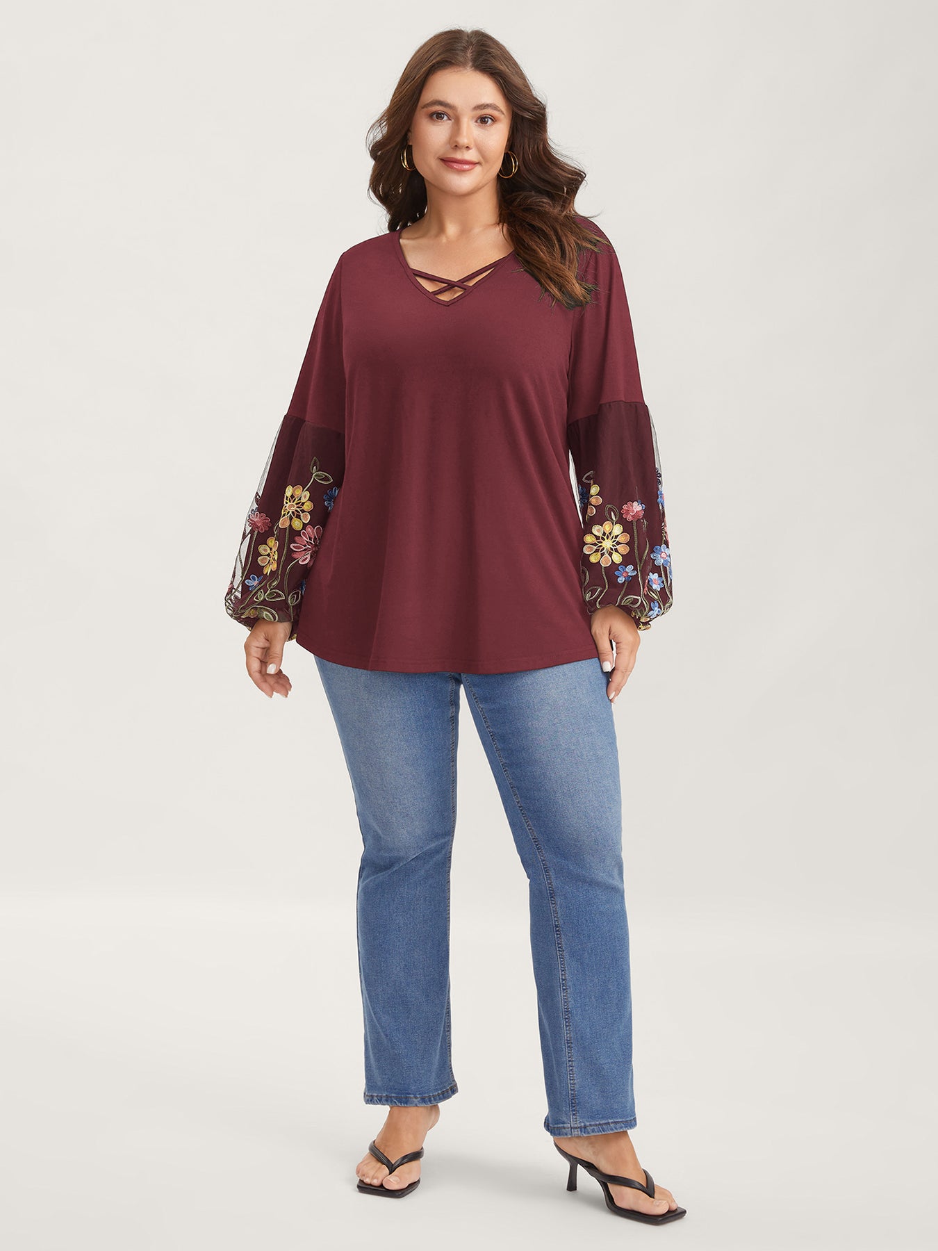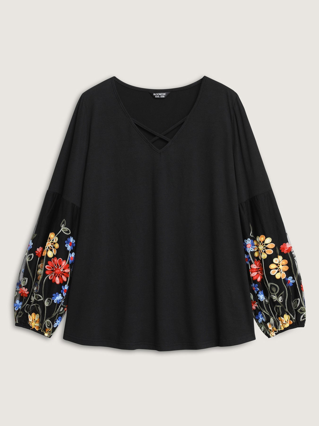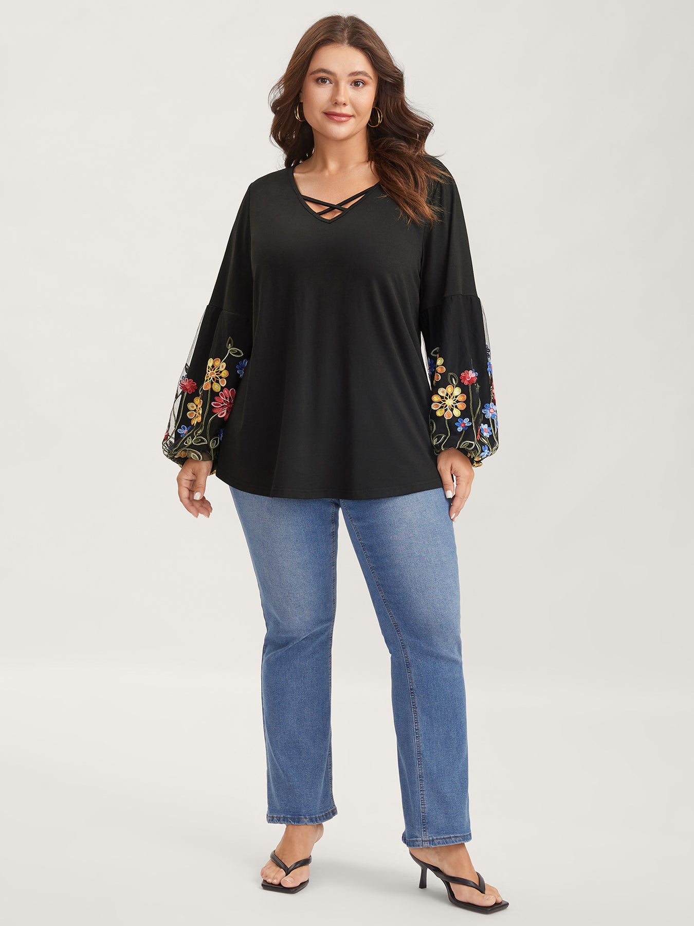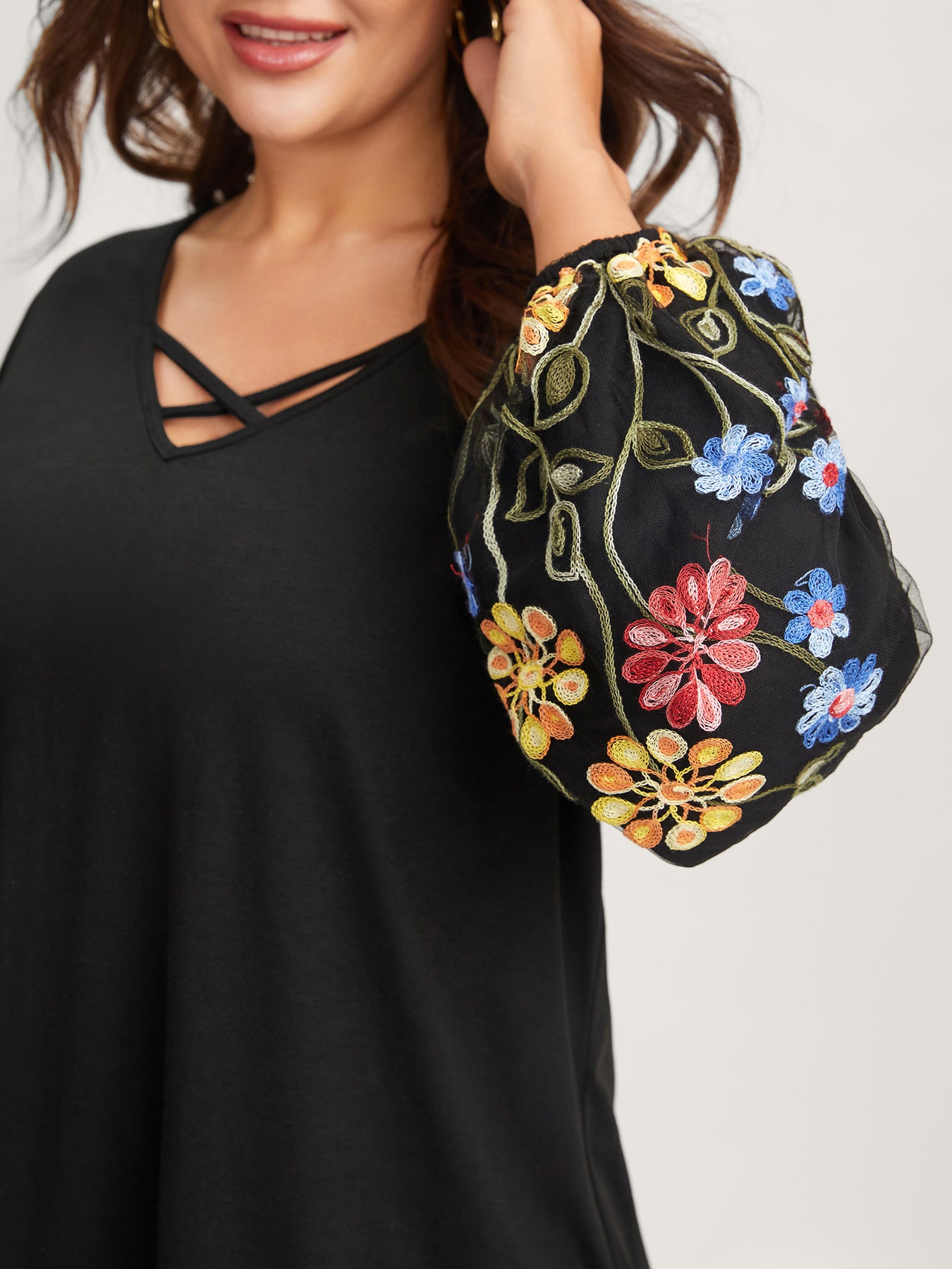 Floral Embroidered Sleeve Neck Tie-Up T-Shirt
