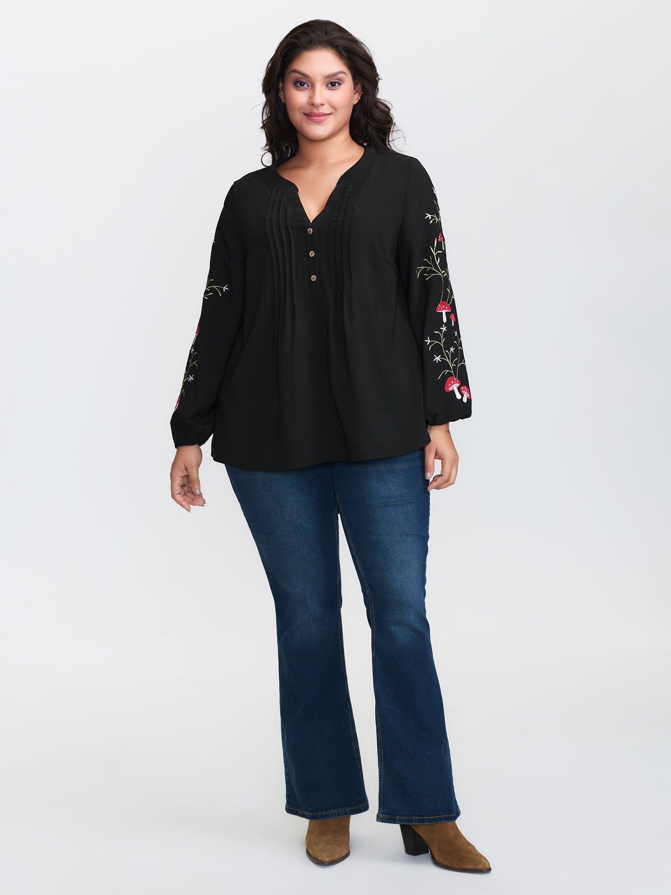 Floral Embroidery Toothpick Pleats Blouse