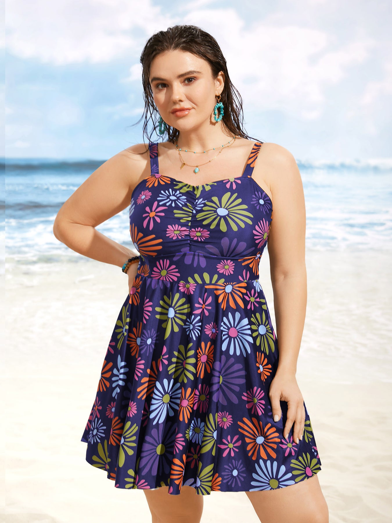 Floral Heart Neckline Ruched Swim Dress