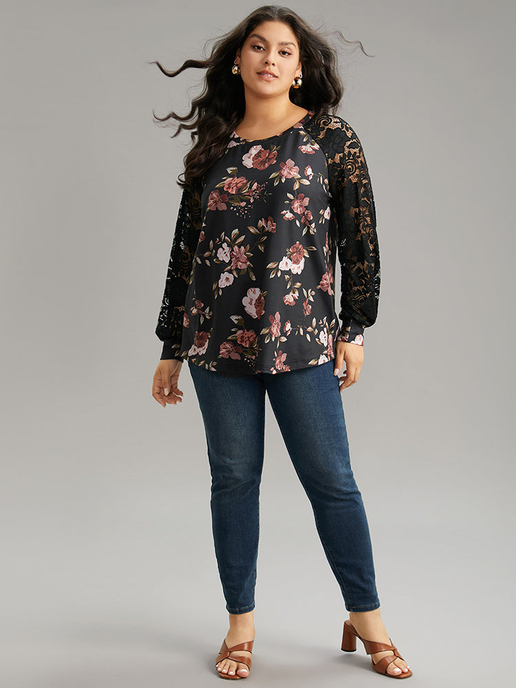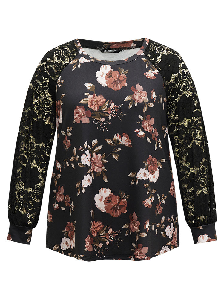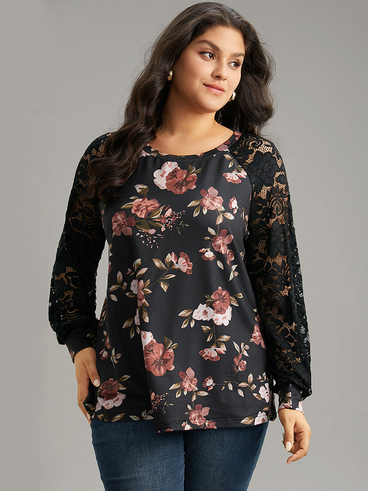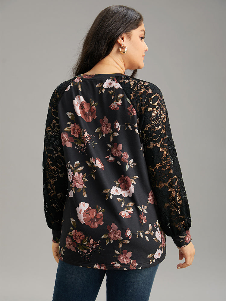 Floral Lace Panel Raglan Sleeve Sweatshirt