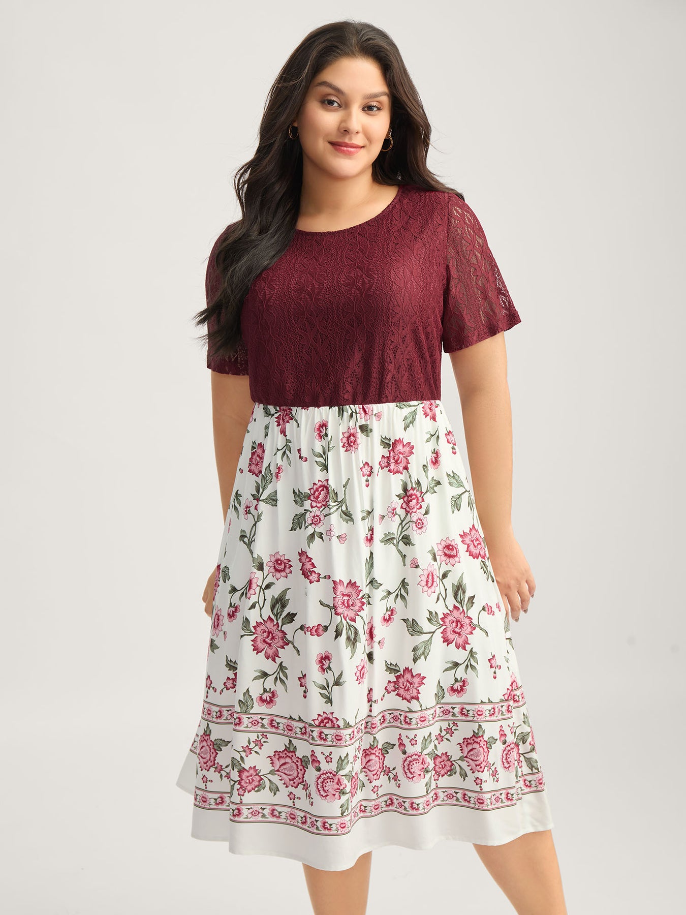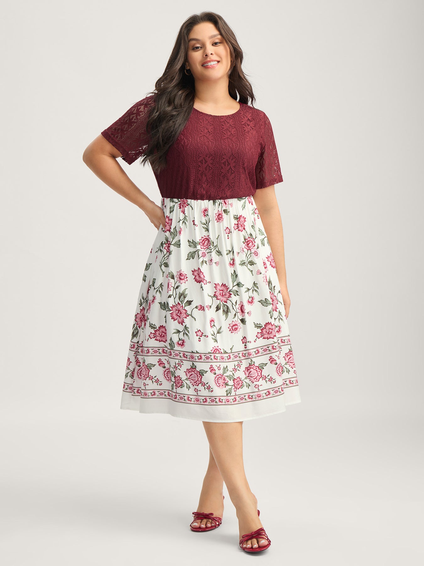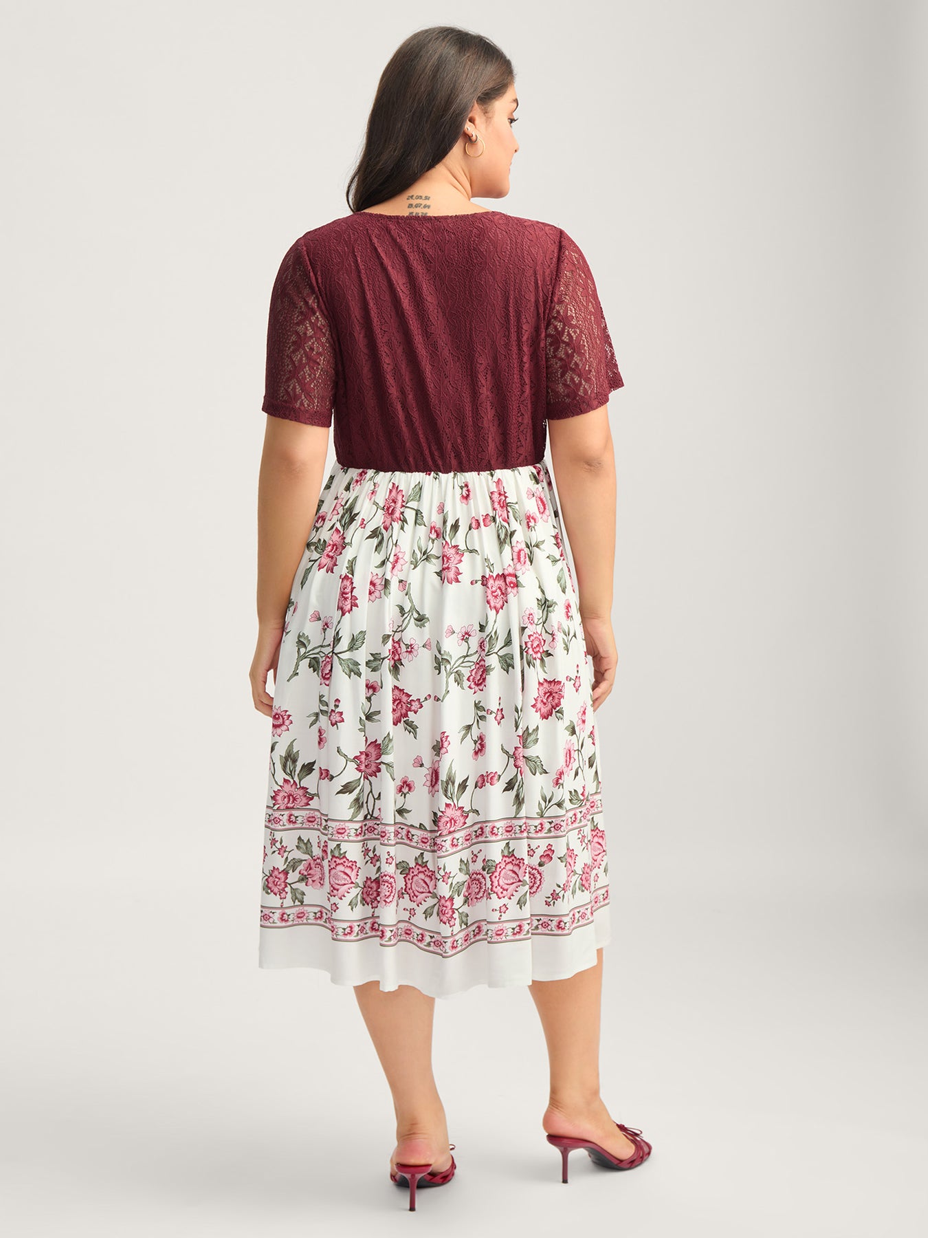 Floral Lace Stretchy Waist Contrast Midi Dress