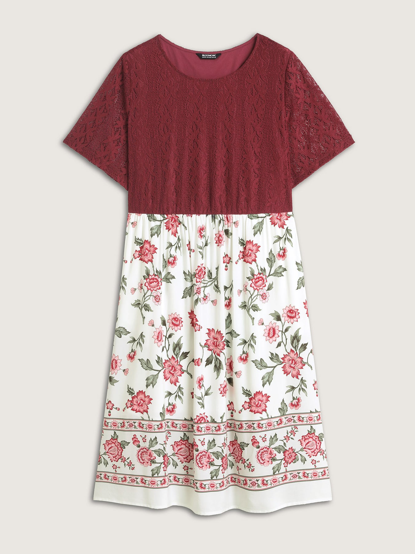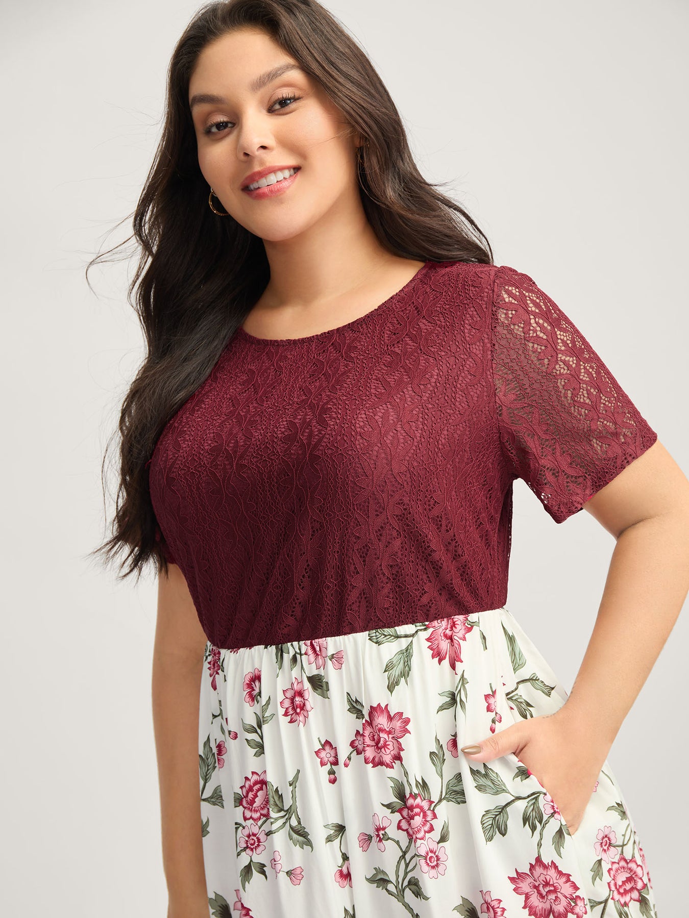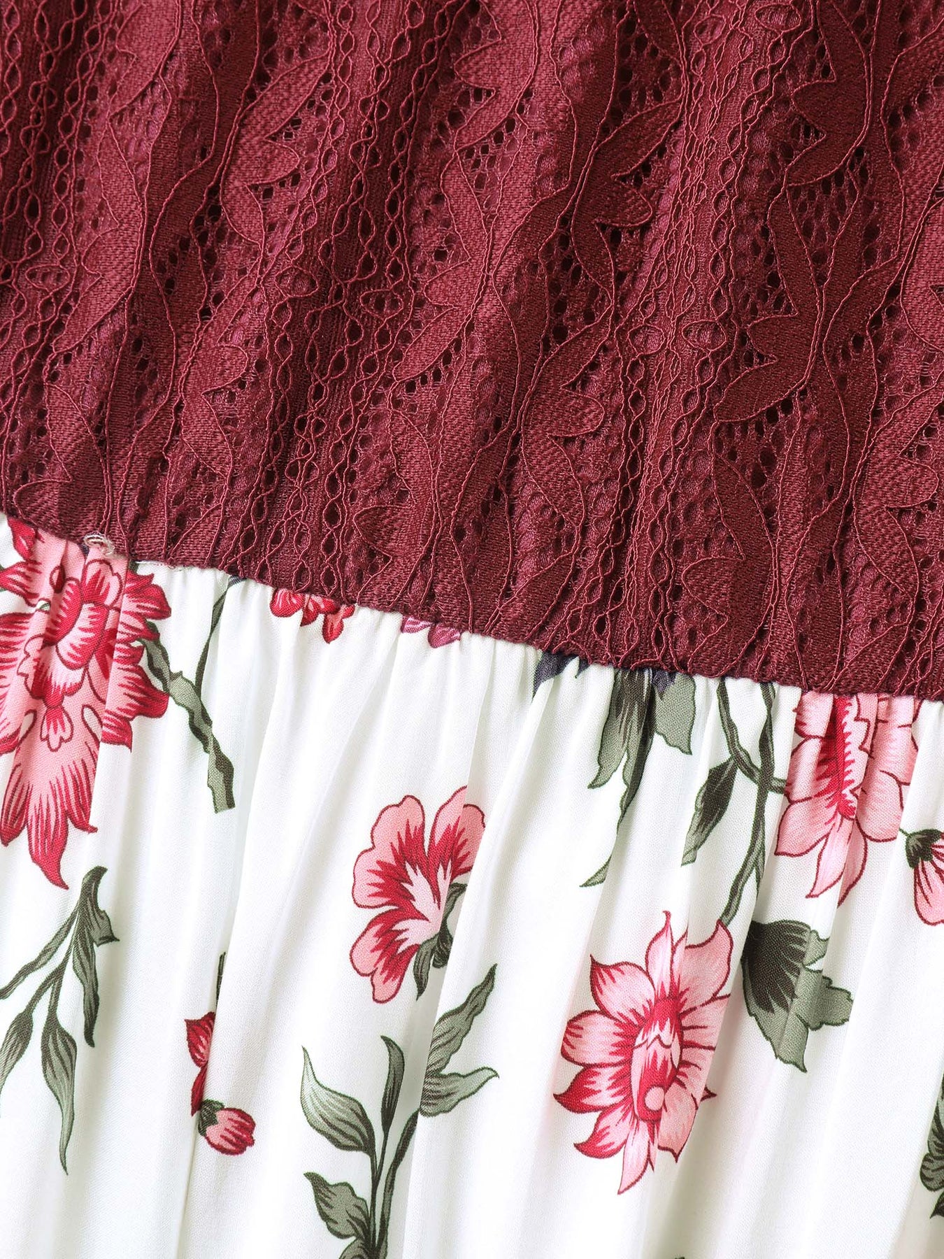 Floral Lace Stretchy Waist Contrast Midi Dress