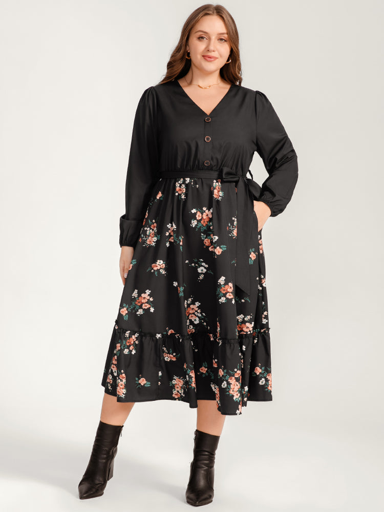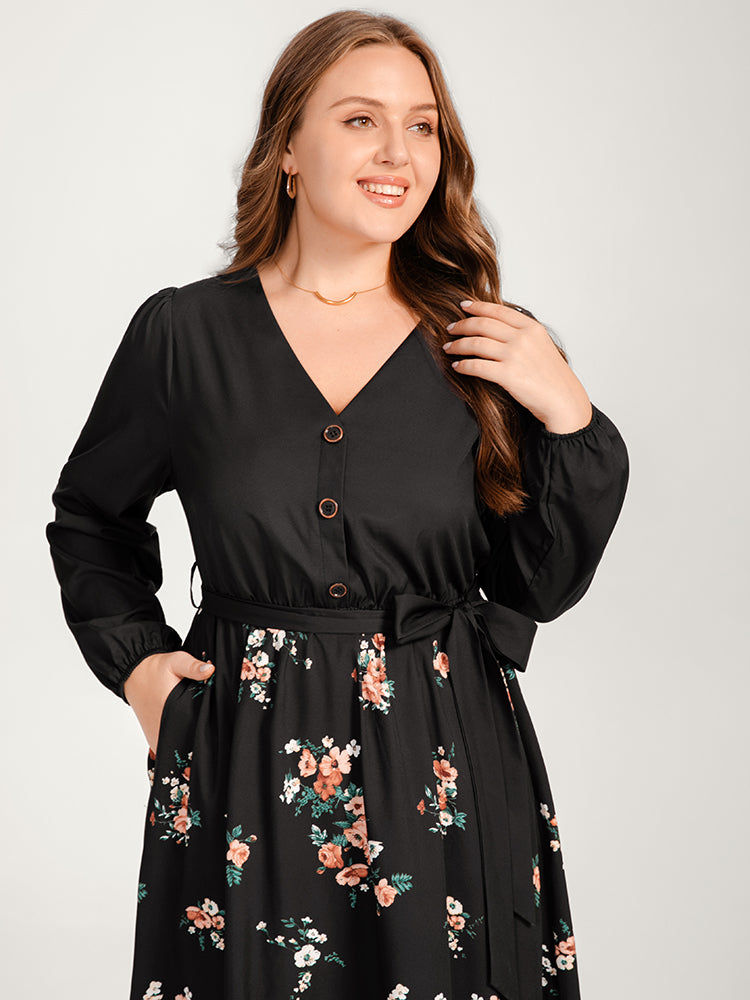 Floral Lantern Sleeve Pocket Belted Wrap Flutter Dress