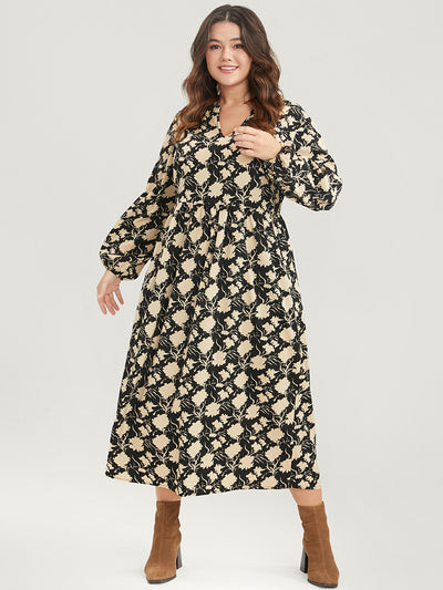 Floral Lantern Sleeve Pocket V Neck Midi Dress