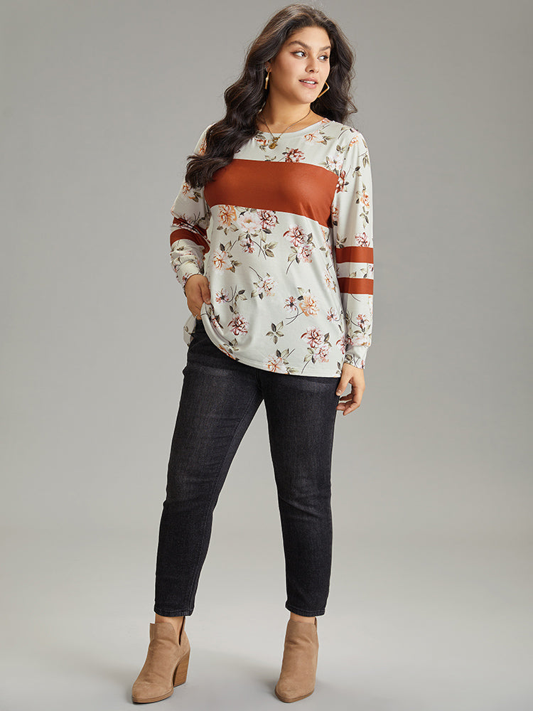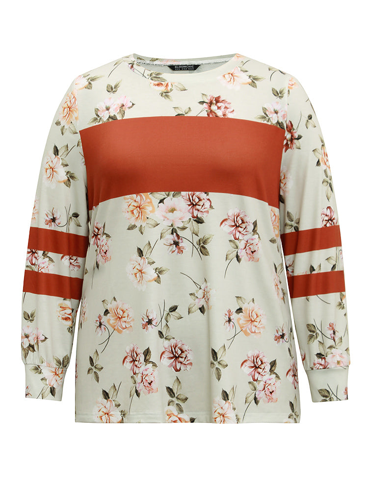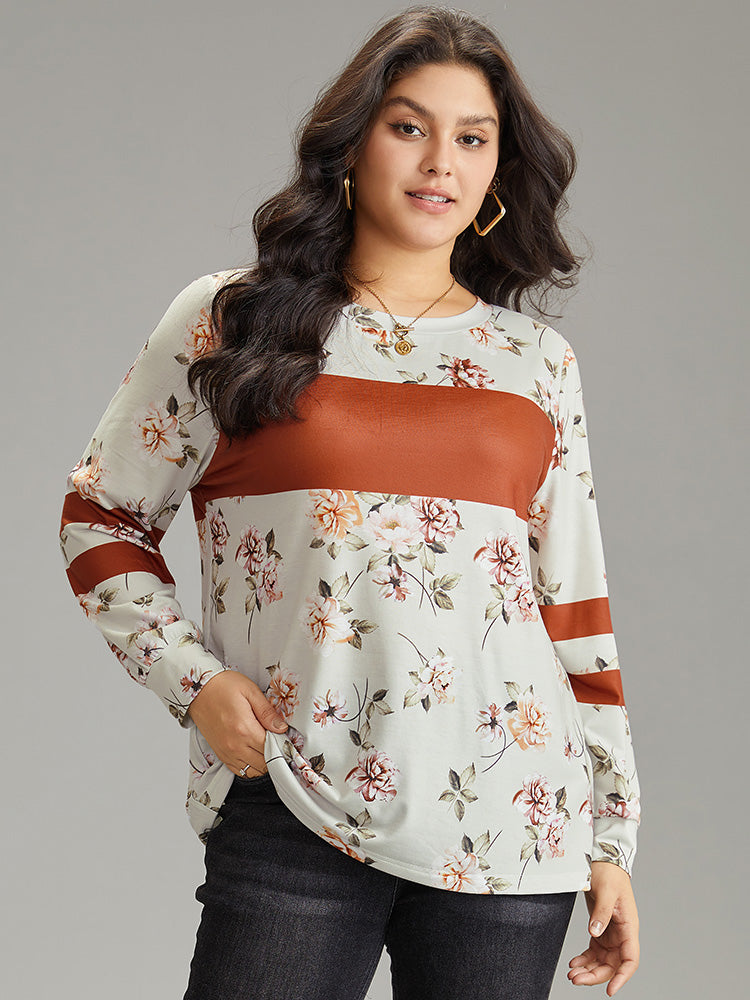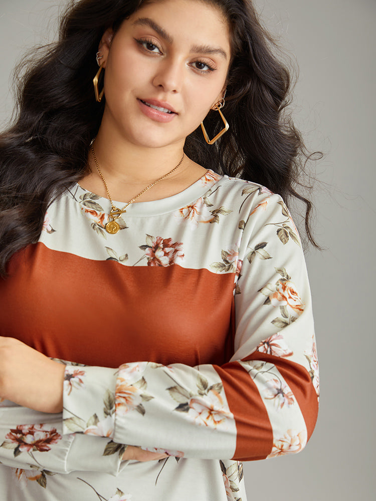 Floral Patchwork Colorblock Contrast Crew Neck T-shirt