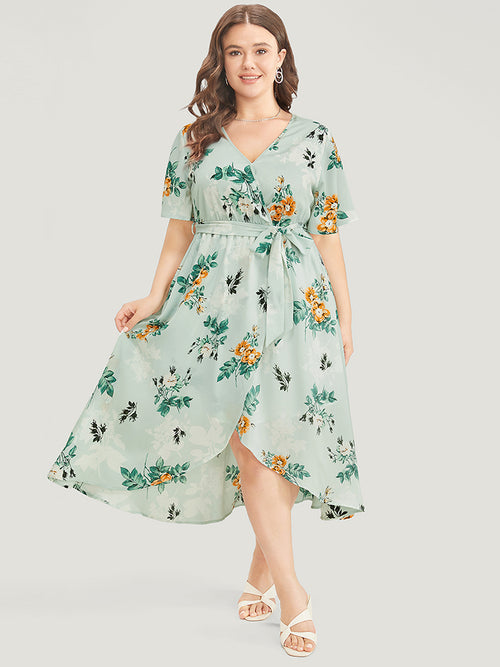 Floral Pocket Ruffle Sleeve Wrap Belt Asymmetrical Hem Dress