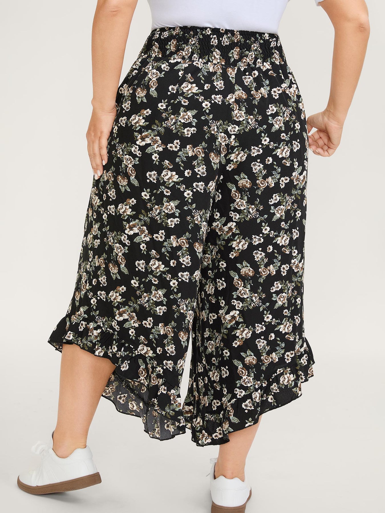 Floral Print Asymmetrical Ruffled Hem Pants