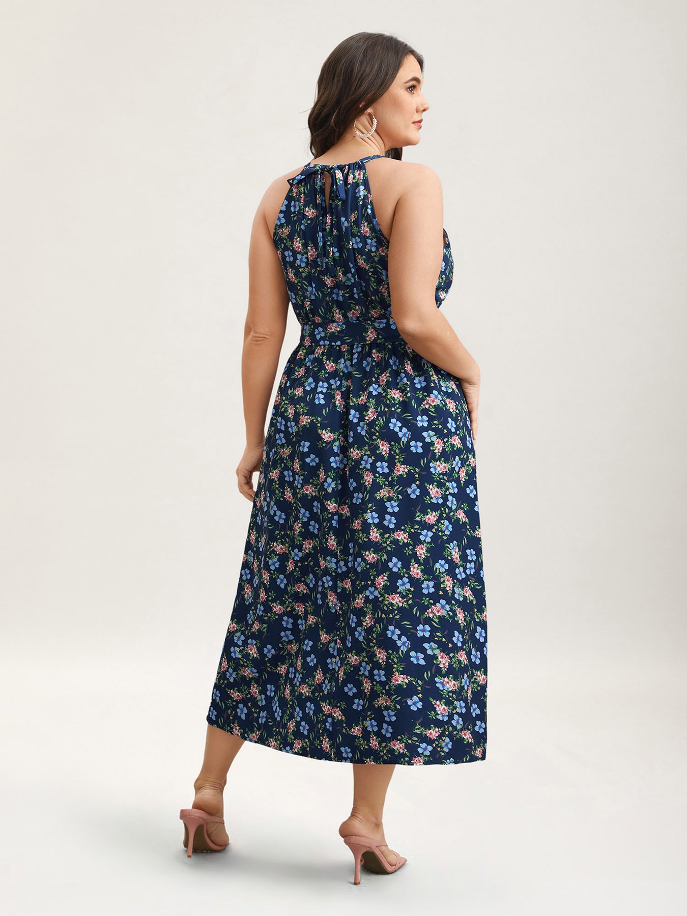 Floral Print Belted Stretchy Waist Midi Dress