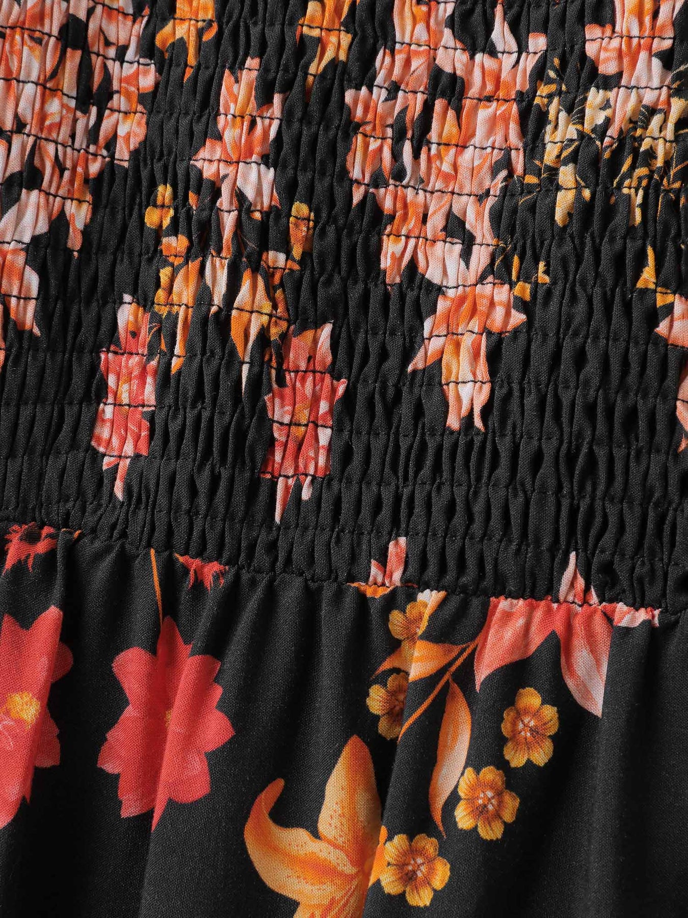 Floral Print Lace Trim Shirred Maxi Dress
