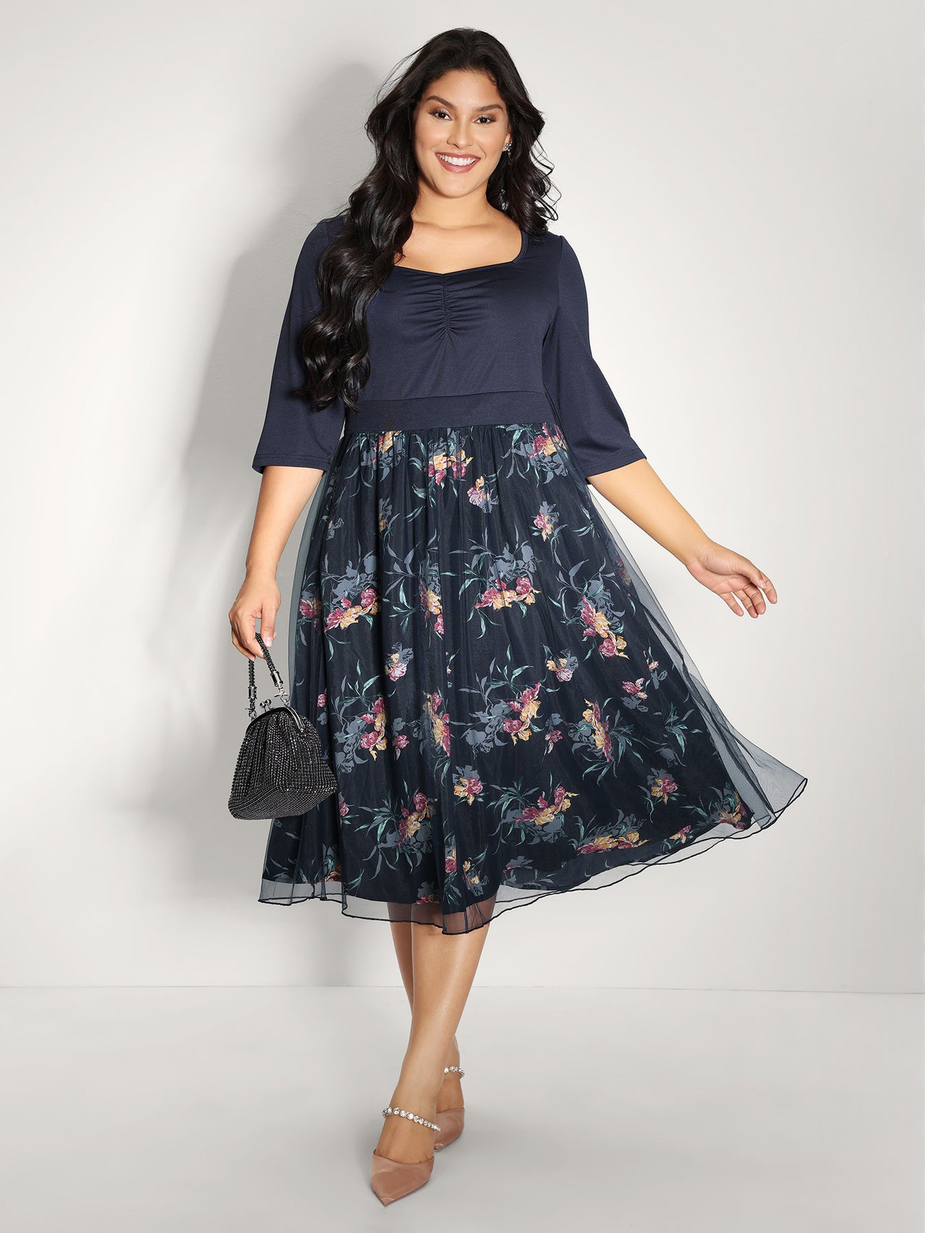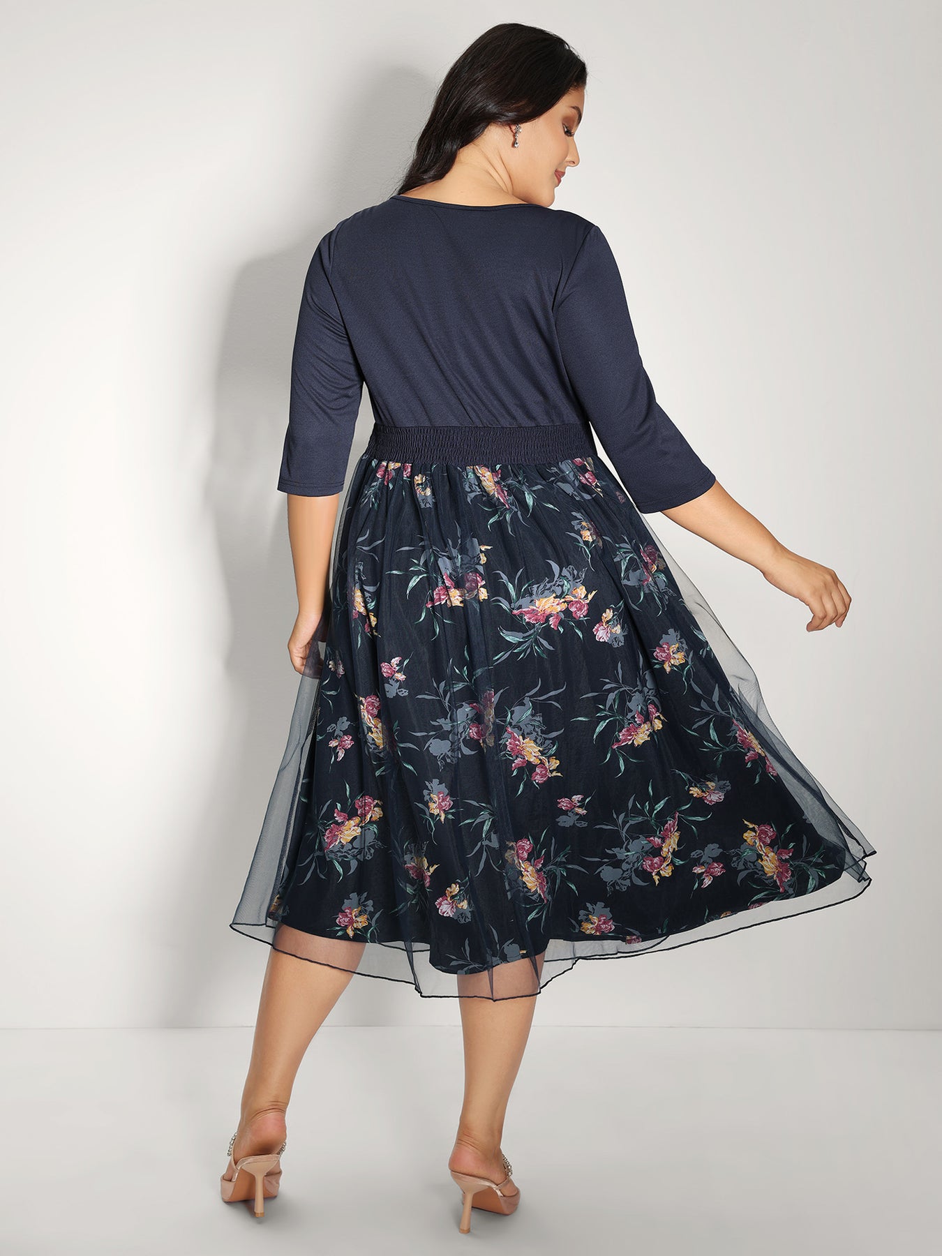 Floral Print Mesh Shirred Waist Midi Dress
