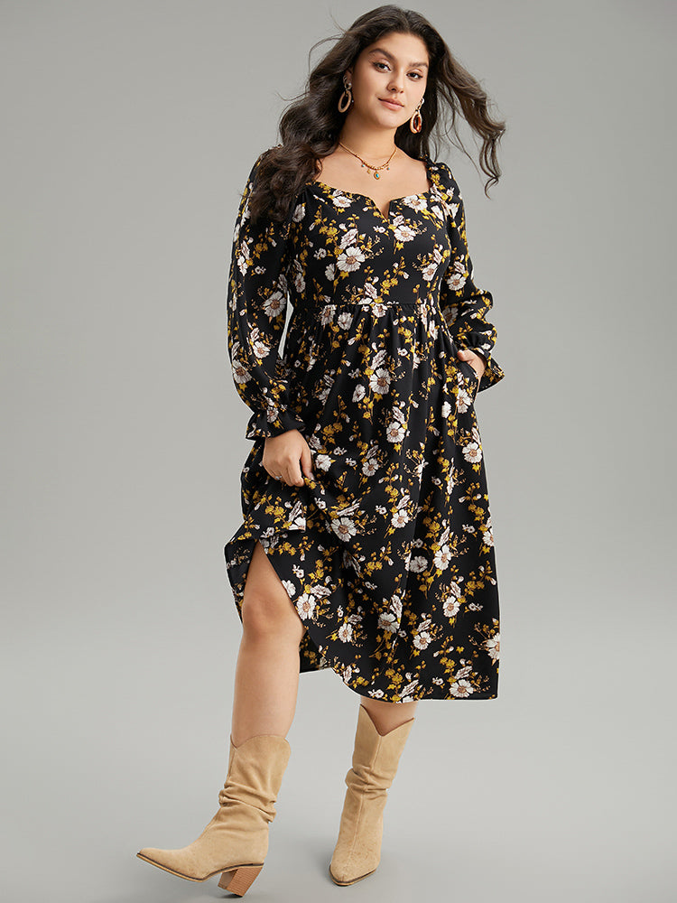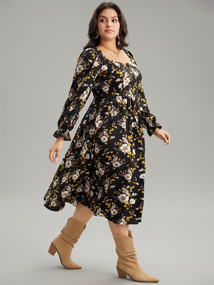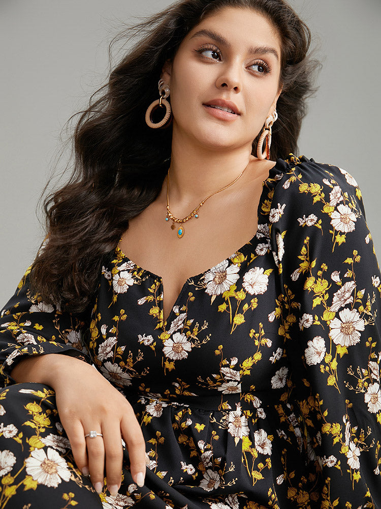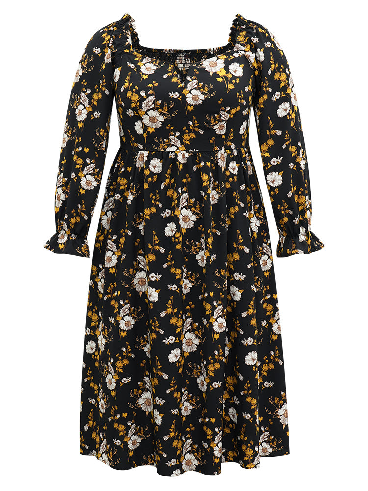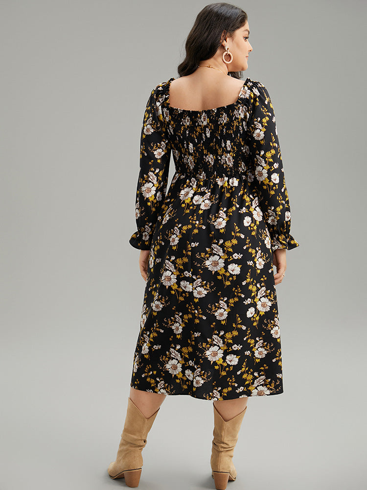 Floral Print Notched Frill Trim Gathered Shirred Dress