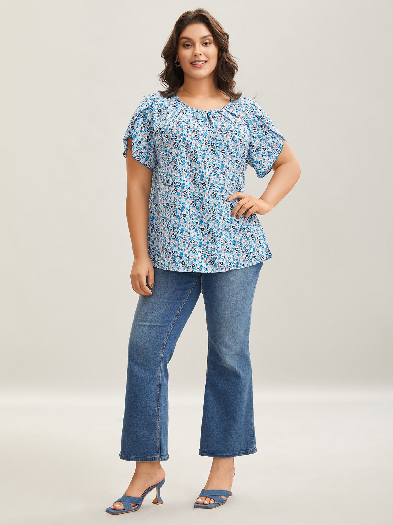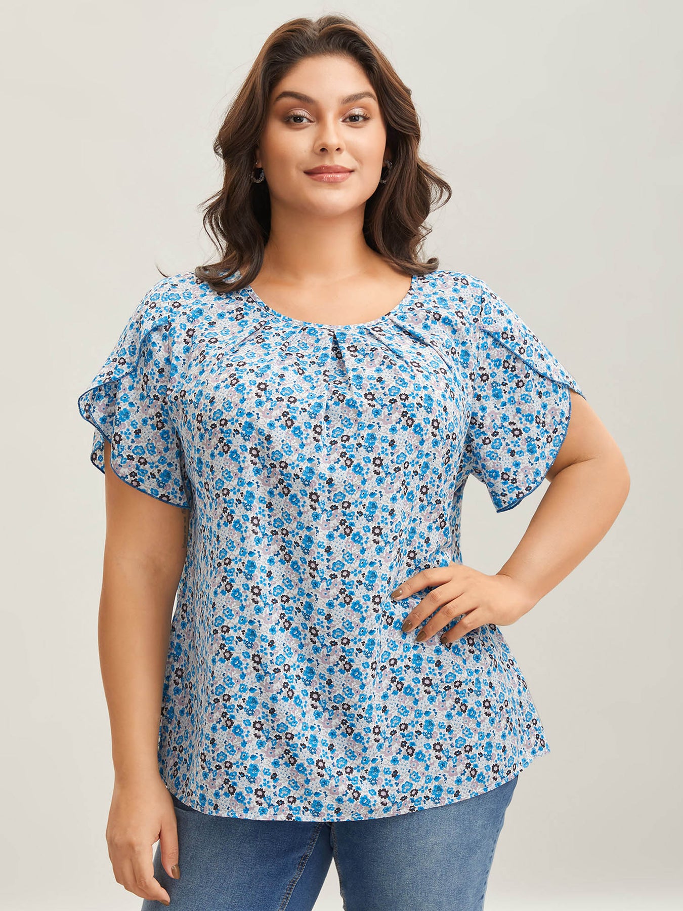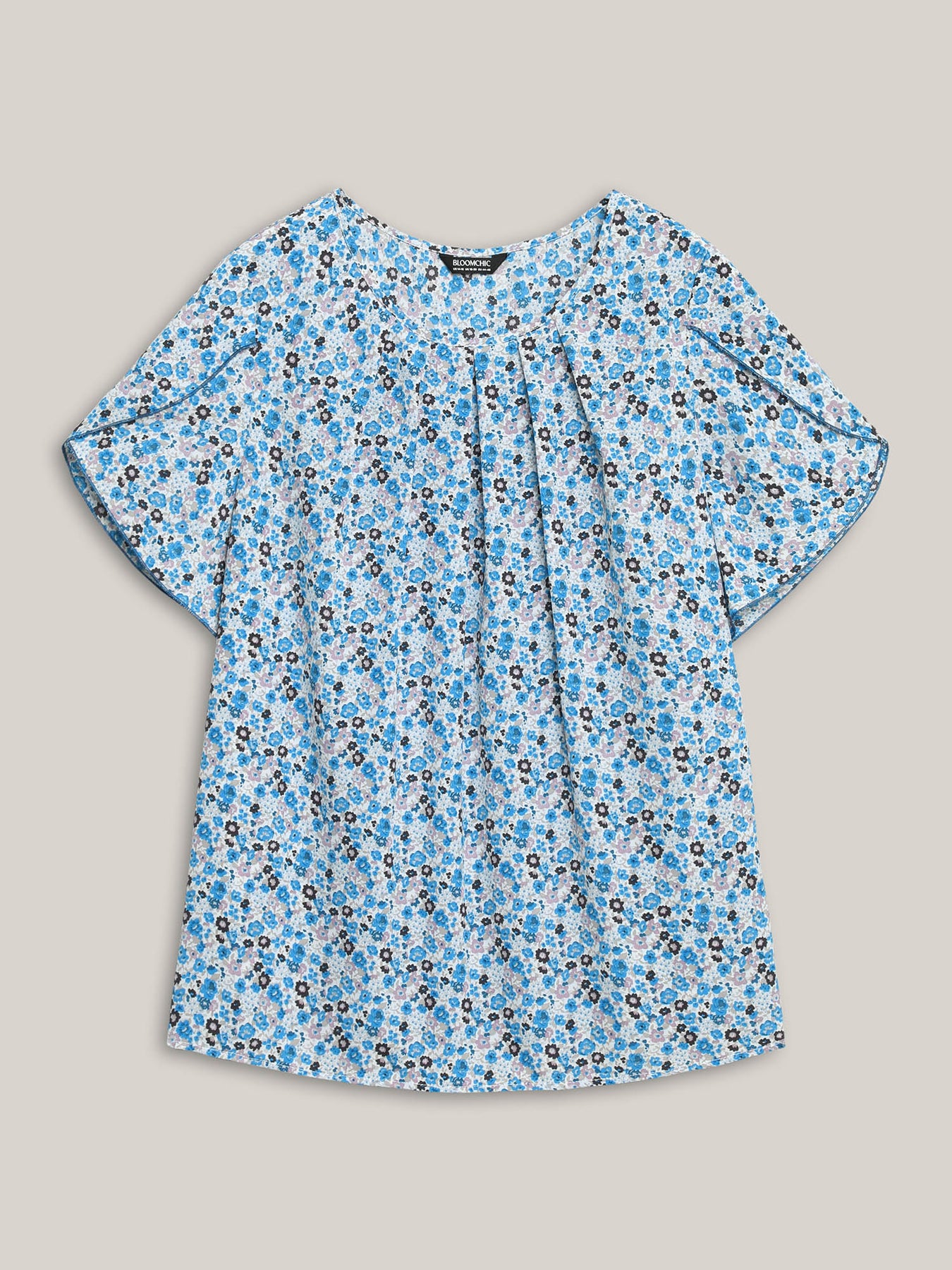 Floral Print Petal Sleeve Pleated Neck Blouse
