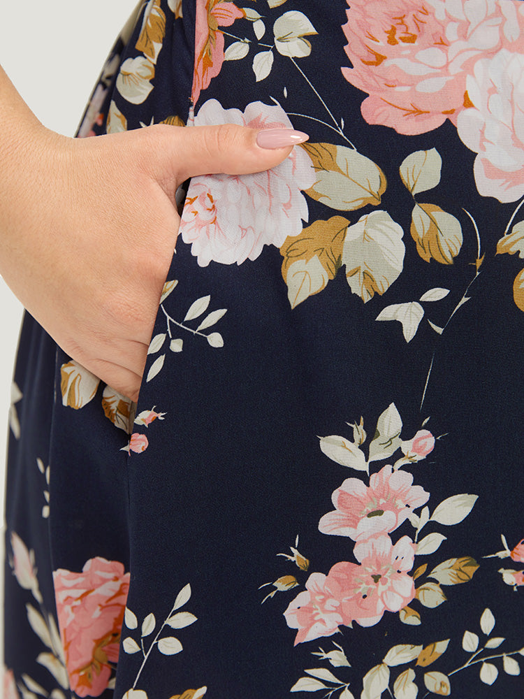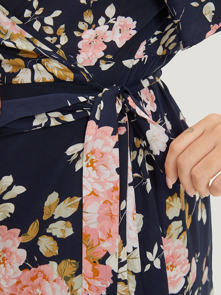 Floral Print Pocket Knot Ruffle Sleeve Wrap Dress