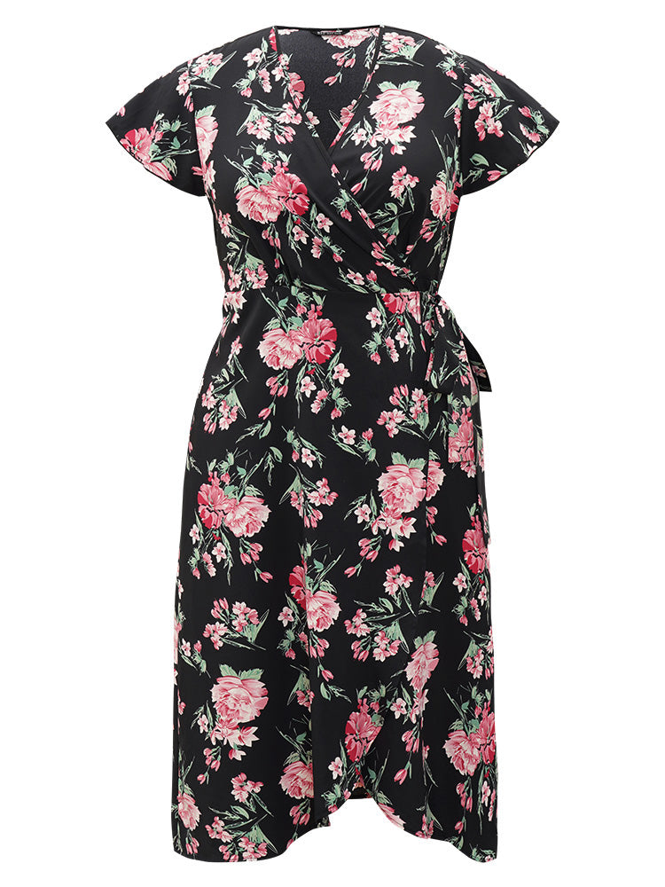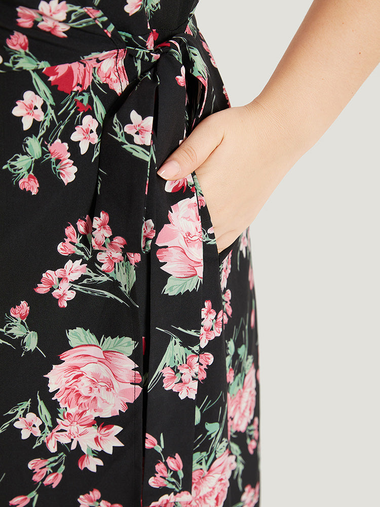 Floral Print Wrap Pocket Knot Asymmetrical Hem Dress