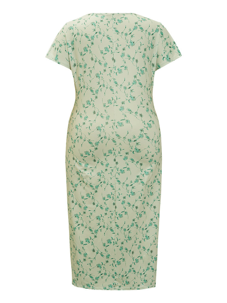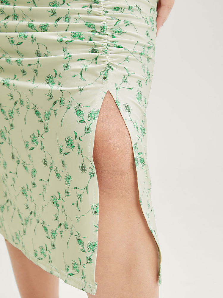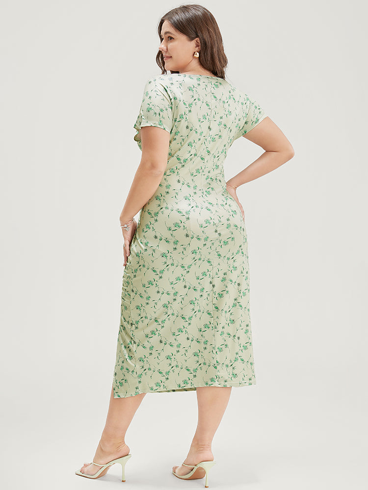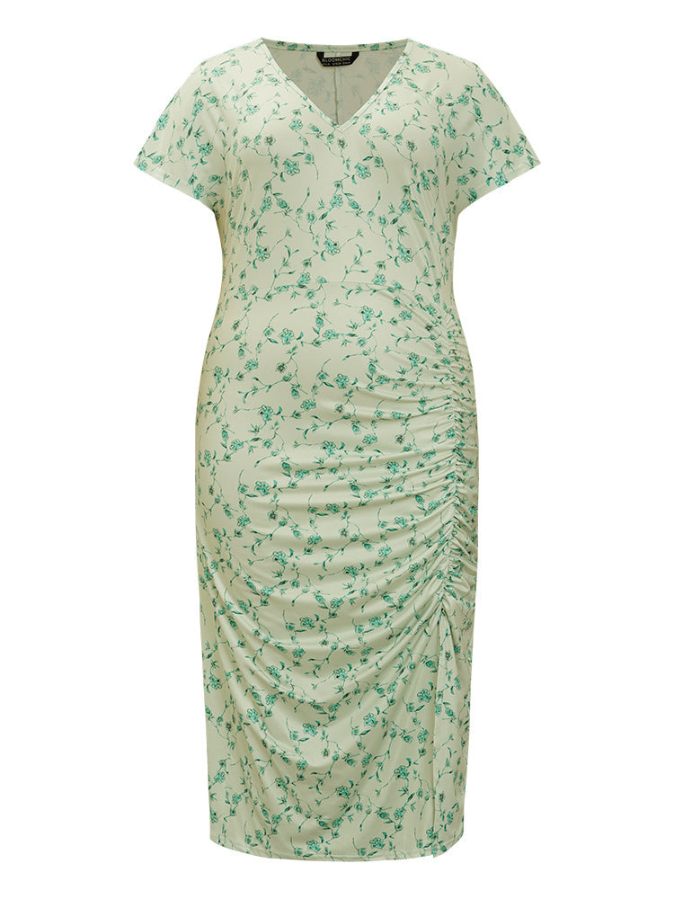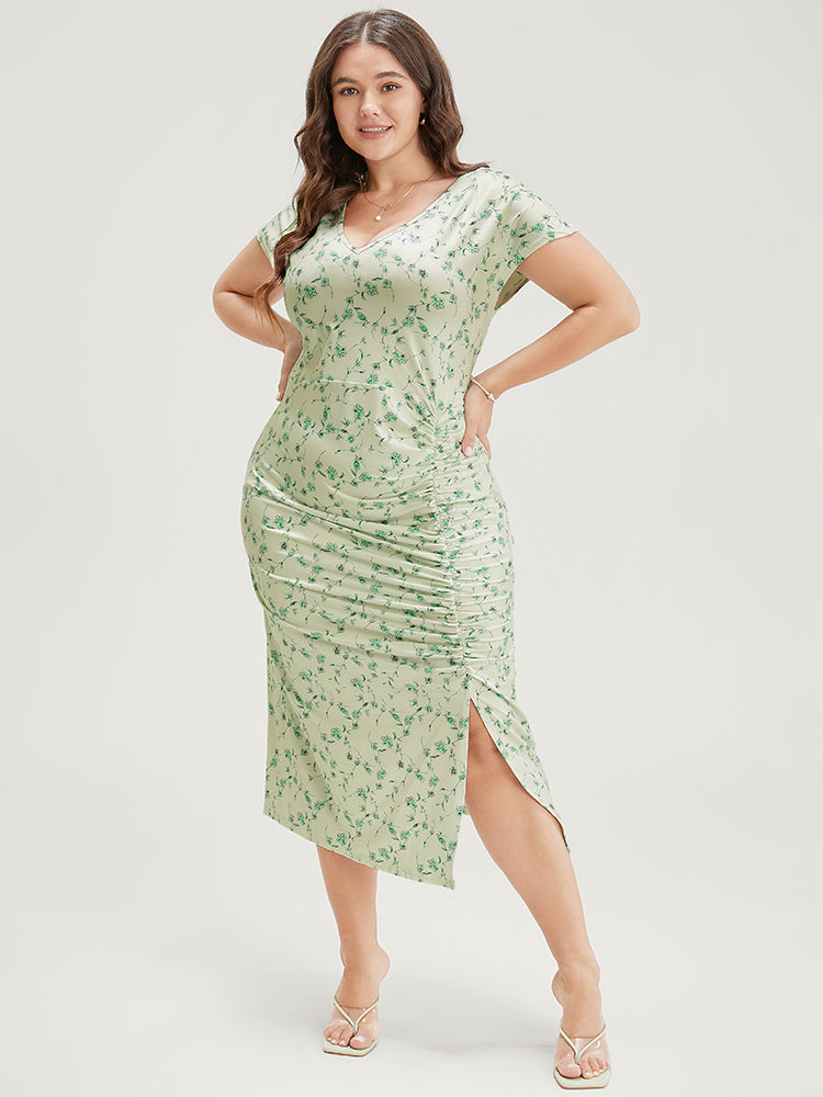 Floral Printed Split Hem Cap Sleeve Ruched Dress