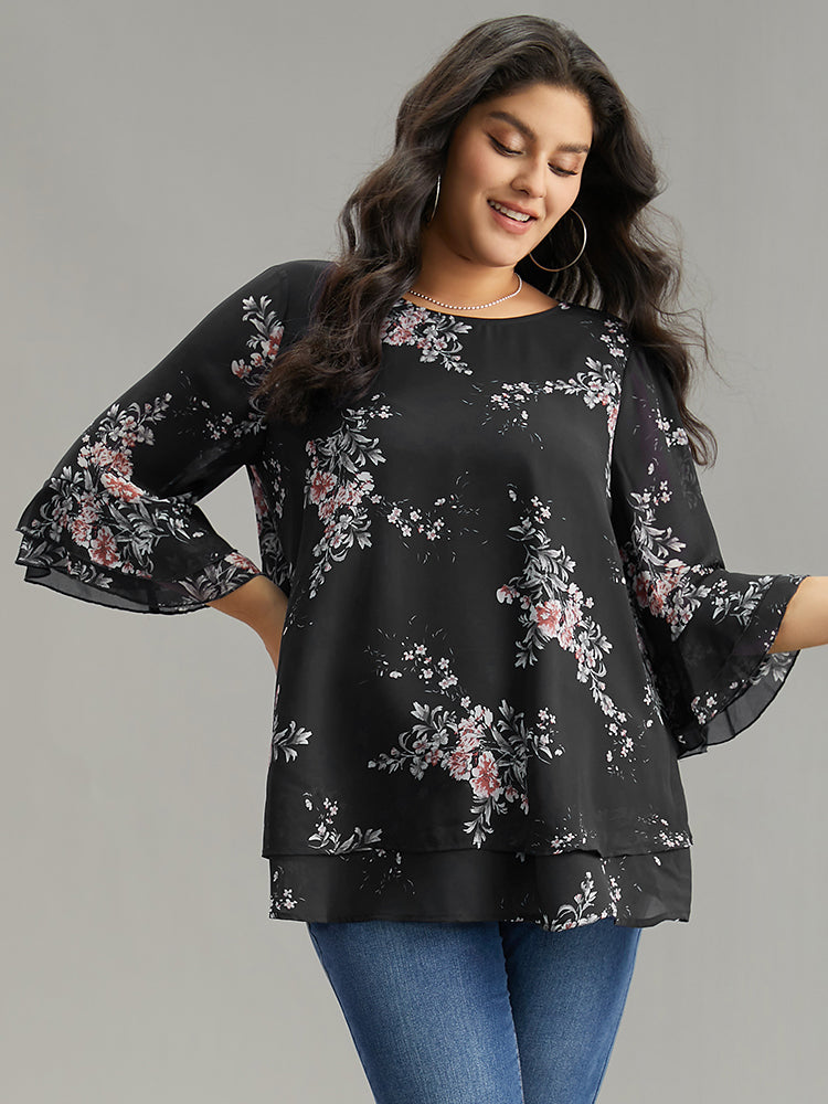 Floral Chiffon Ruffle Sleeve Mesh Patchwork Blouse