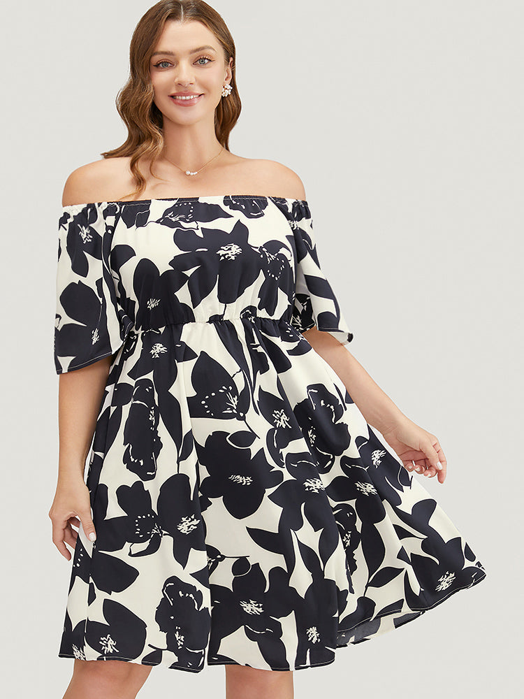 Floral Ruffle Sleeve Pocket Off Shoulder Dress