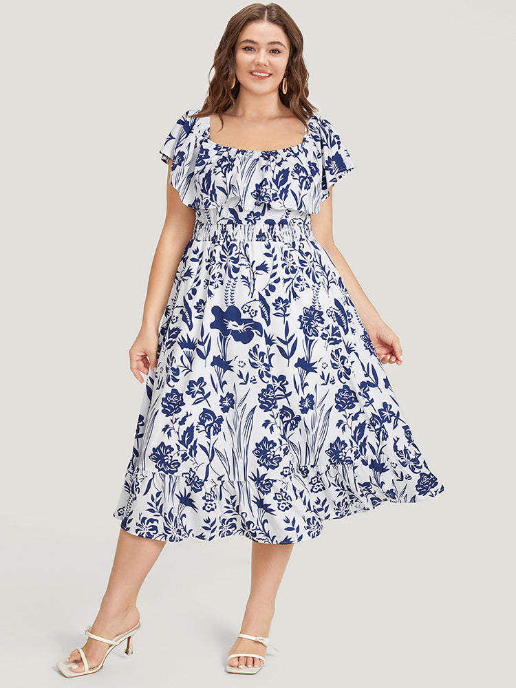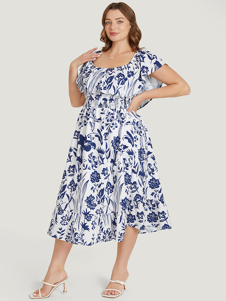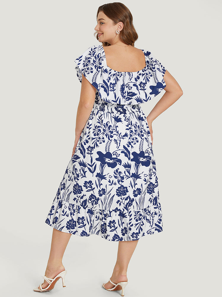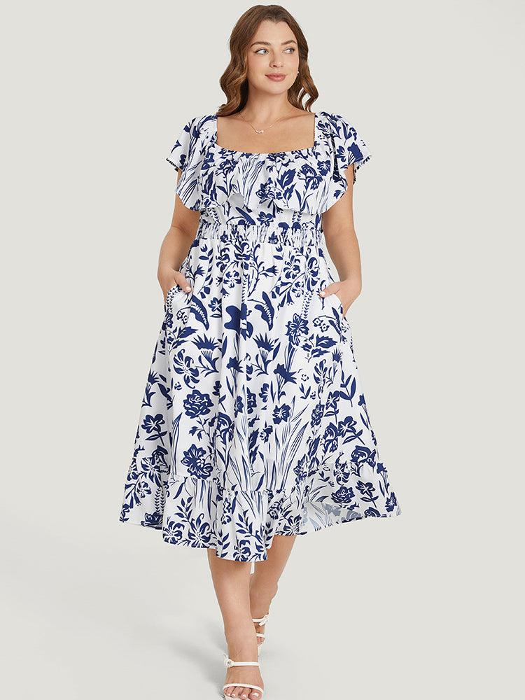 Floral Ruffle Trim Square Neck Shirred Pocket Dress