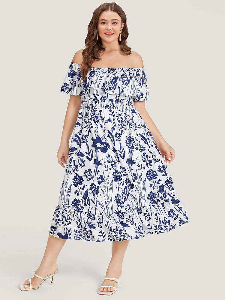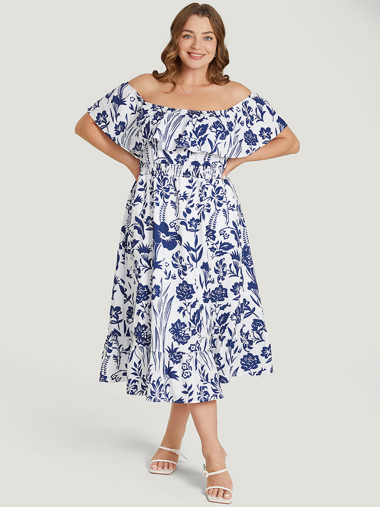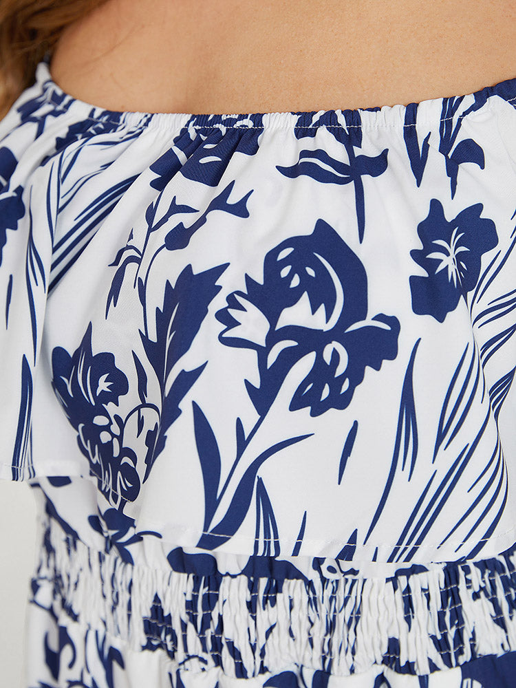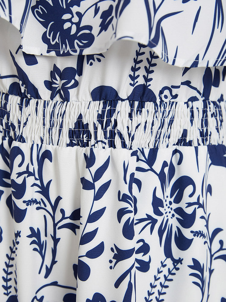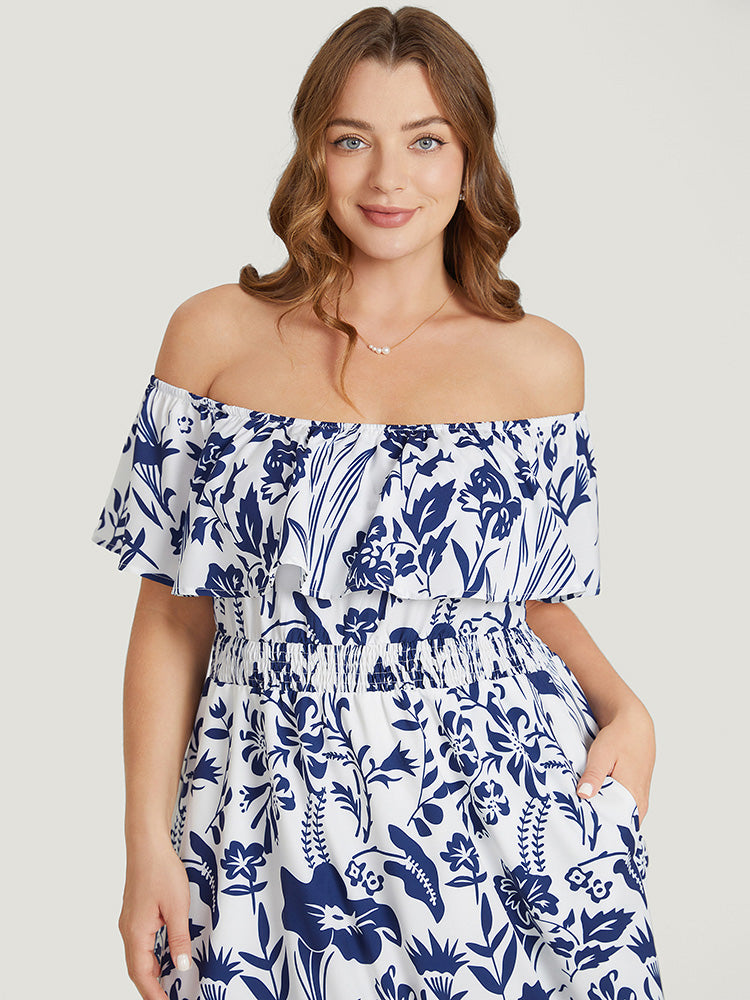 Floral Ruffle Trim Square Neck Shirred Pocket Dress