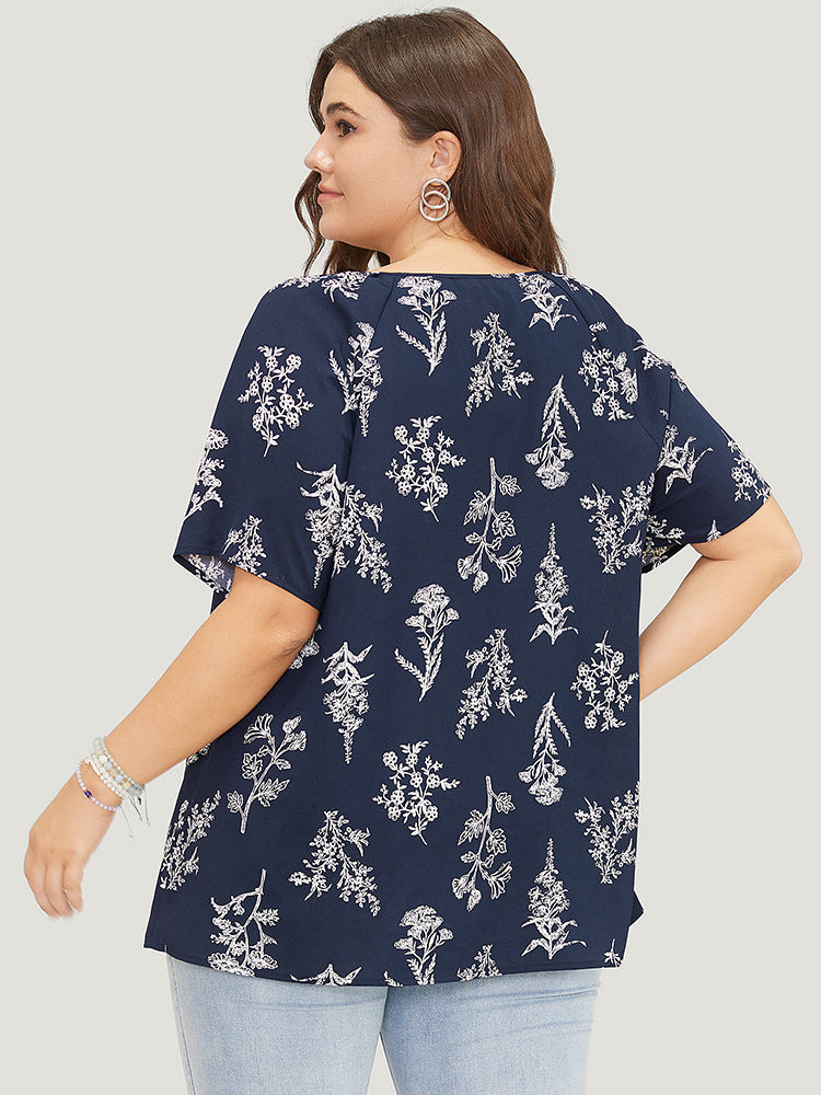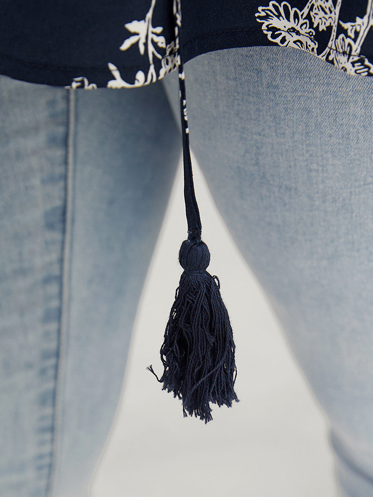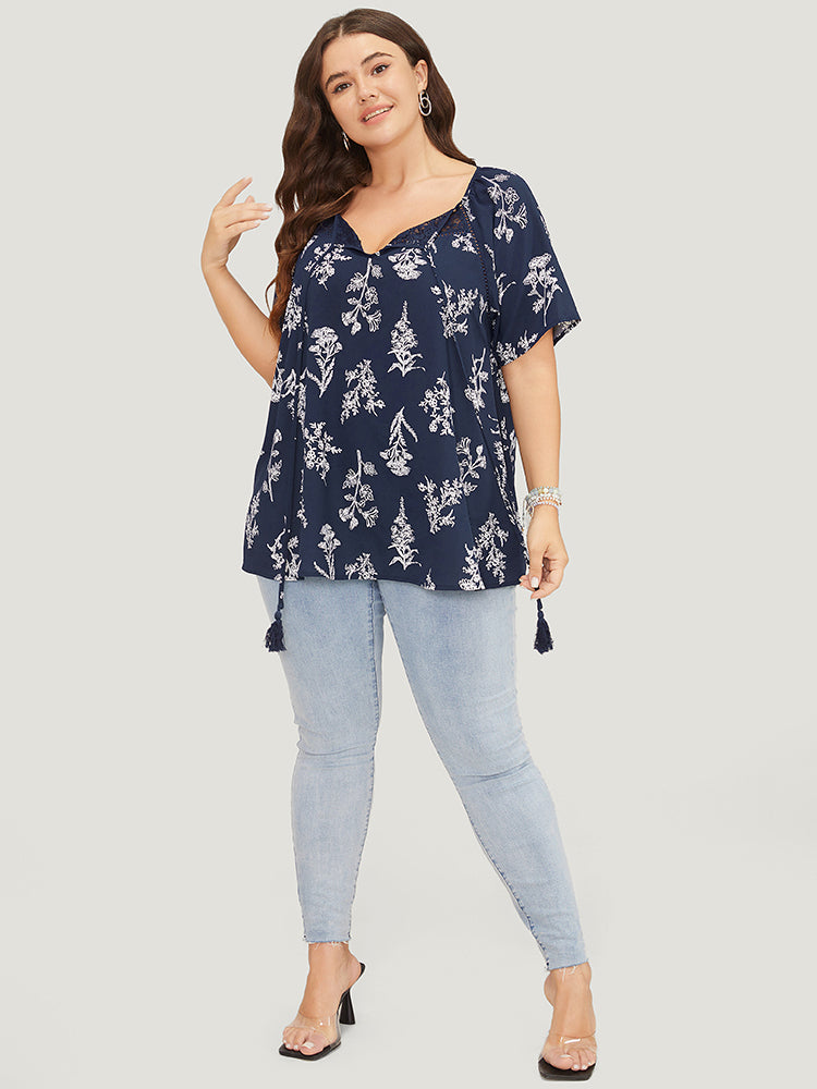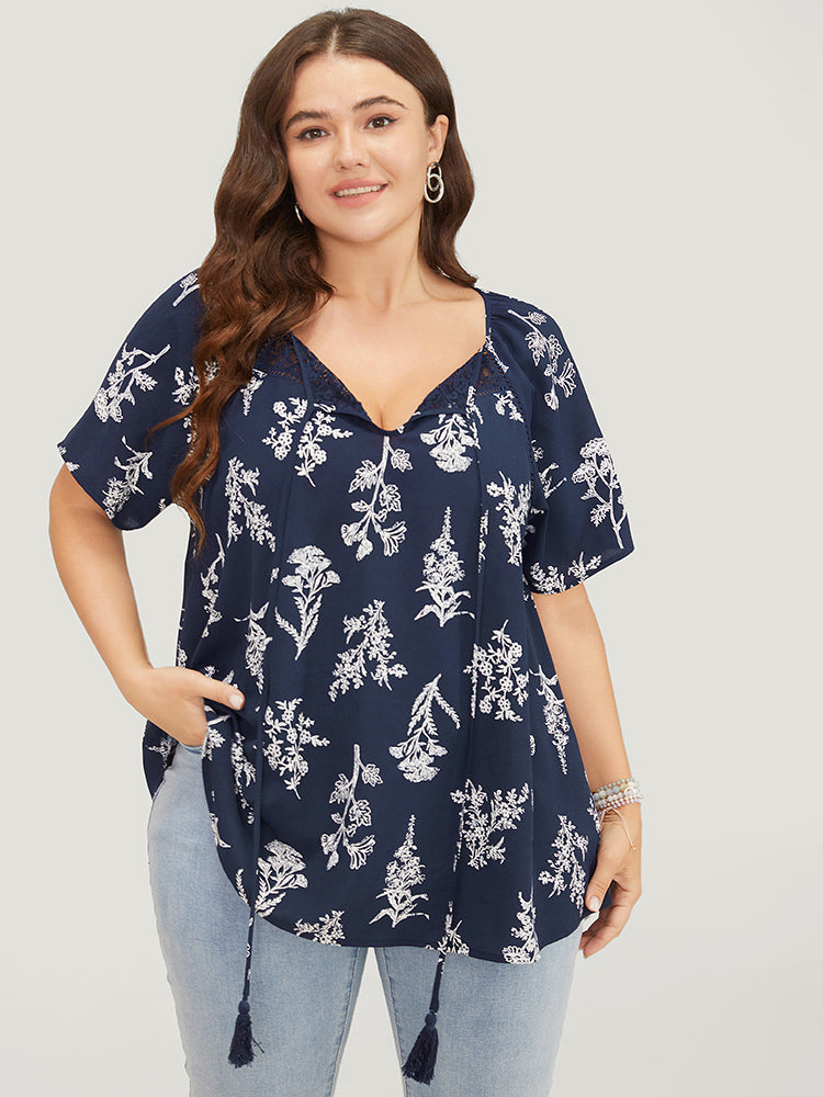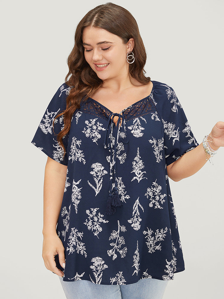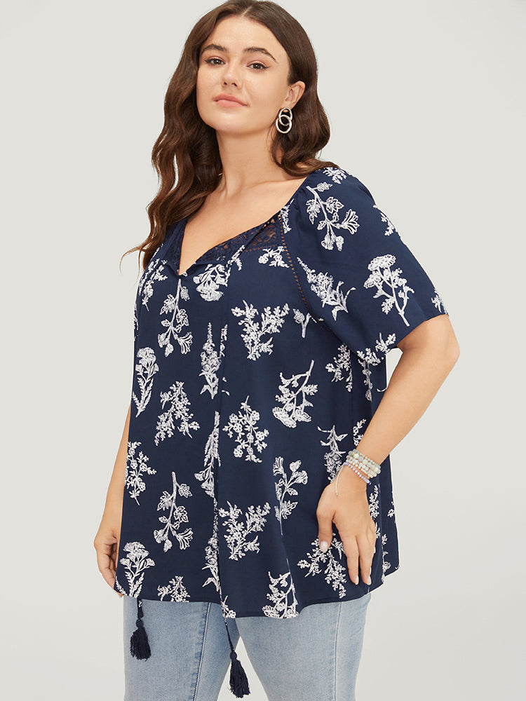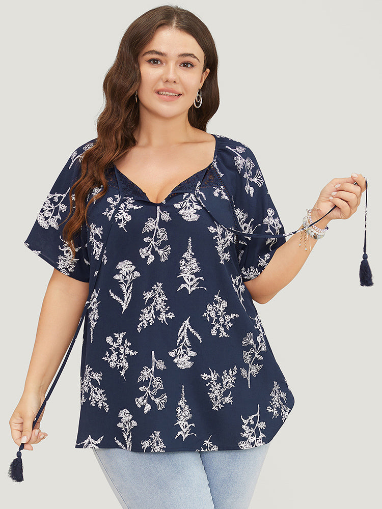 Floral Tassels Tie Neck Contrast Lace Blouse