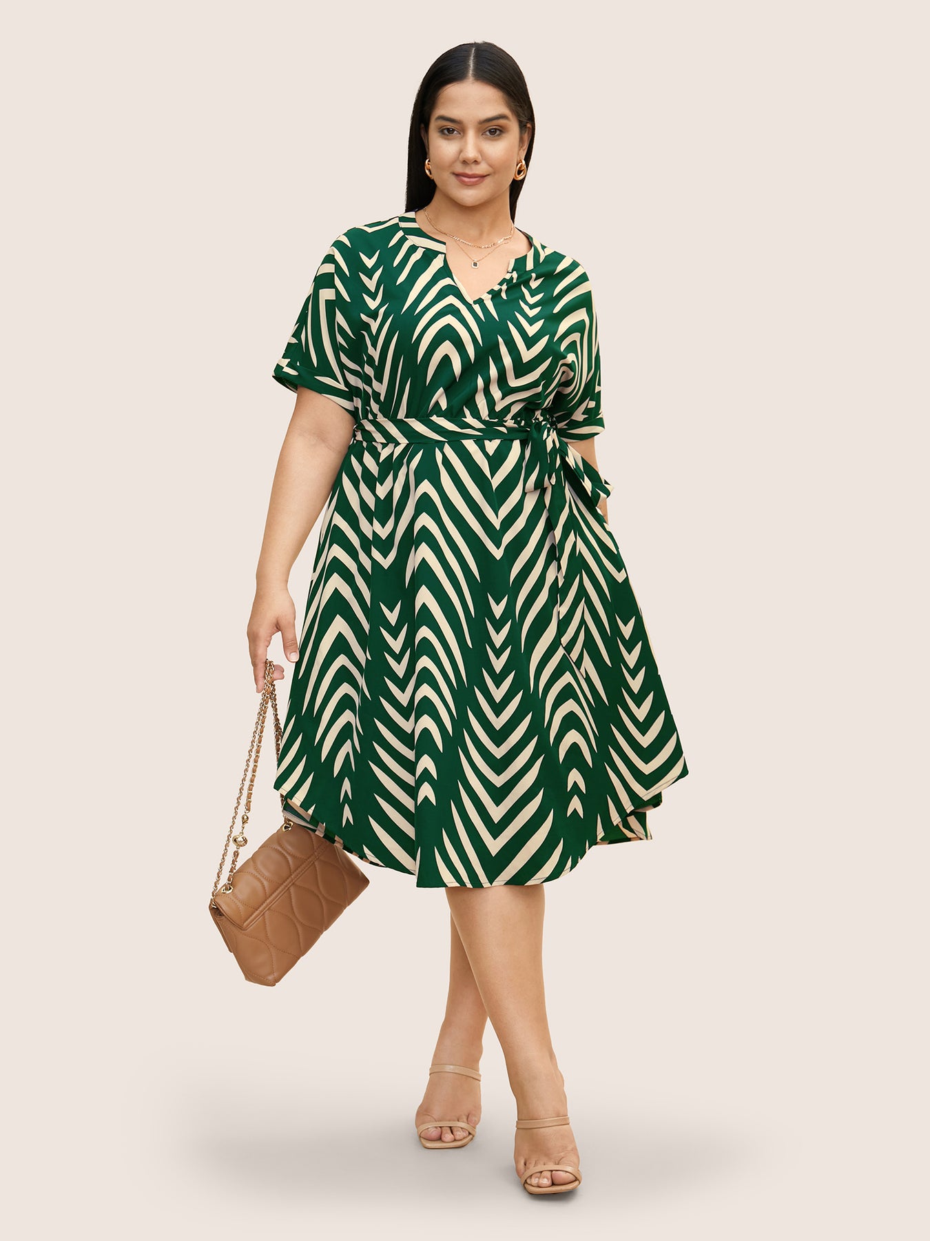 Geometric Belted Dolman Sleeve Curved Hem Dress