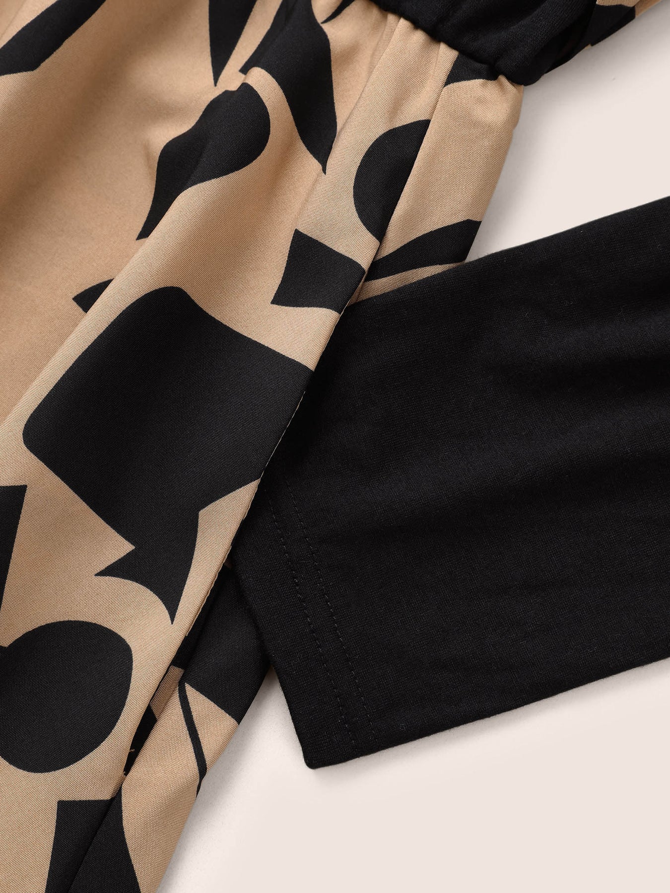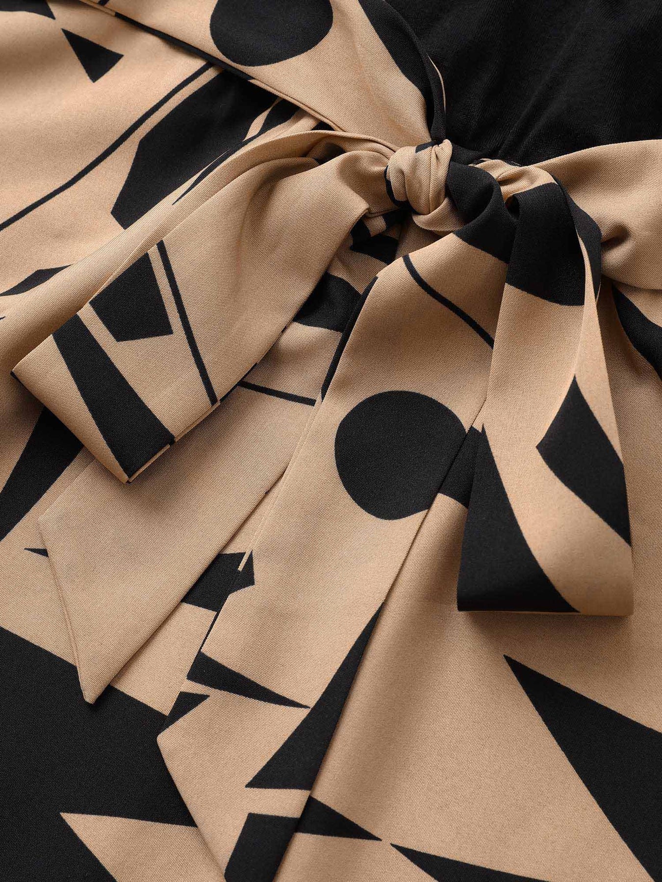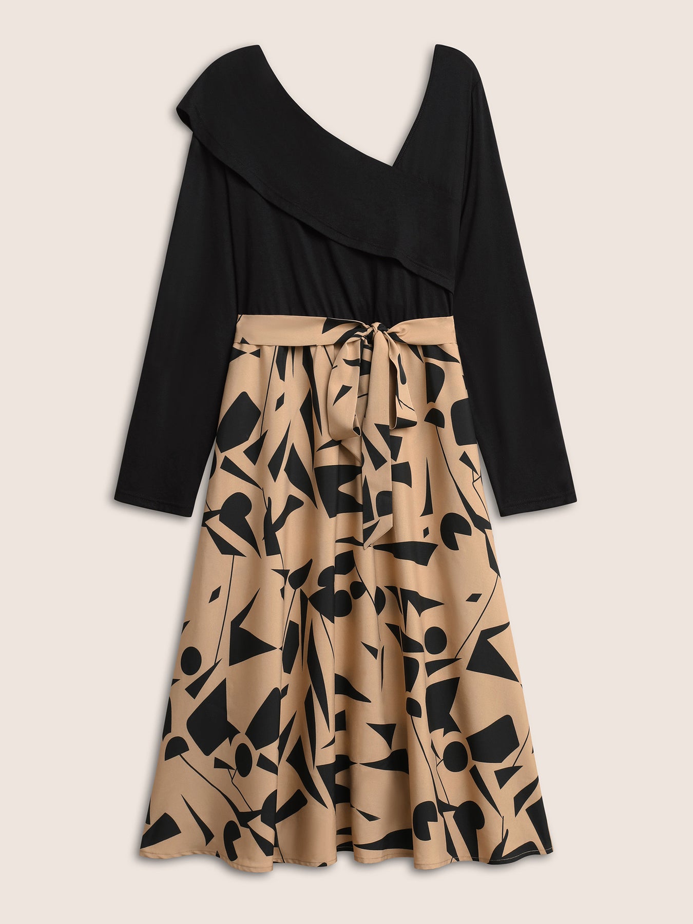 Geometric Contrast Patchwork Asymmetrical Neck Belted Dress
