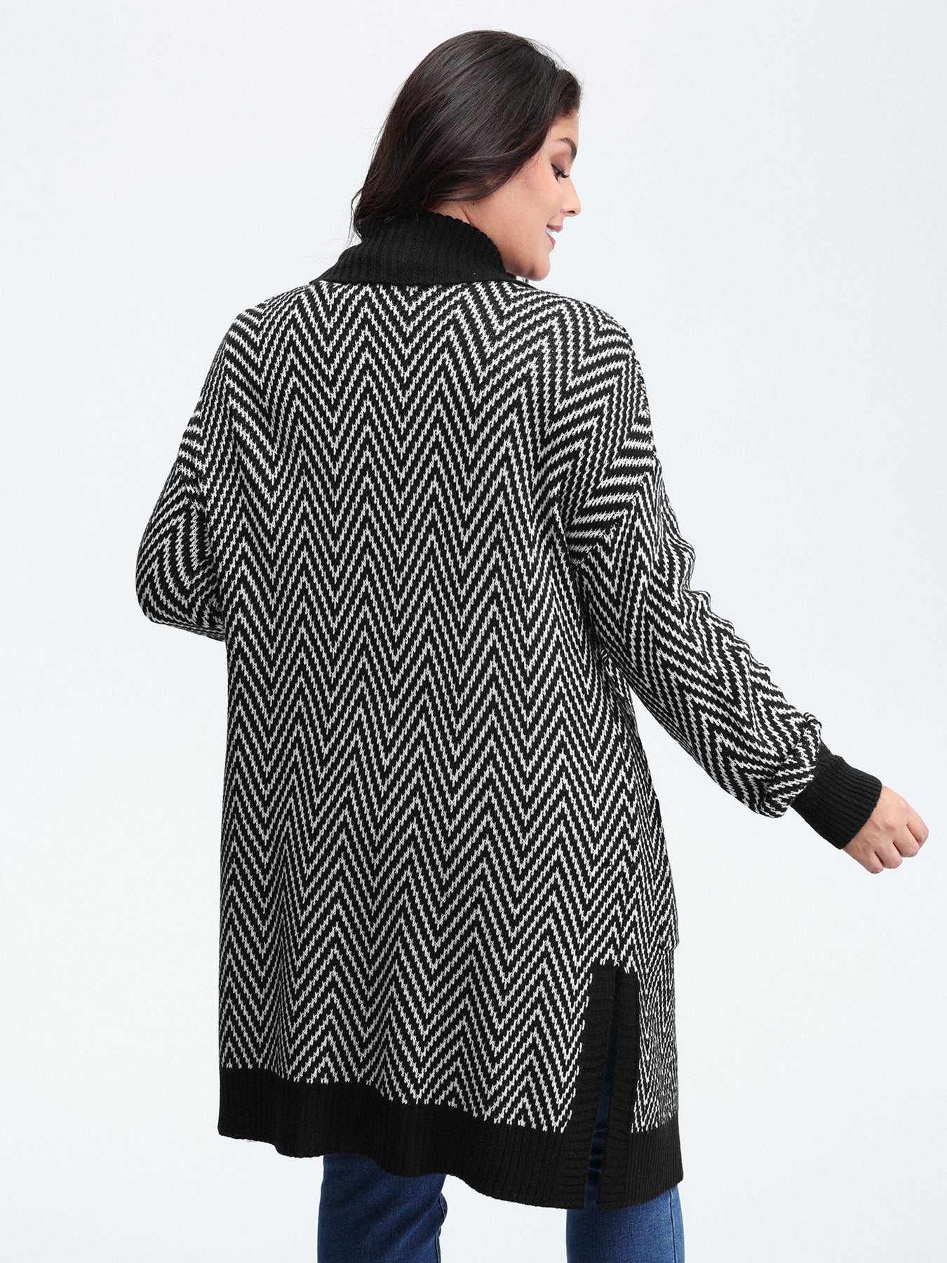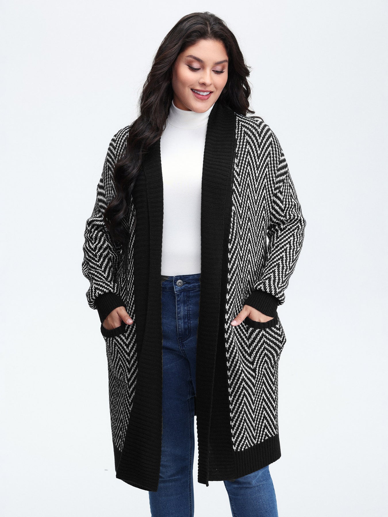 Geometric Pattern Pockets Open-Front Knit Cardigan
