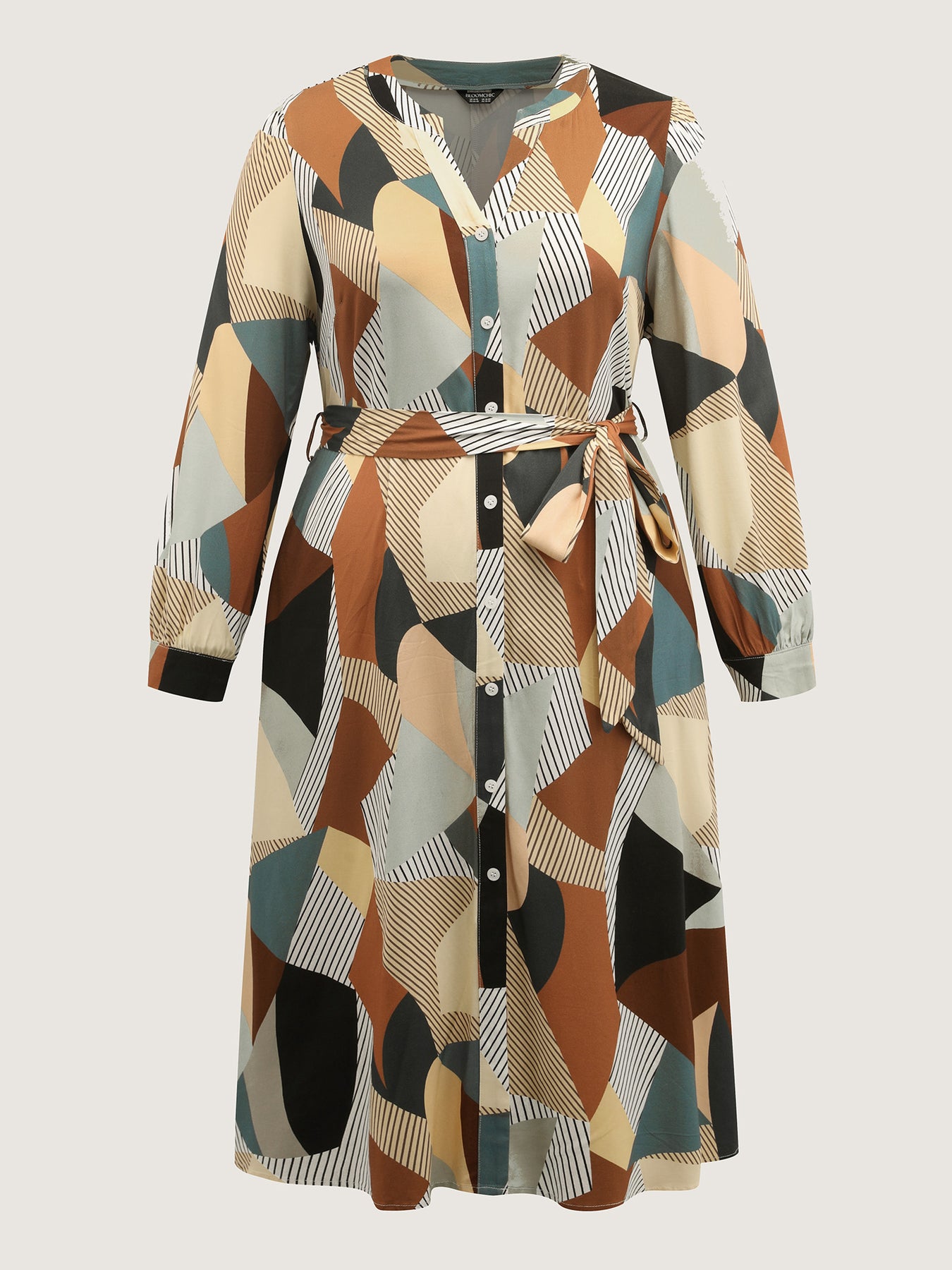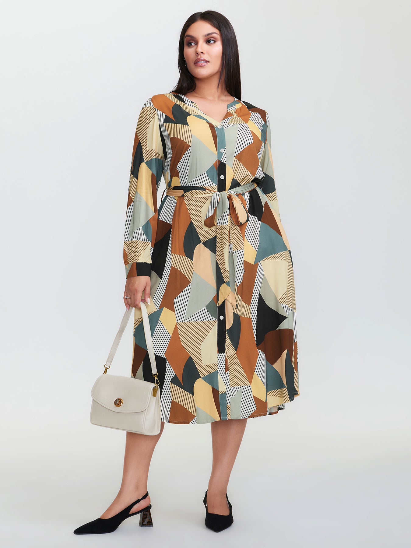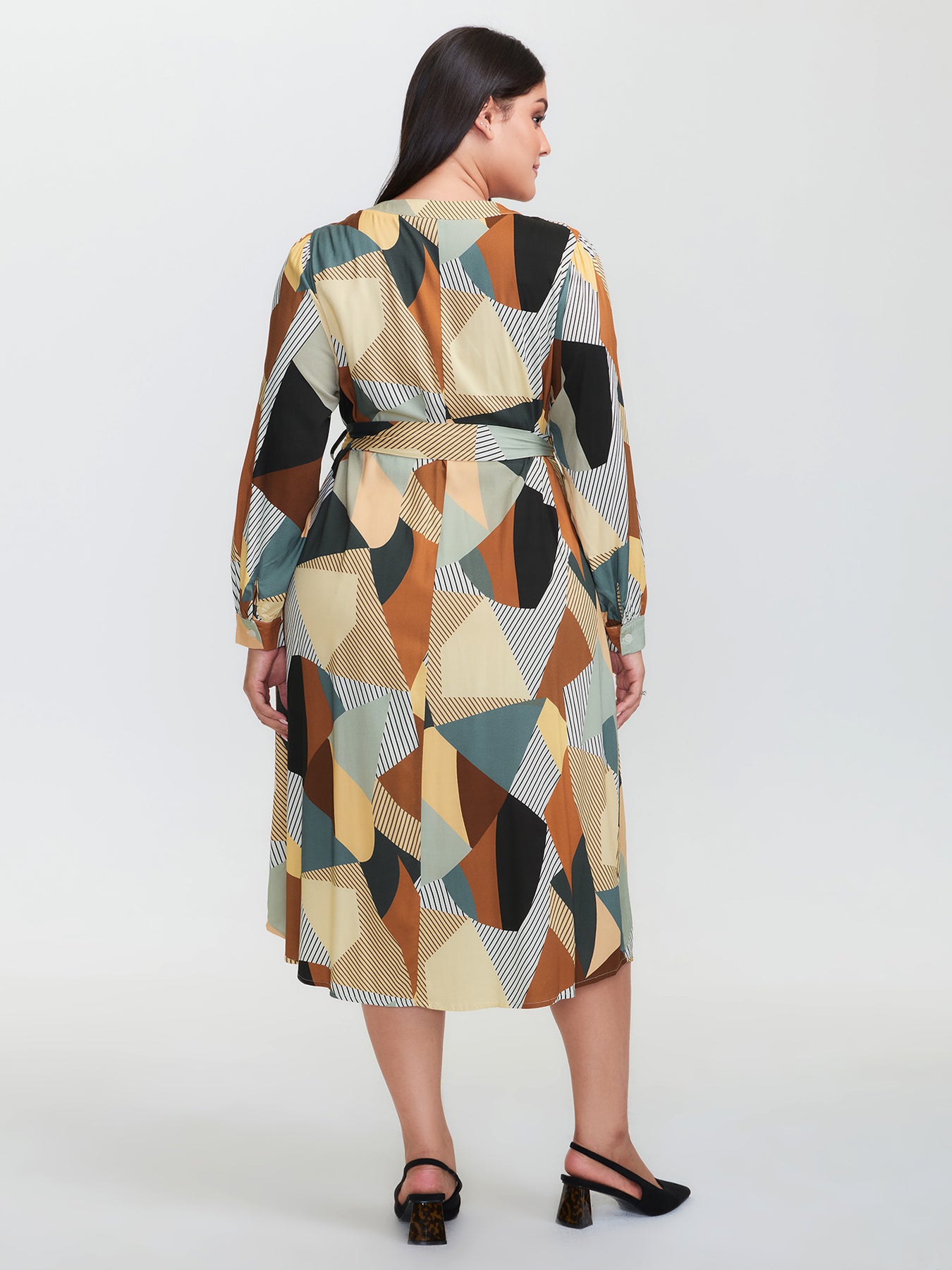 Geometric Print Contrast Tab Sleeve Midi Dress