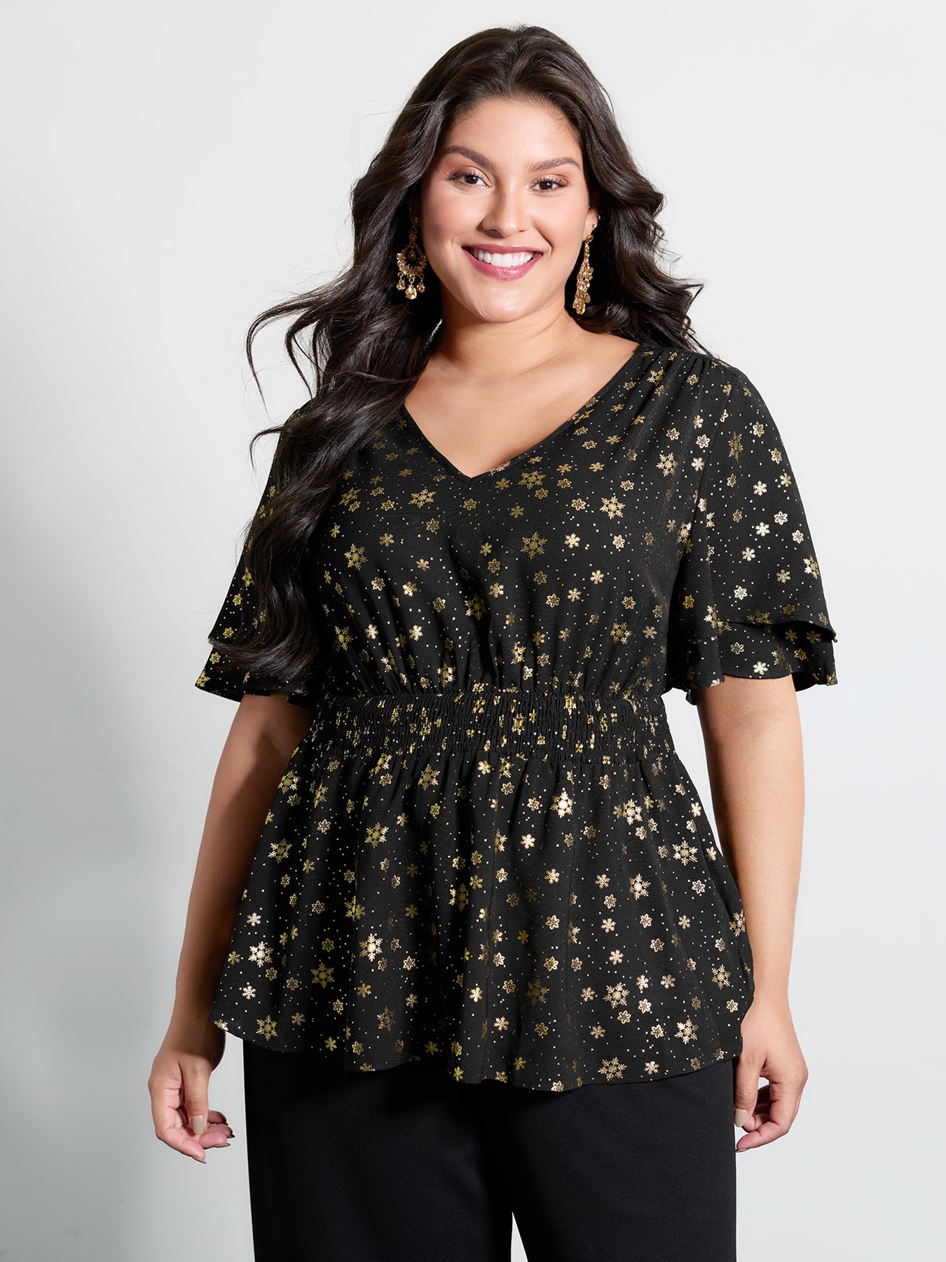Gold Stamped Layered Ruffled Sleeve Blouse