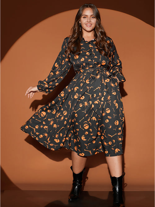Halloween Print Shirt Collar Pocket Button Up Belted Flutter Dress
