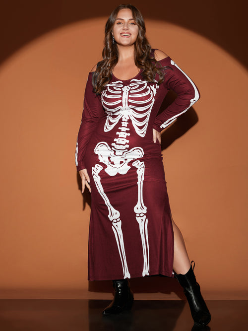 Halloween Skeleton Print Cold Shoulder Split Hem Maxi Dress