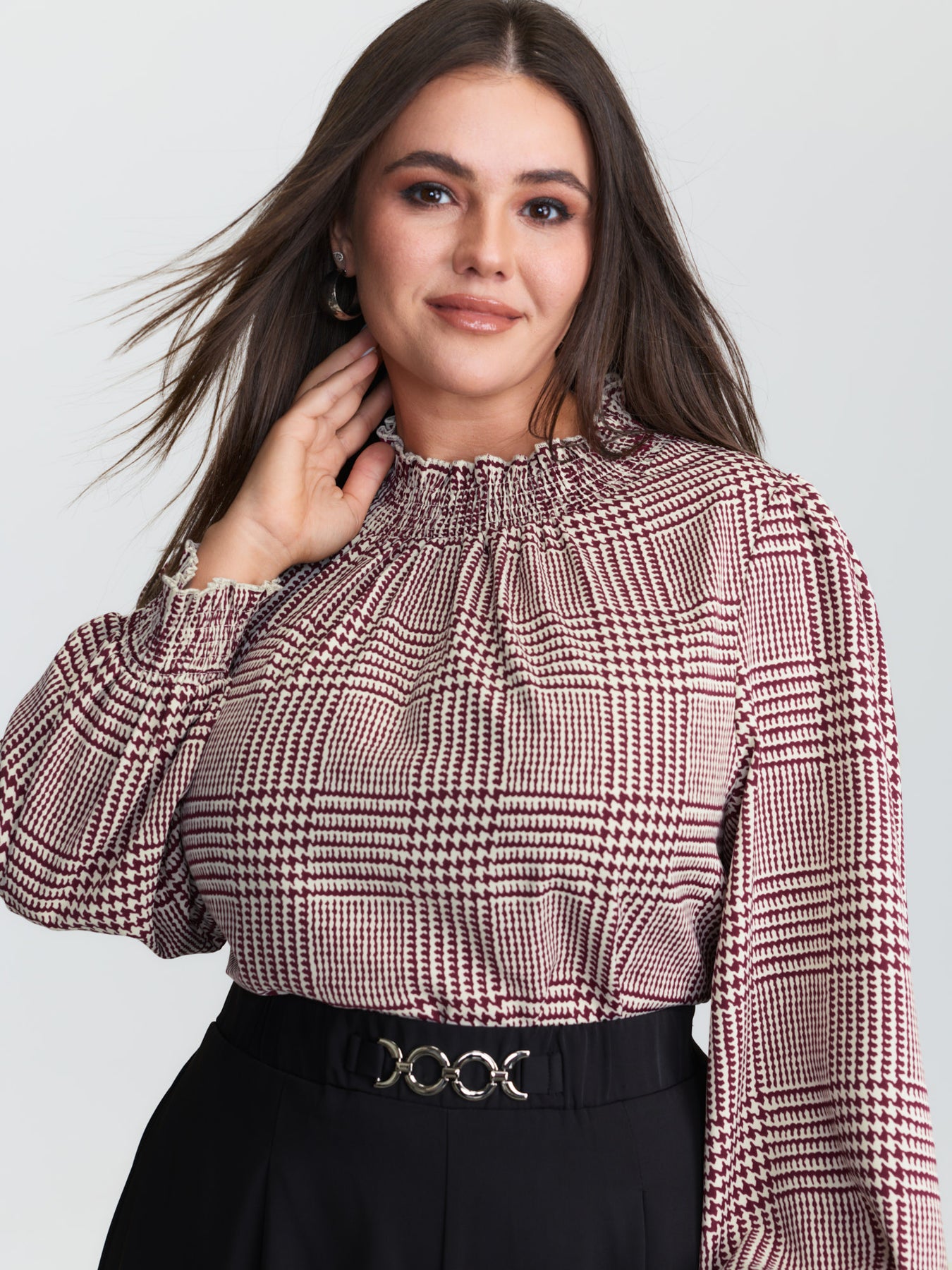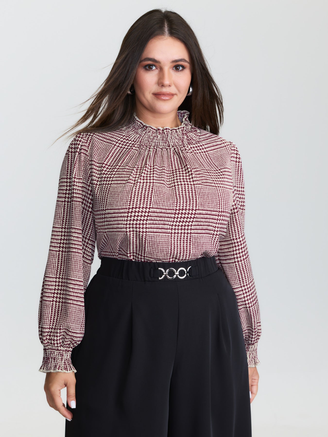 Houndstooth Pattern Ruffled Collar Blouse