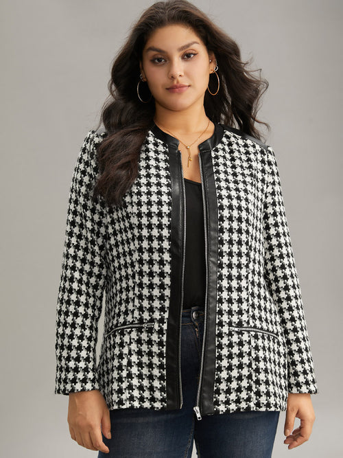 Houndstooth PU Leather Patchwork Tweed Zipper Blazer