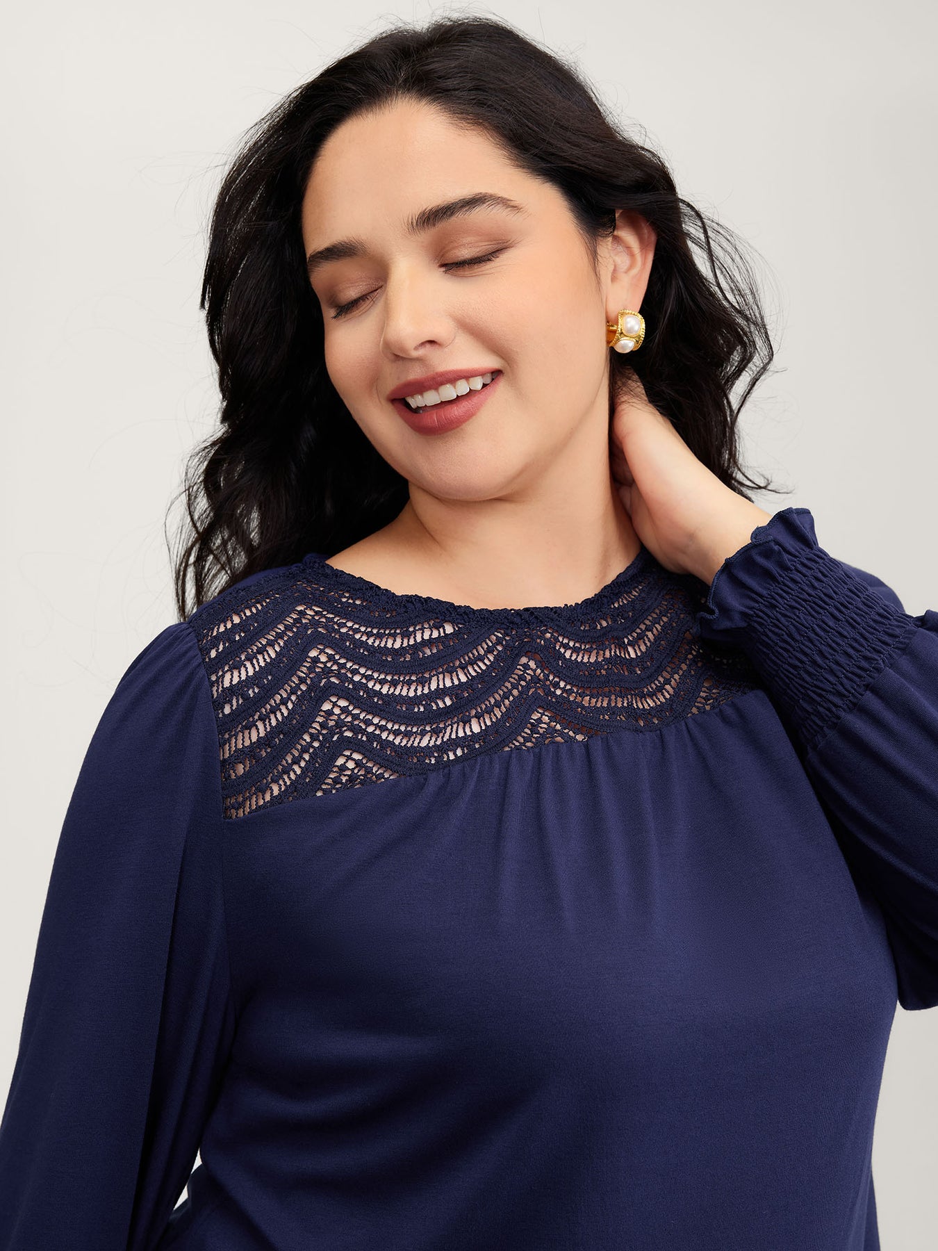 Lace Sheer Neckline Balloon Sleeve Knit Top