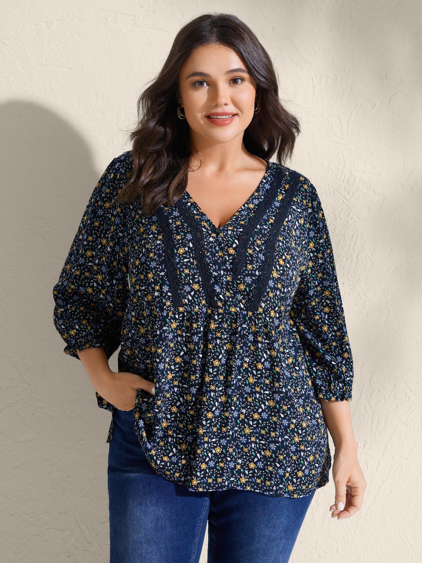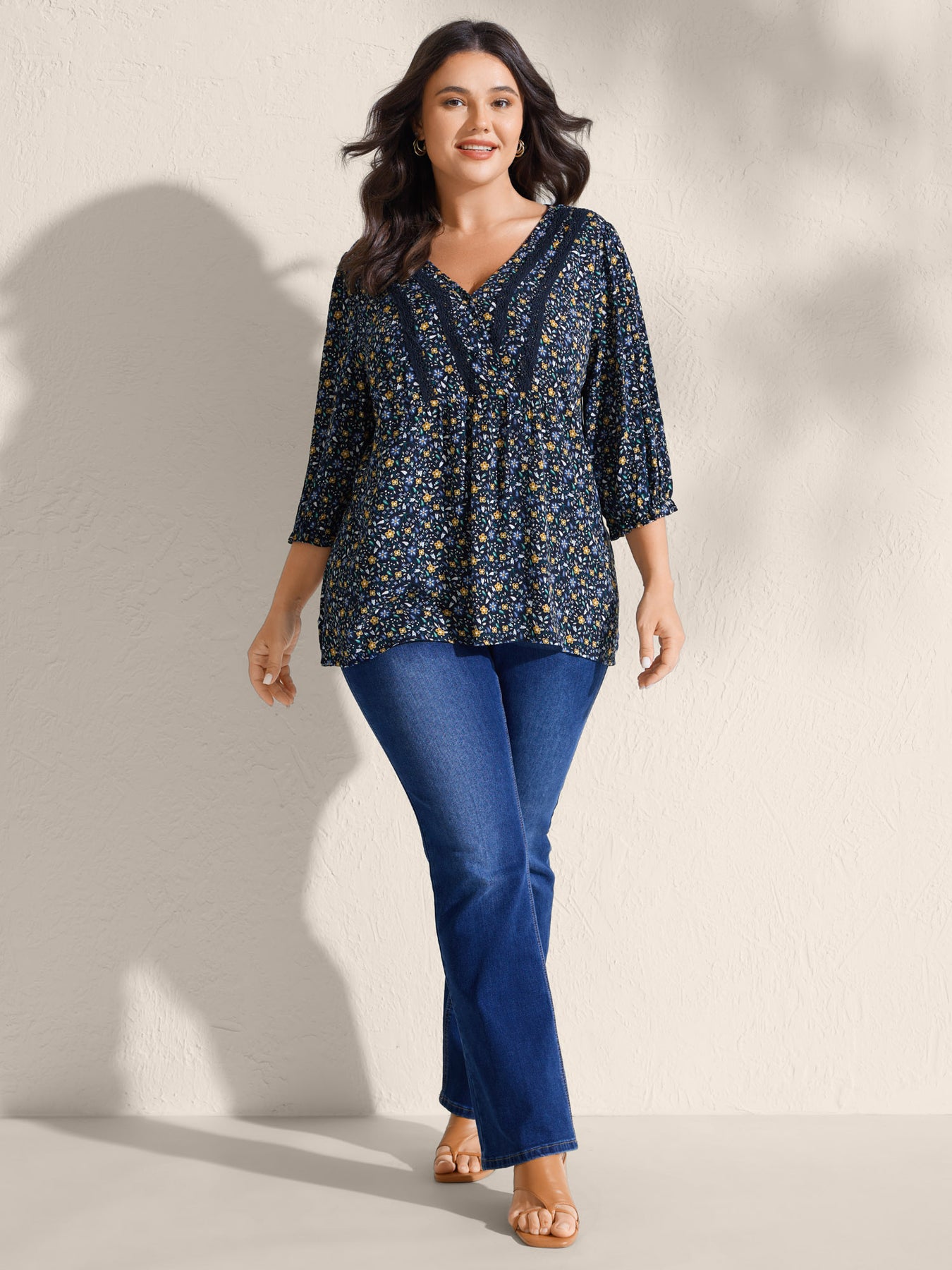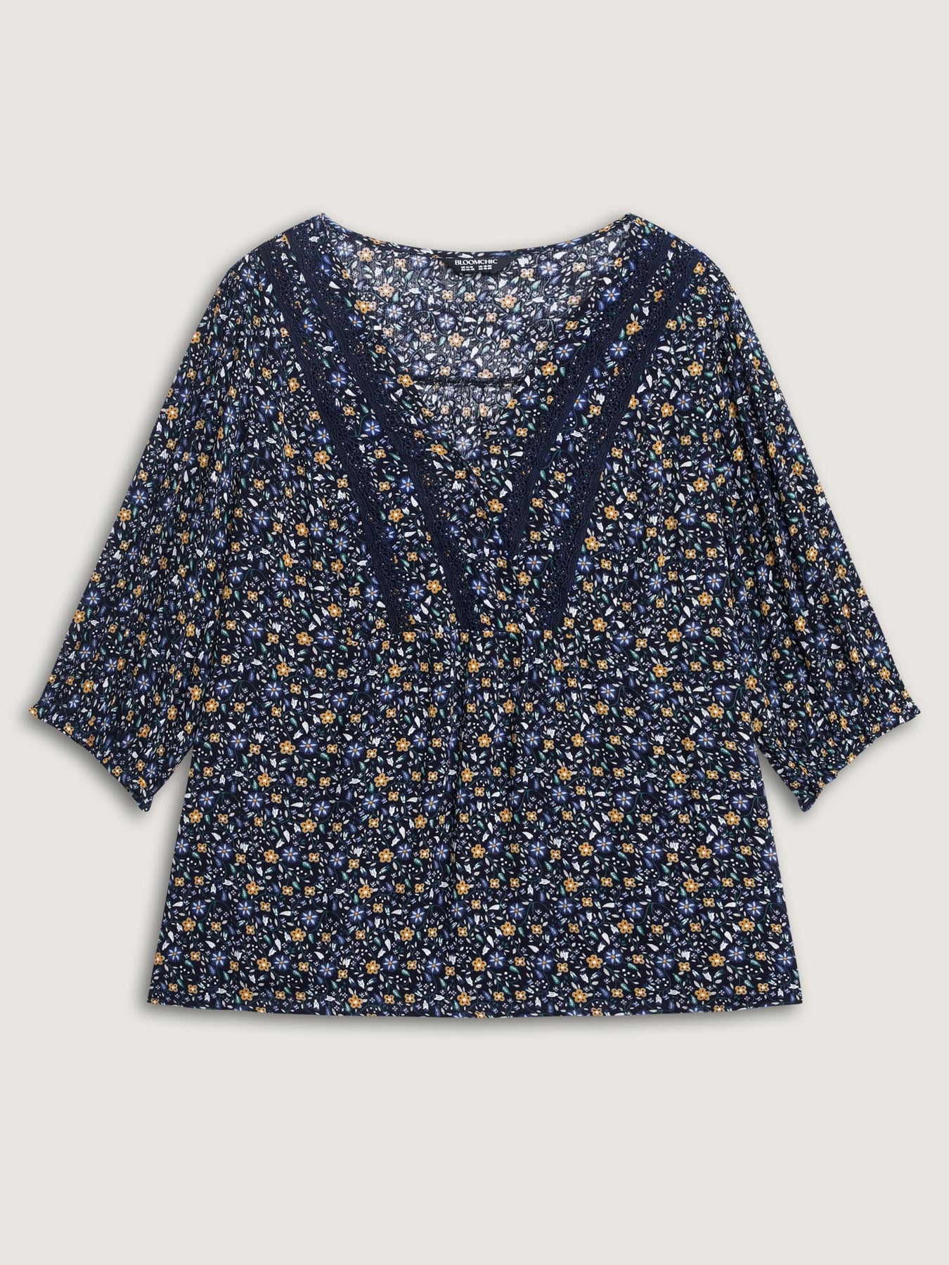 Supersoft Lace Trim Floral Print V-Neck Blouse