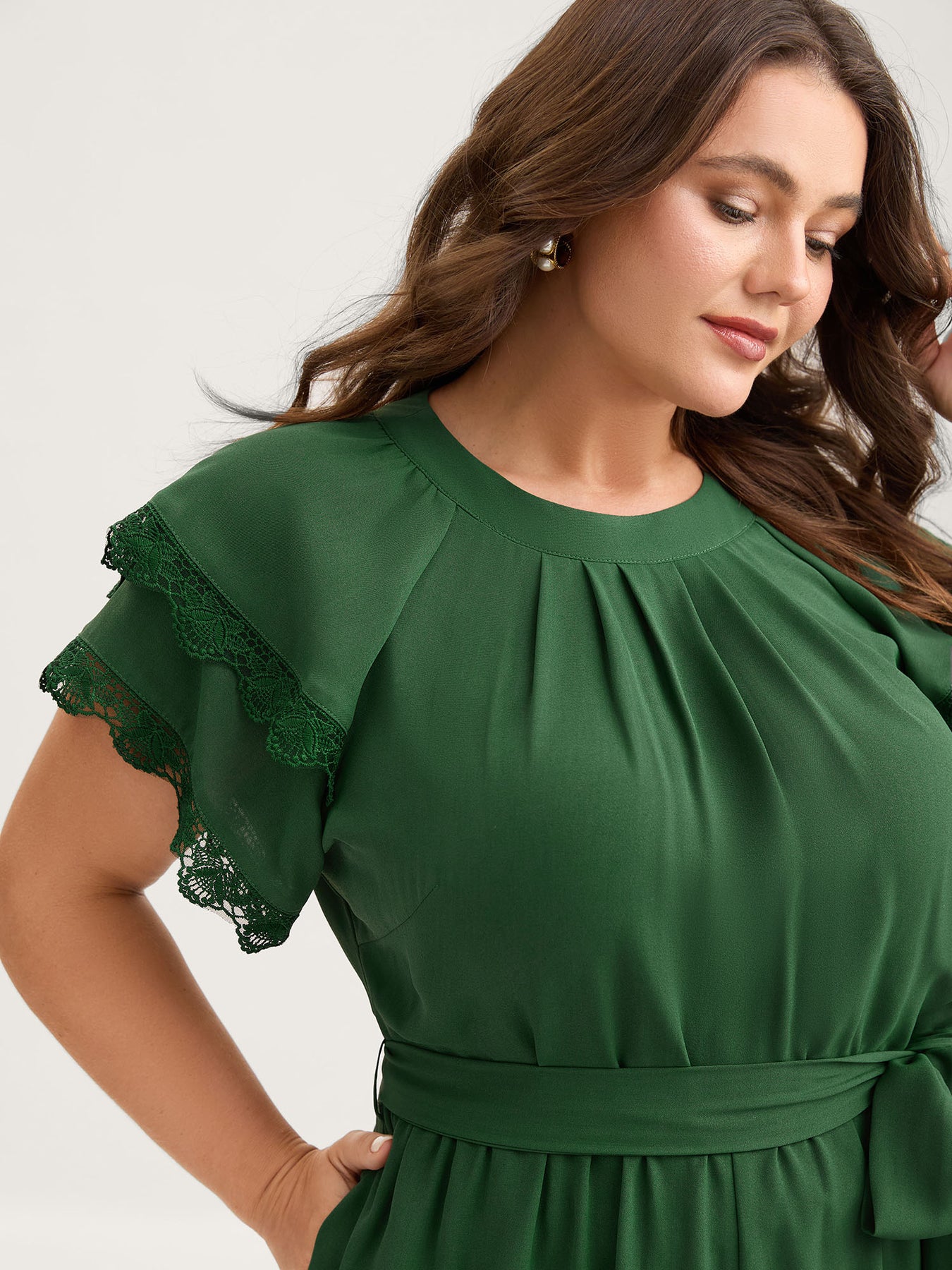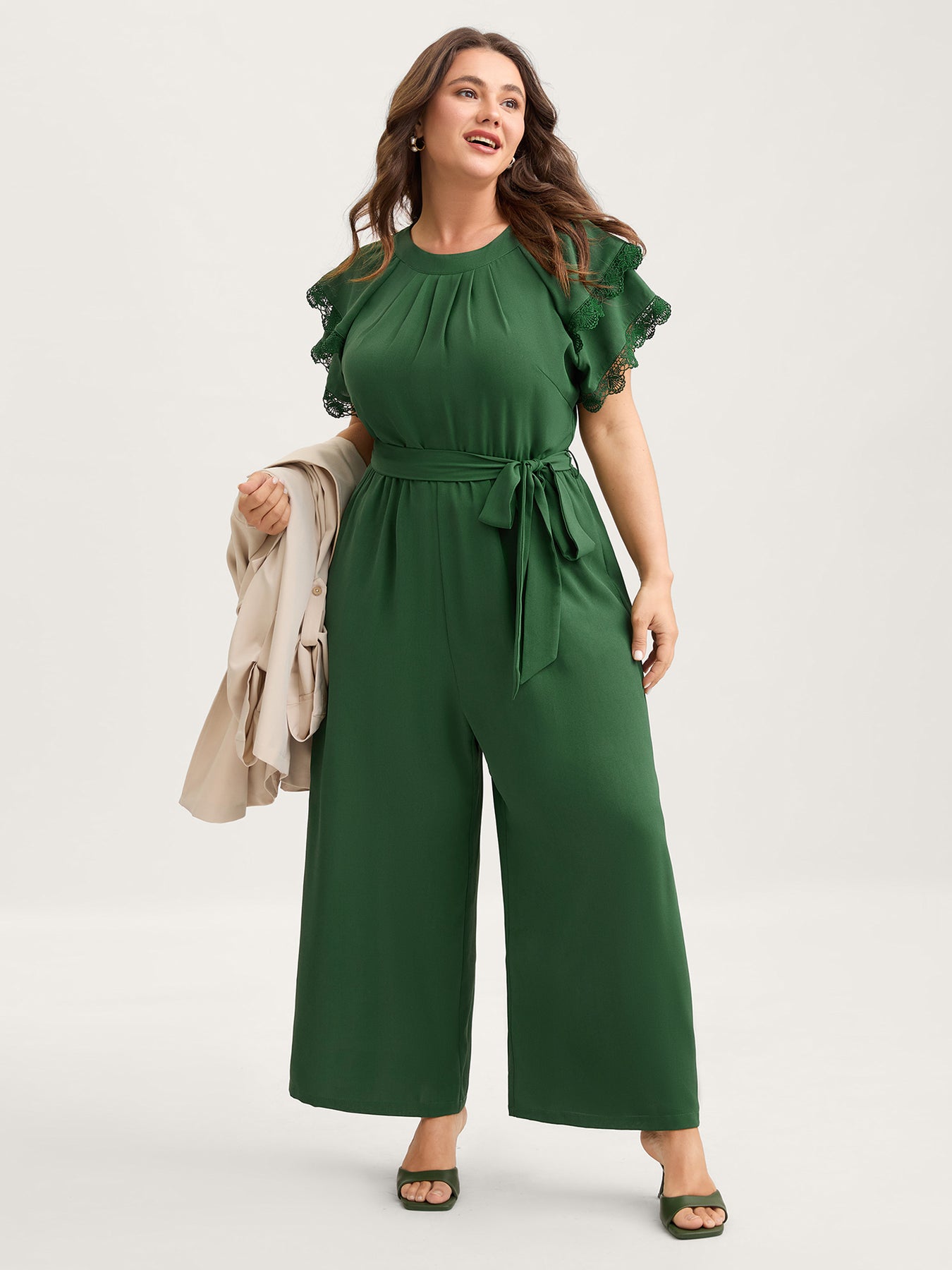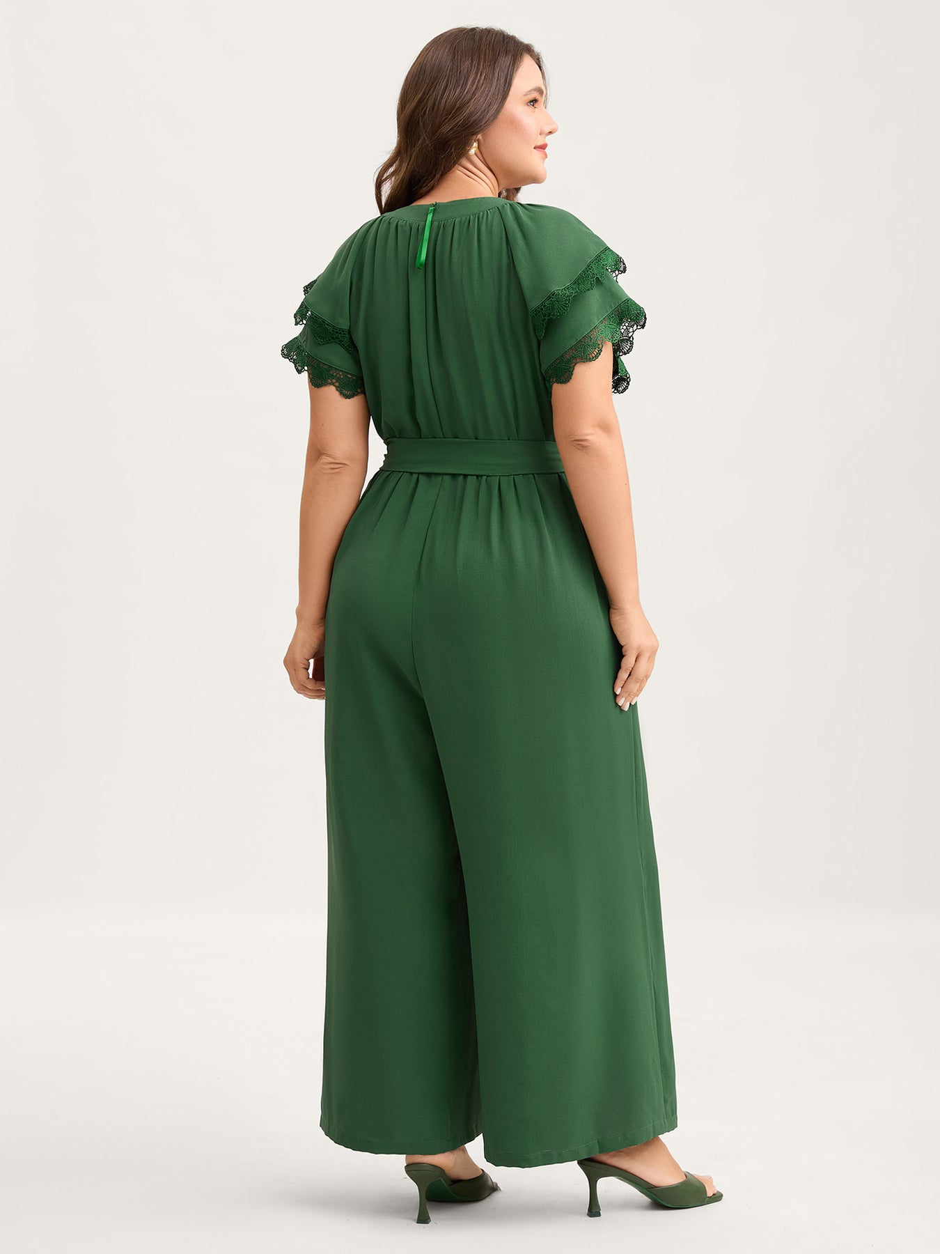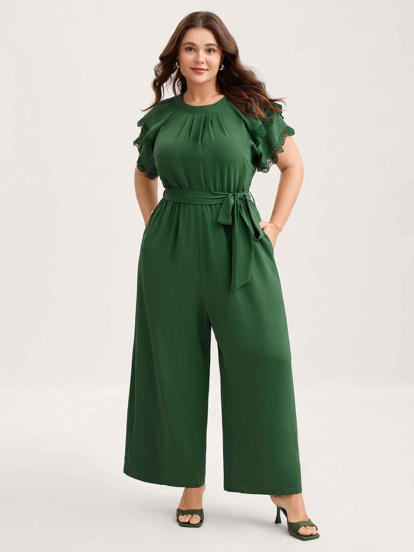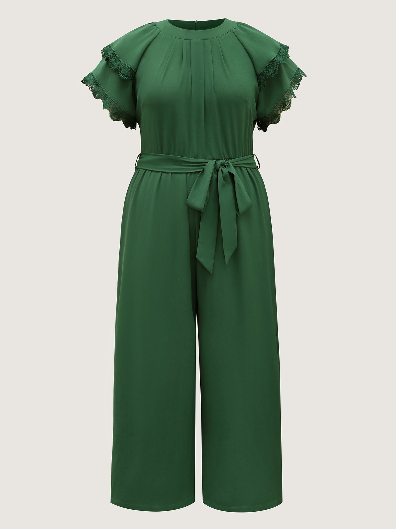Layered Lace Sleeve Belted Solid Jumpsuit