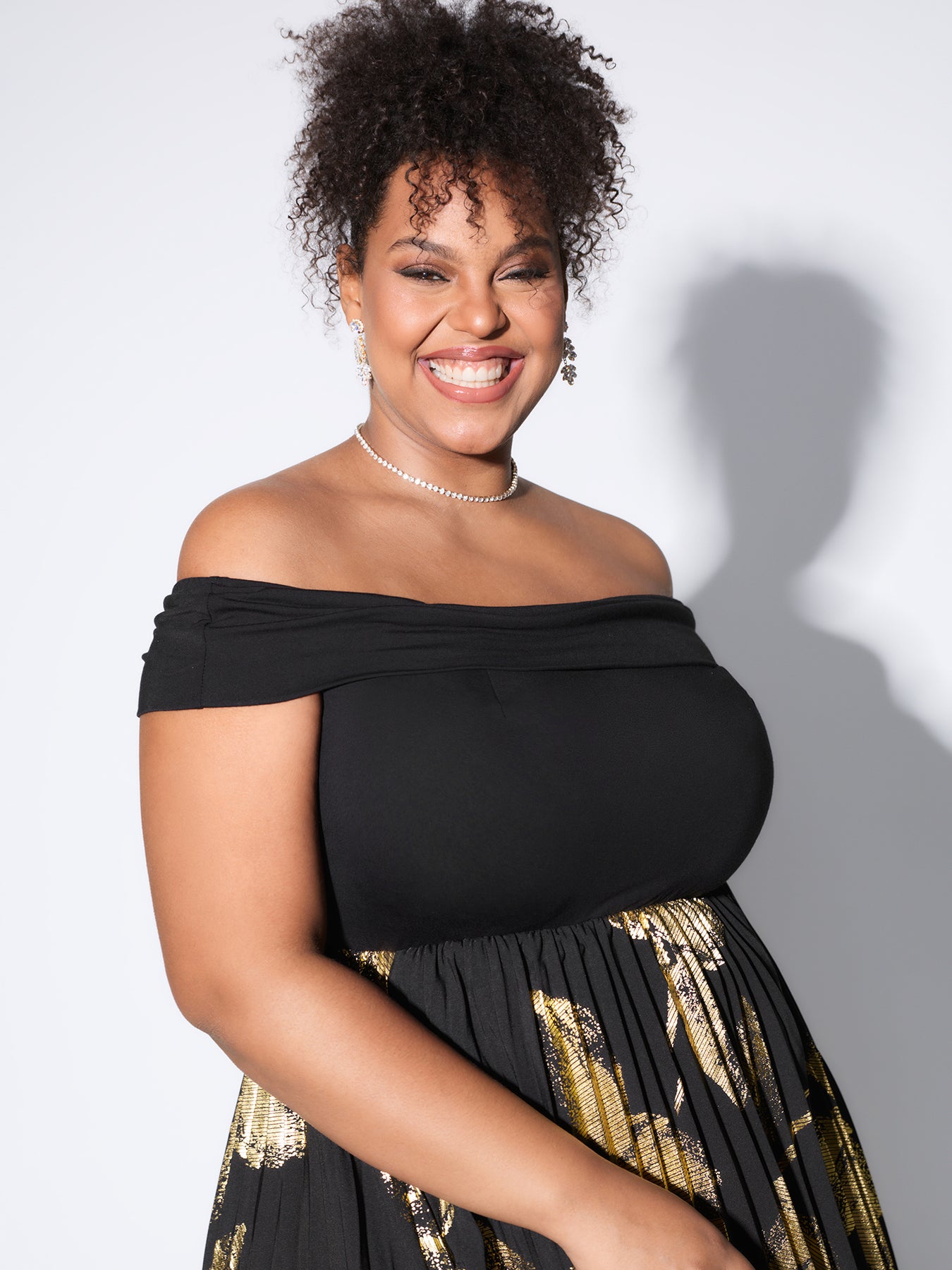 Leaf Print Pleated Off-Shoulder Midi Dress