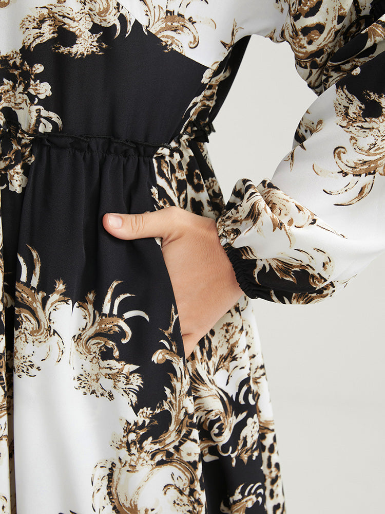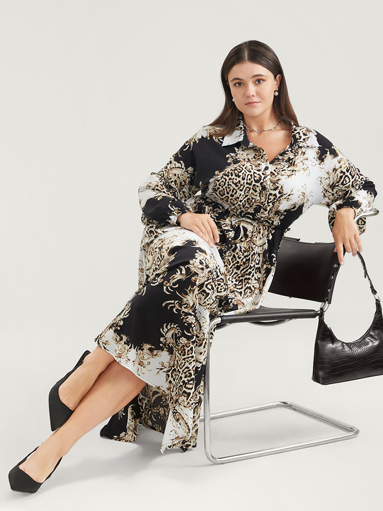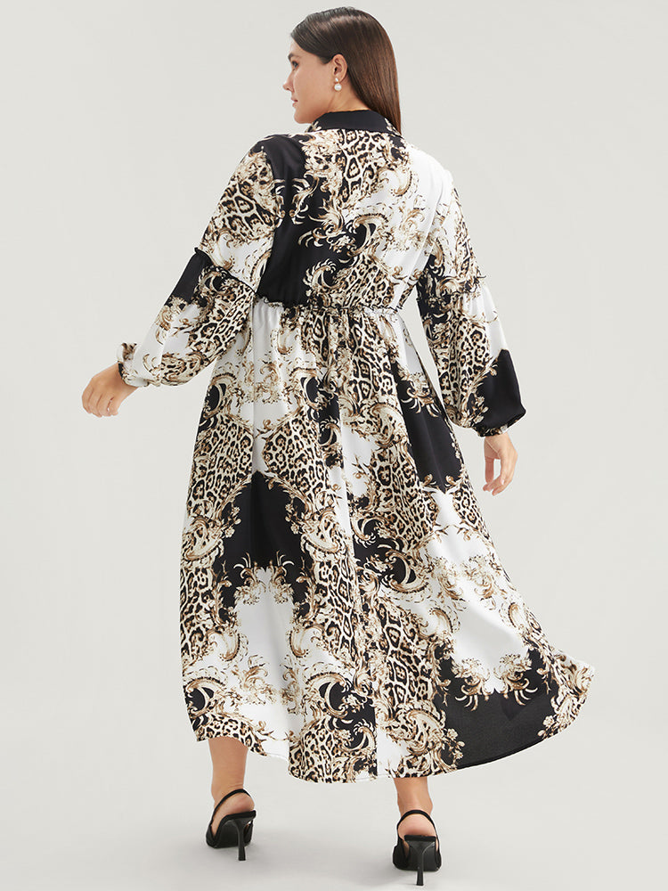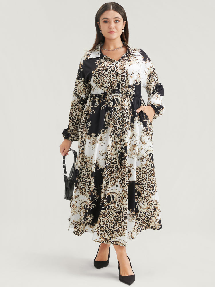 Leopard Pocket Button Detail Lantern Sleeve Split Dress