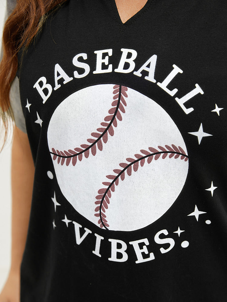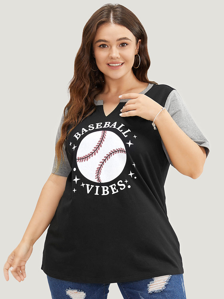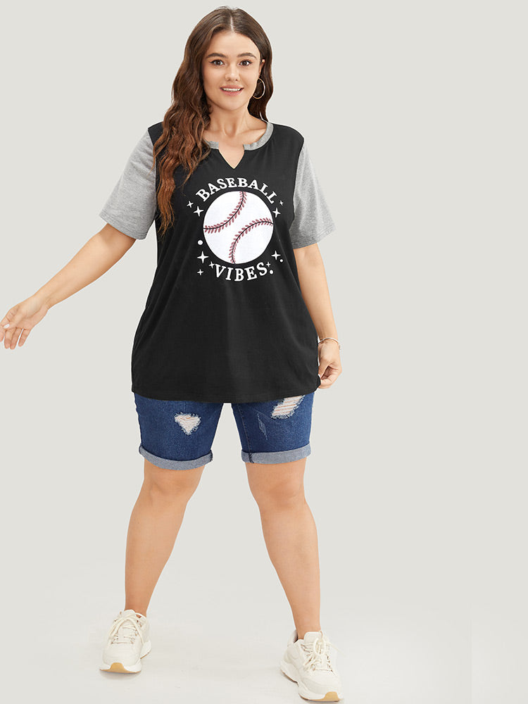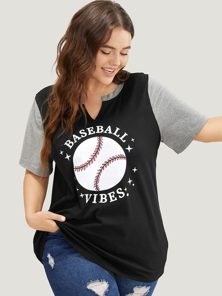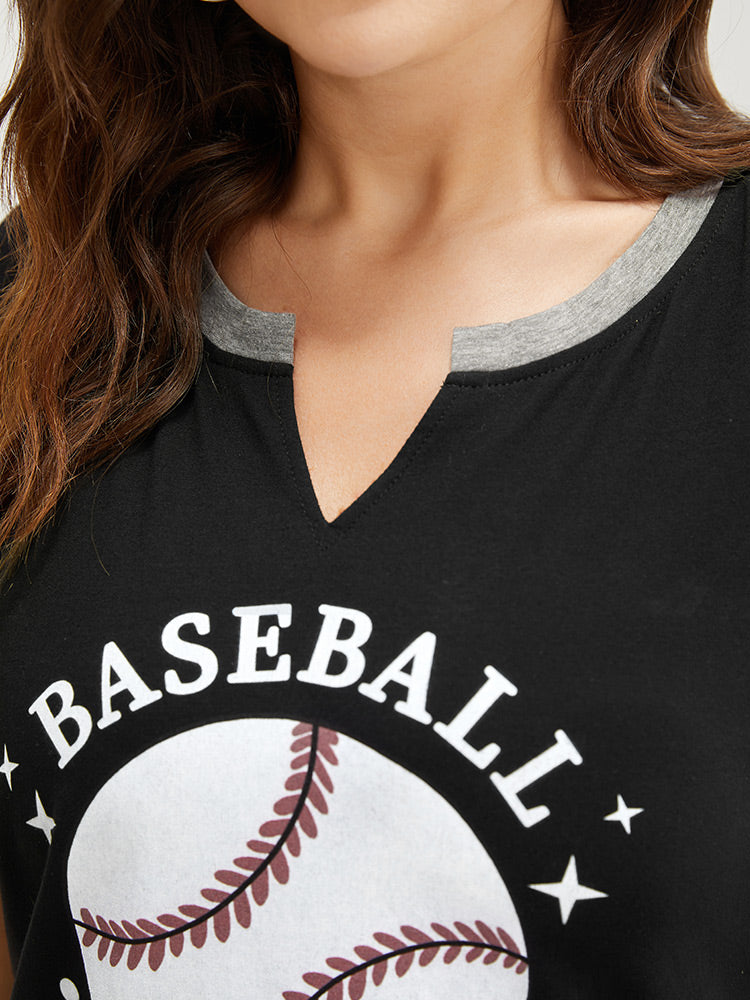 Letter & Leaf Print Contrast Notched Neck T-shirt