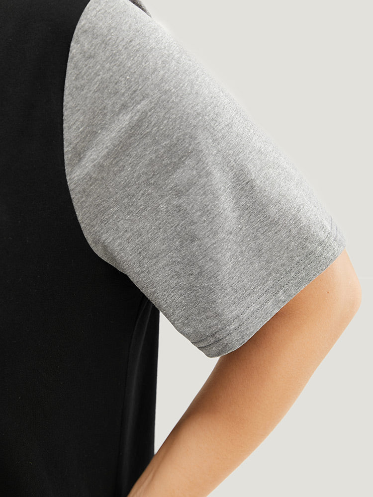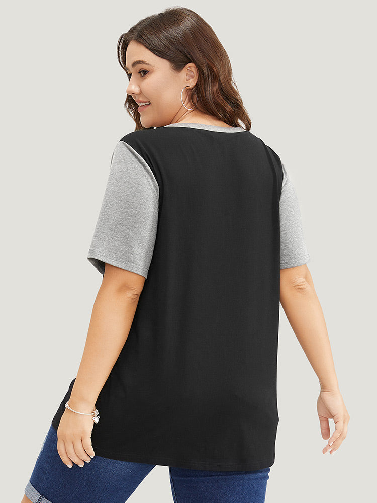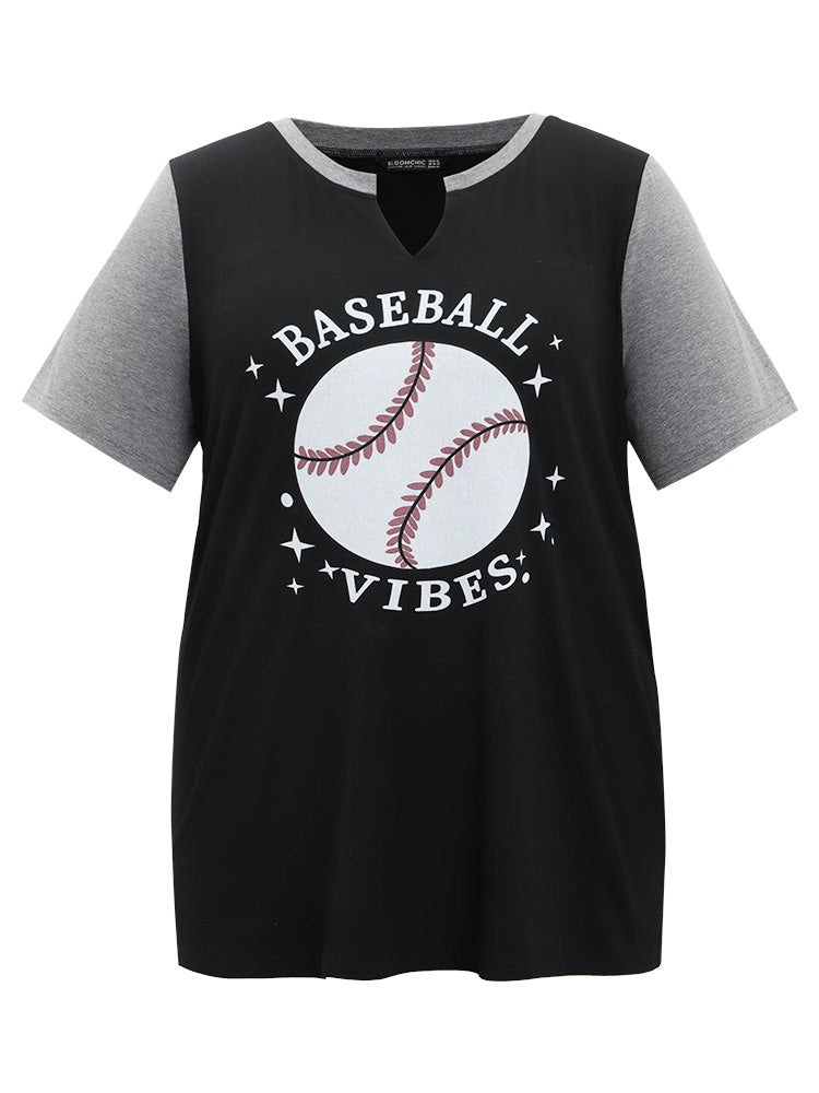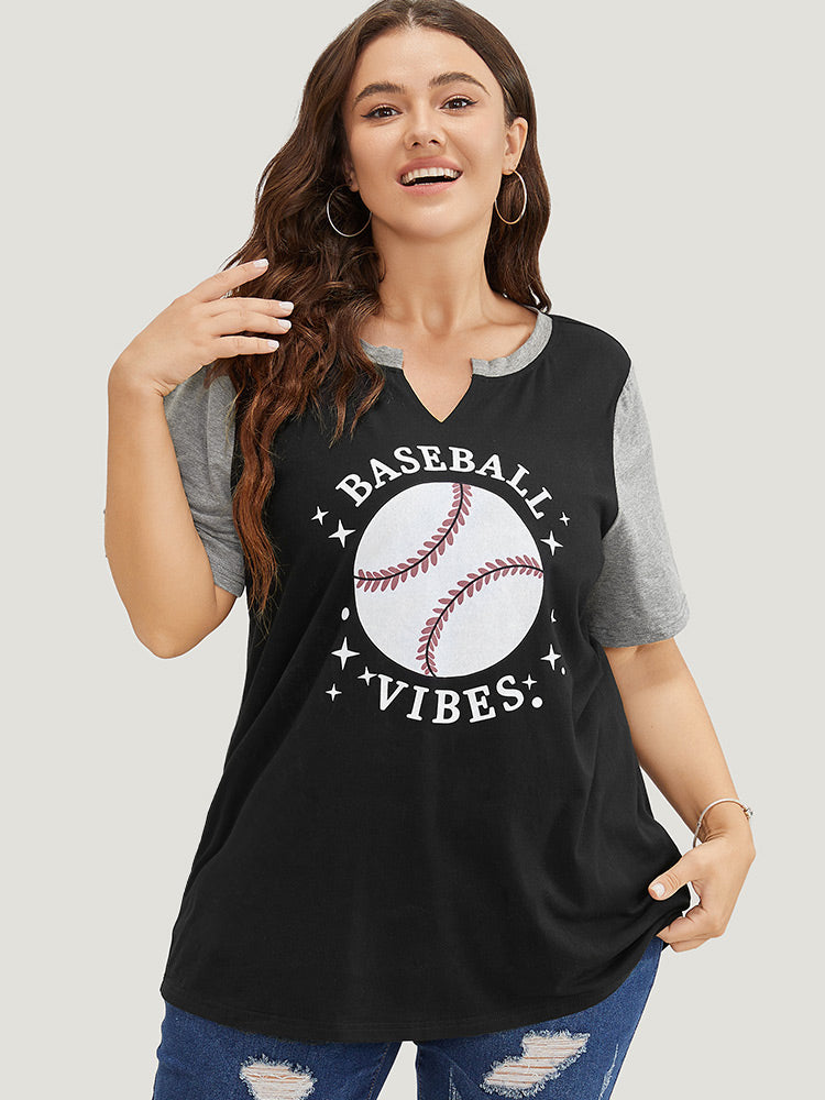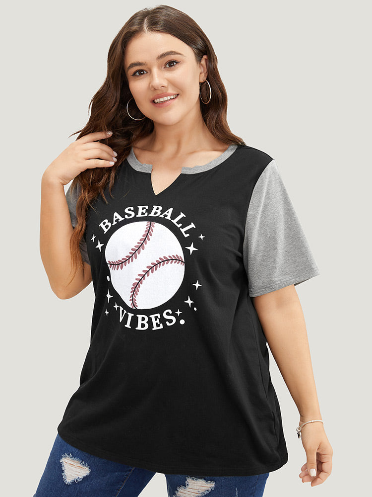 Letter & Leaf Print Contrast Notched Neck T-shirt